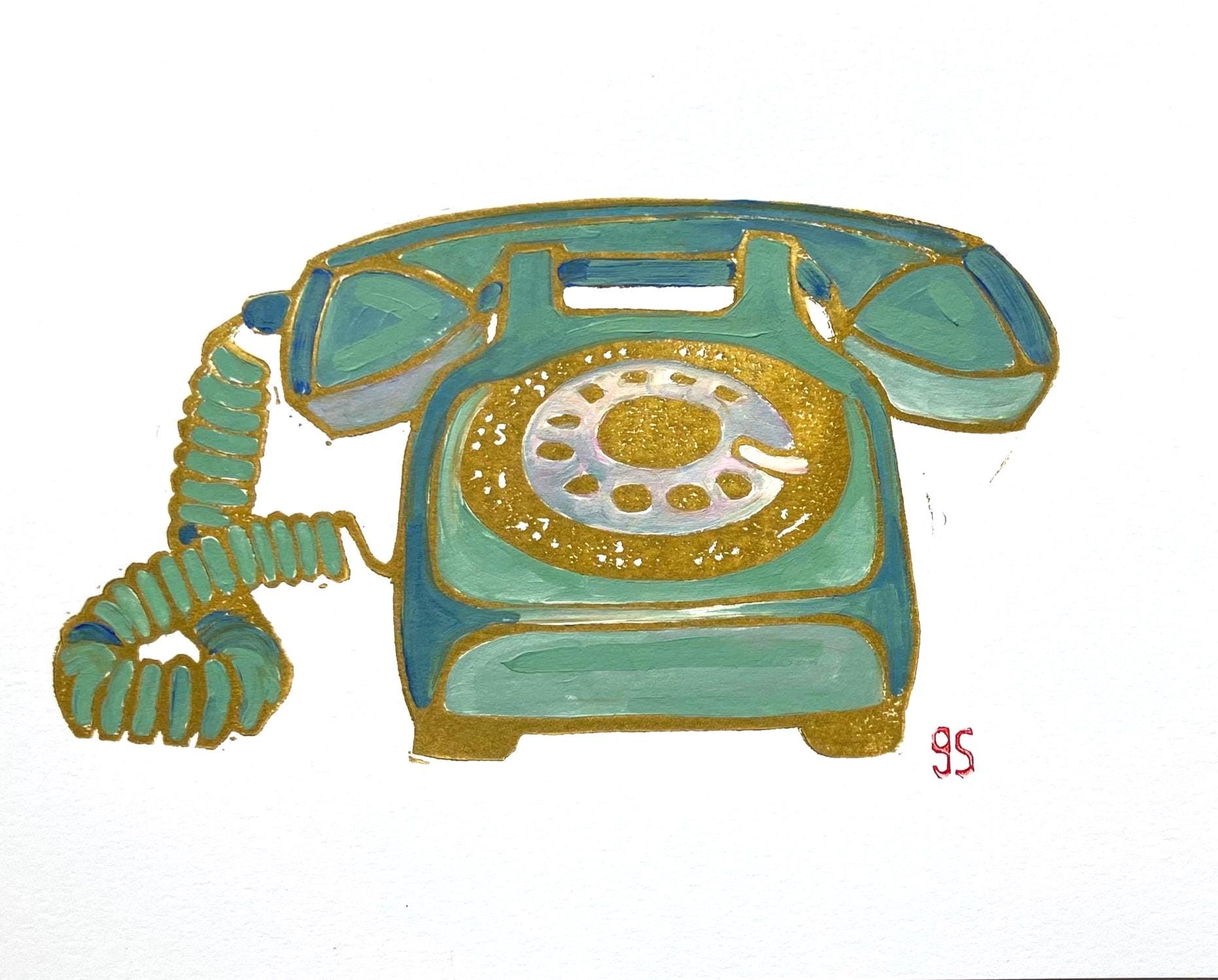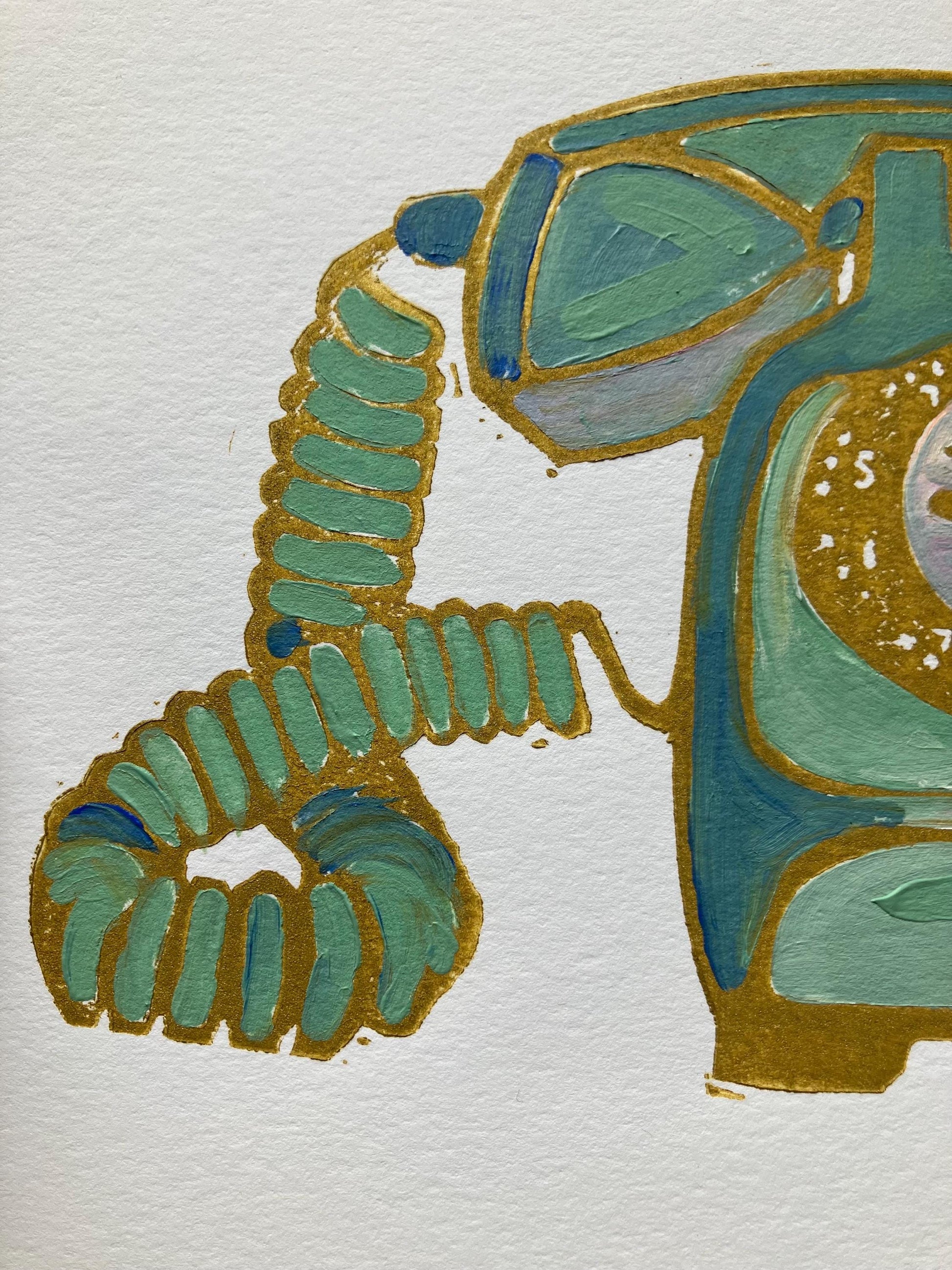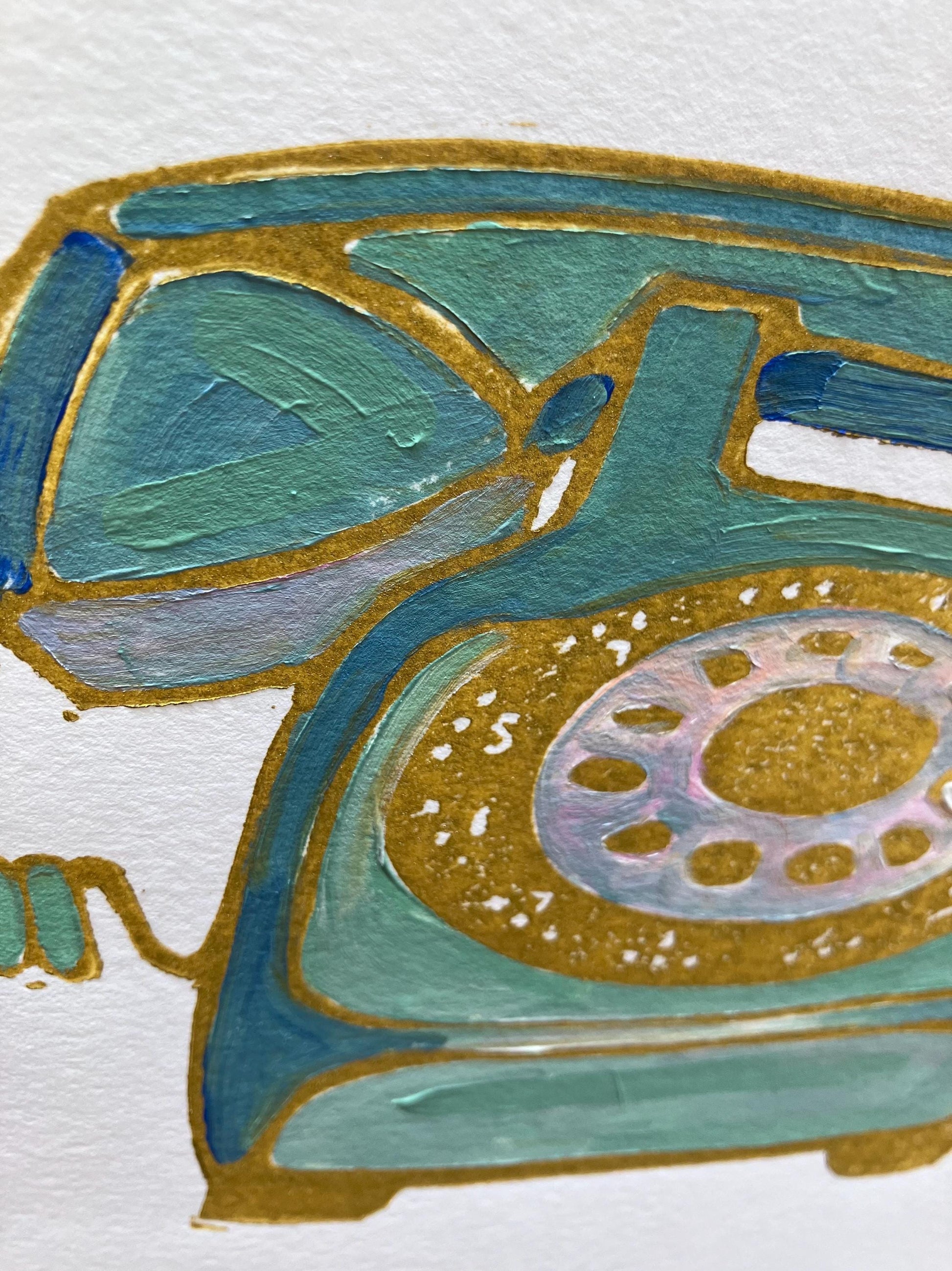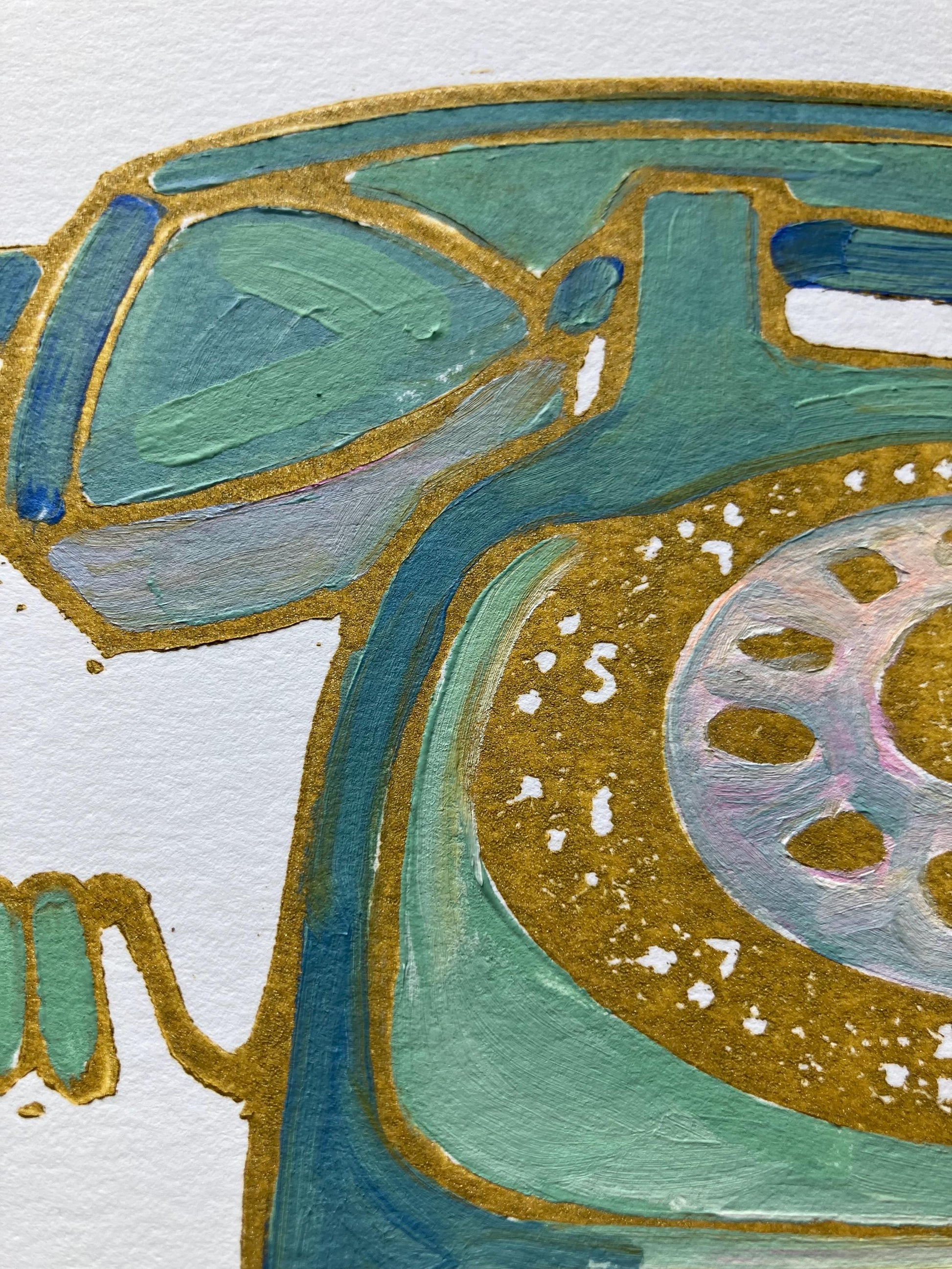 Mixed media acrylic painting of a vintage rotary phone in shimmery gold, turquoise, and teal.