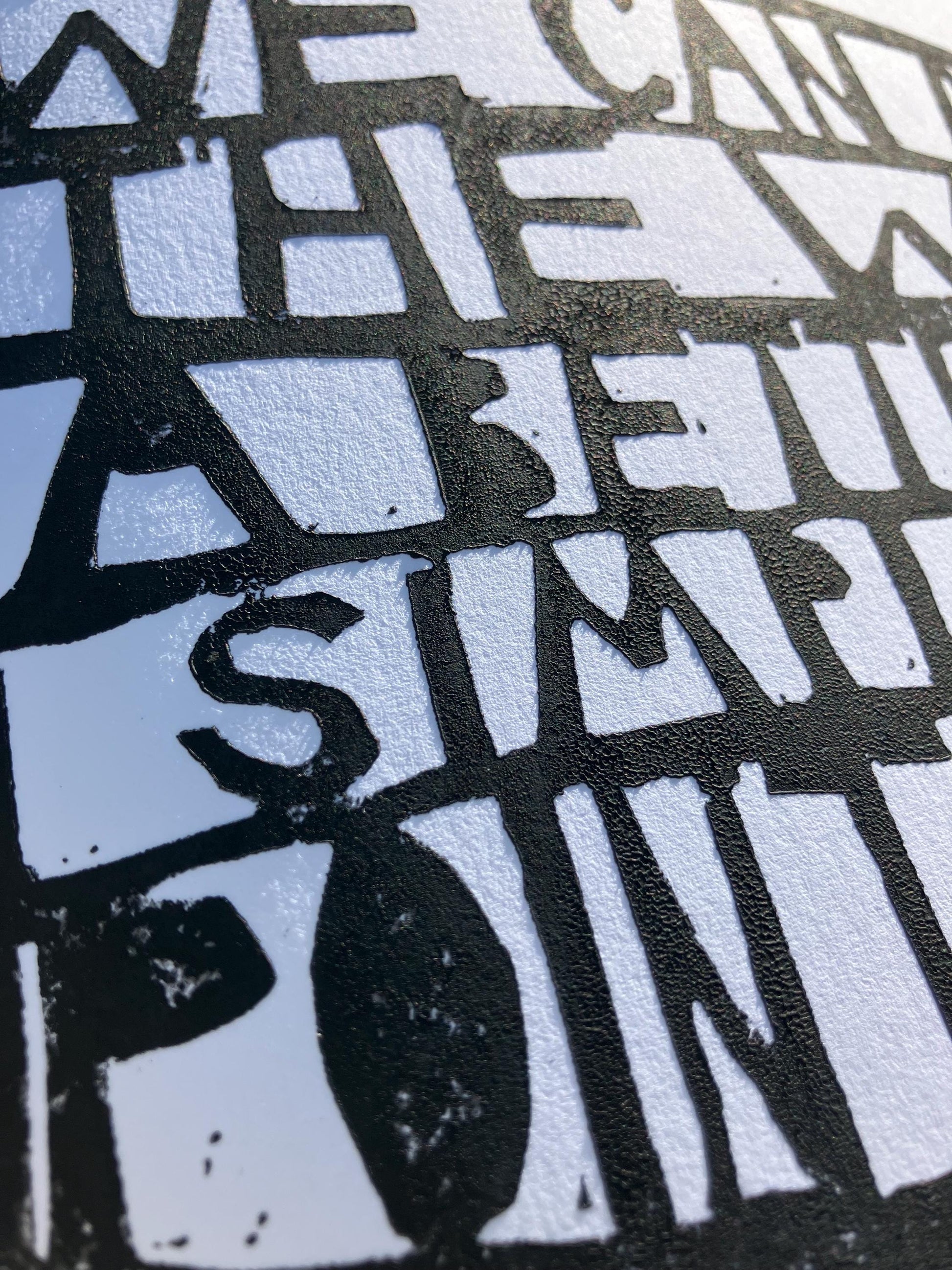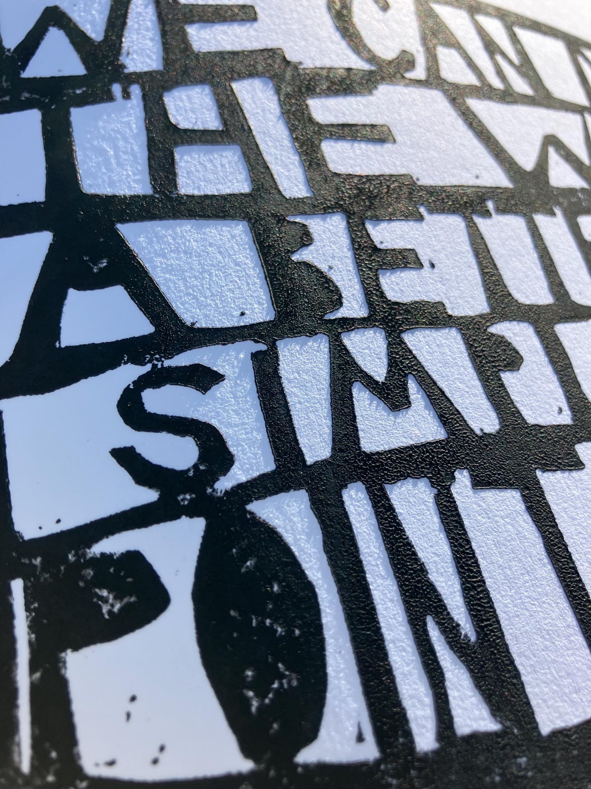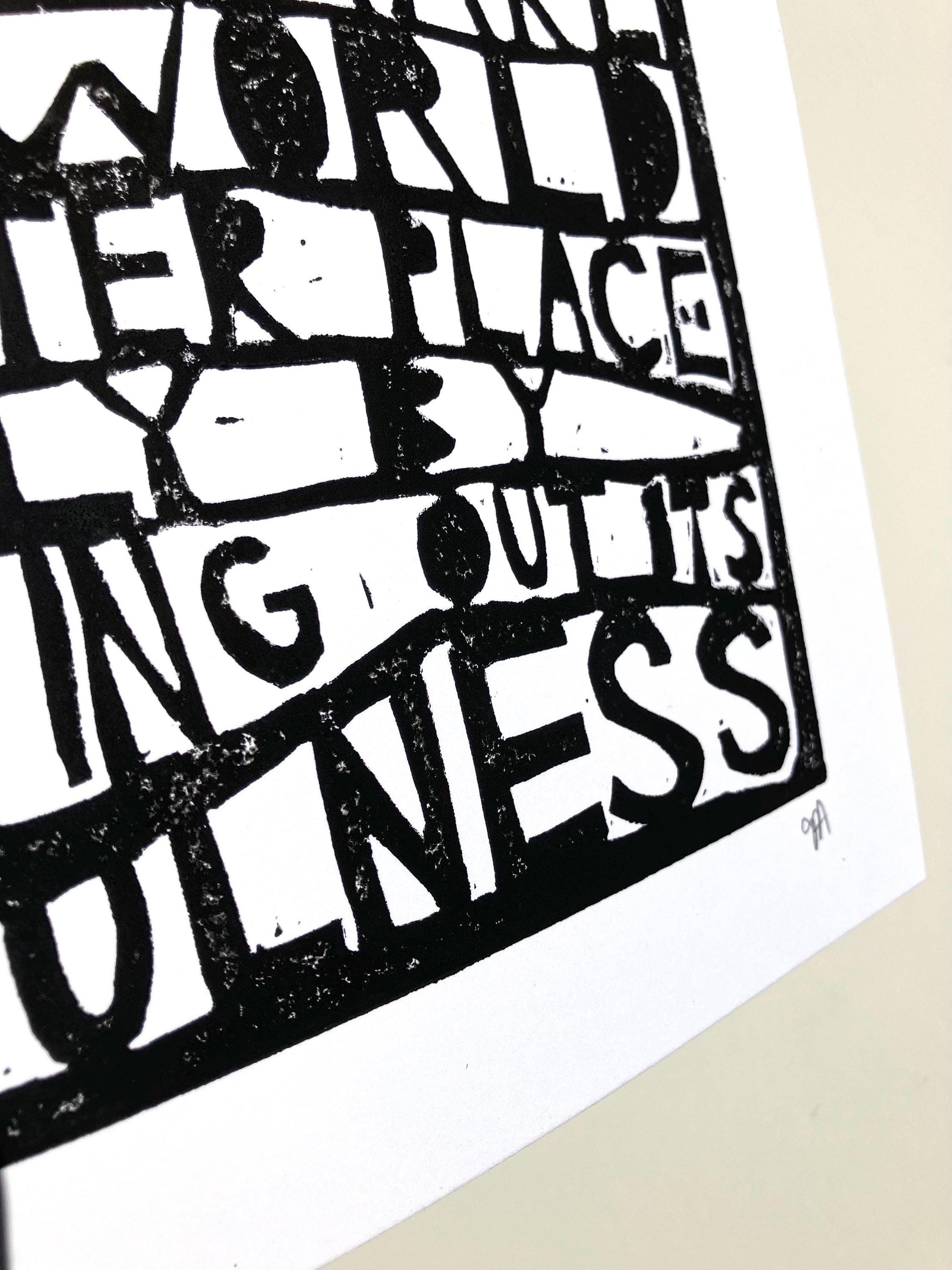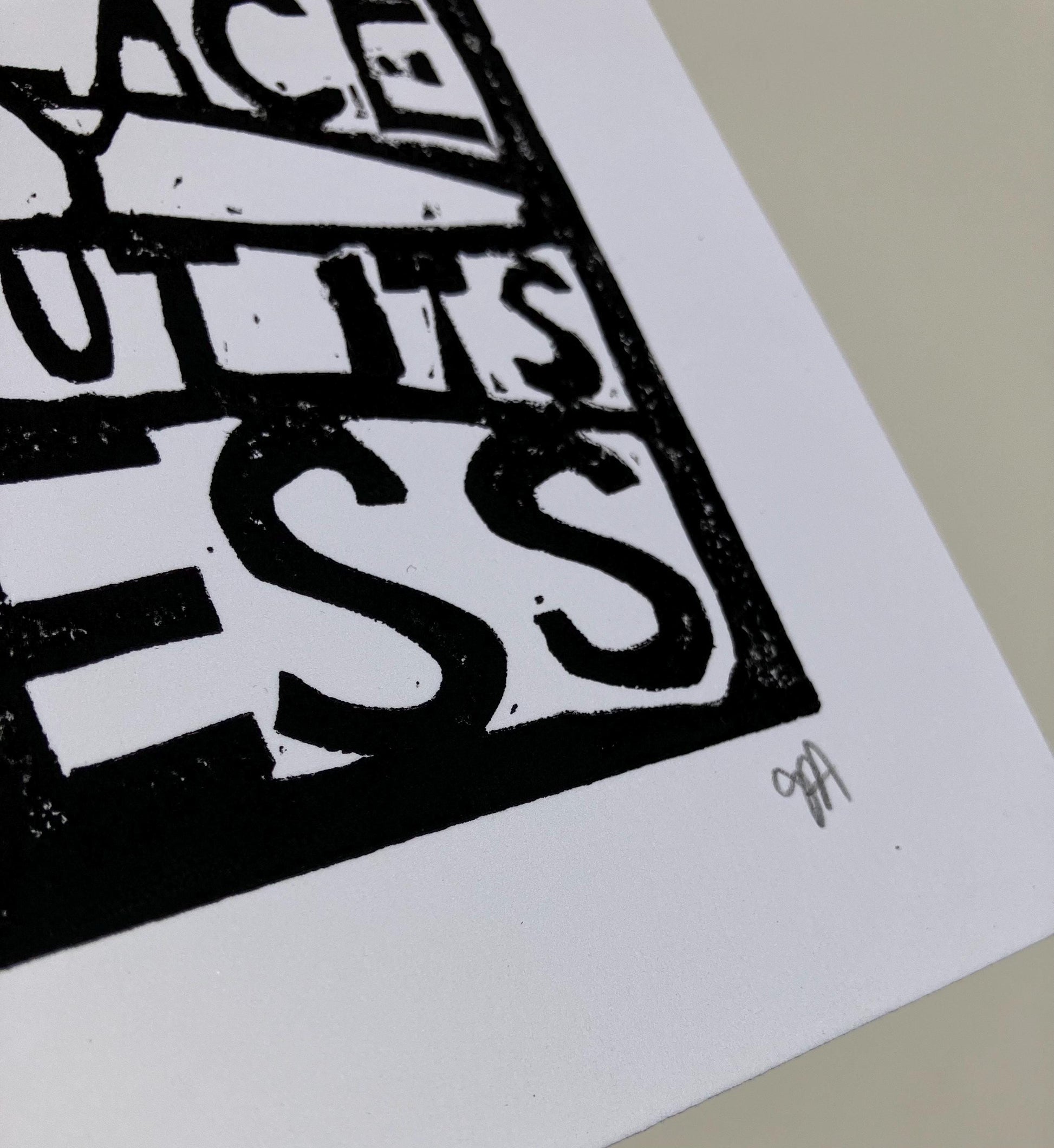 This original, hand-pulled linocut print was pressed in black on cotton paper. It was intentionally done in a cut-paper style. A linoleum block is carved by hand, inked, then each piece is printed individually. Due to the printing process, there will be variations from print to print. All materials are permanent and archival.