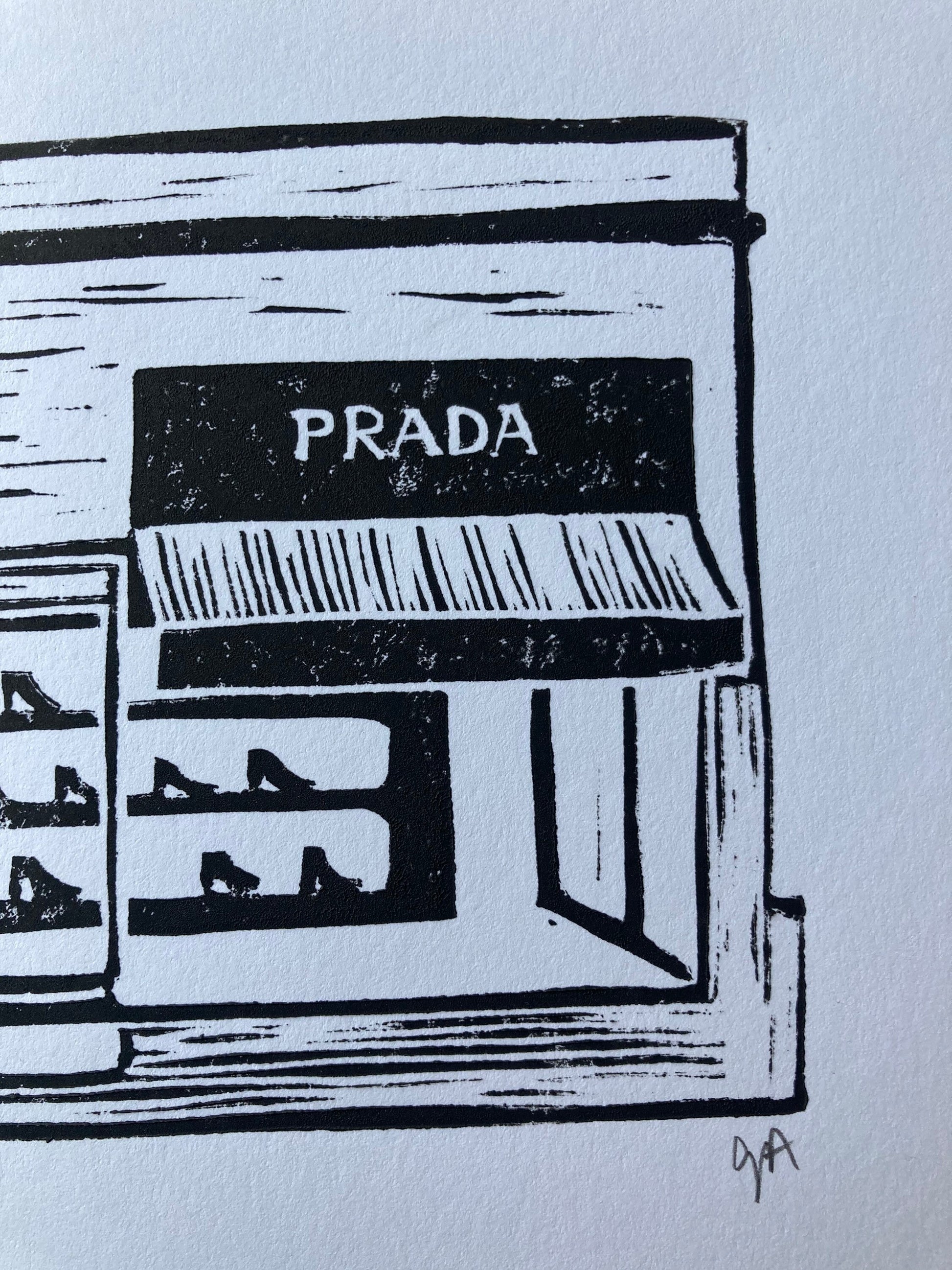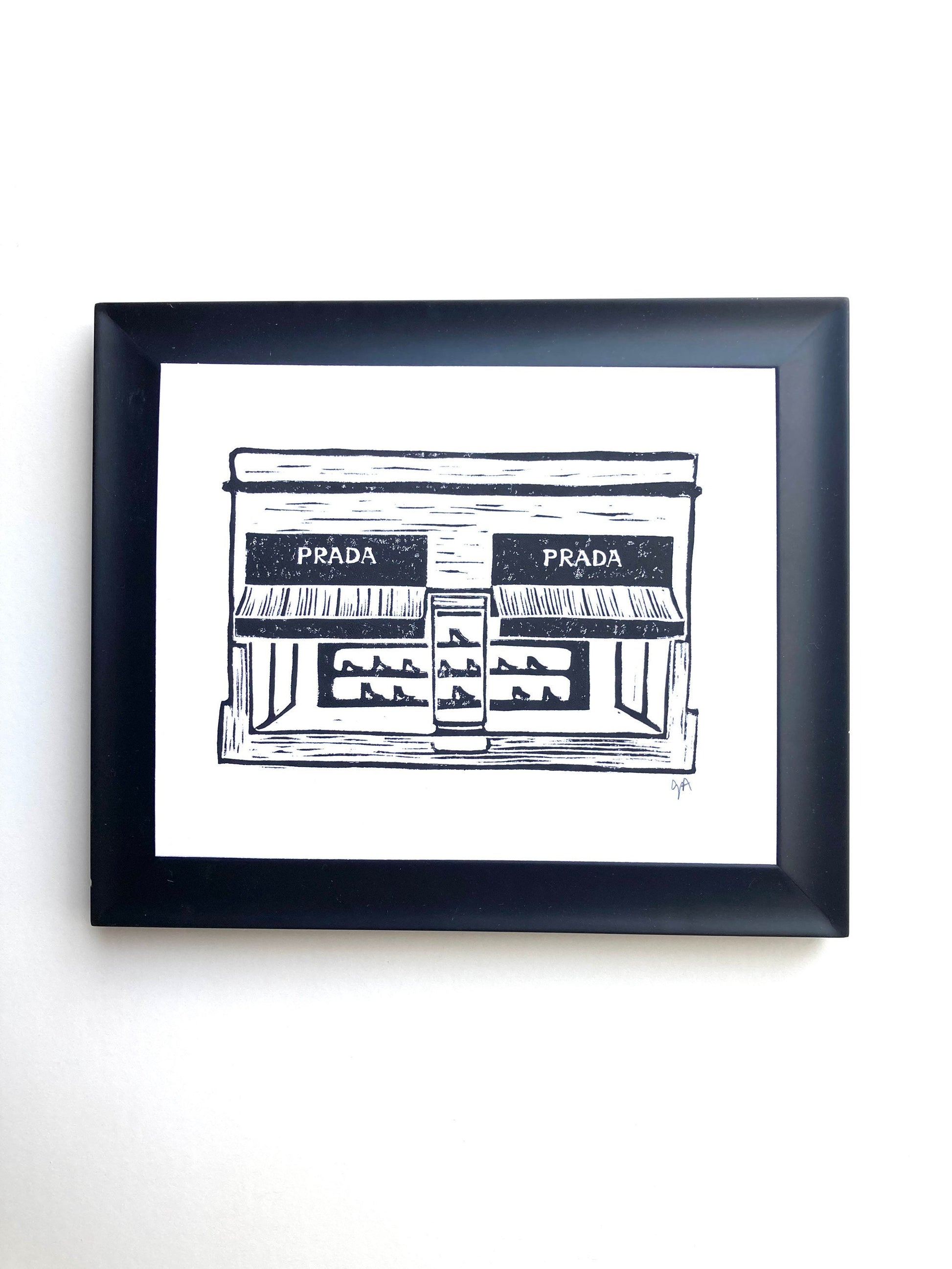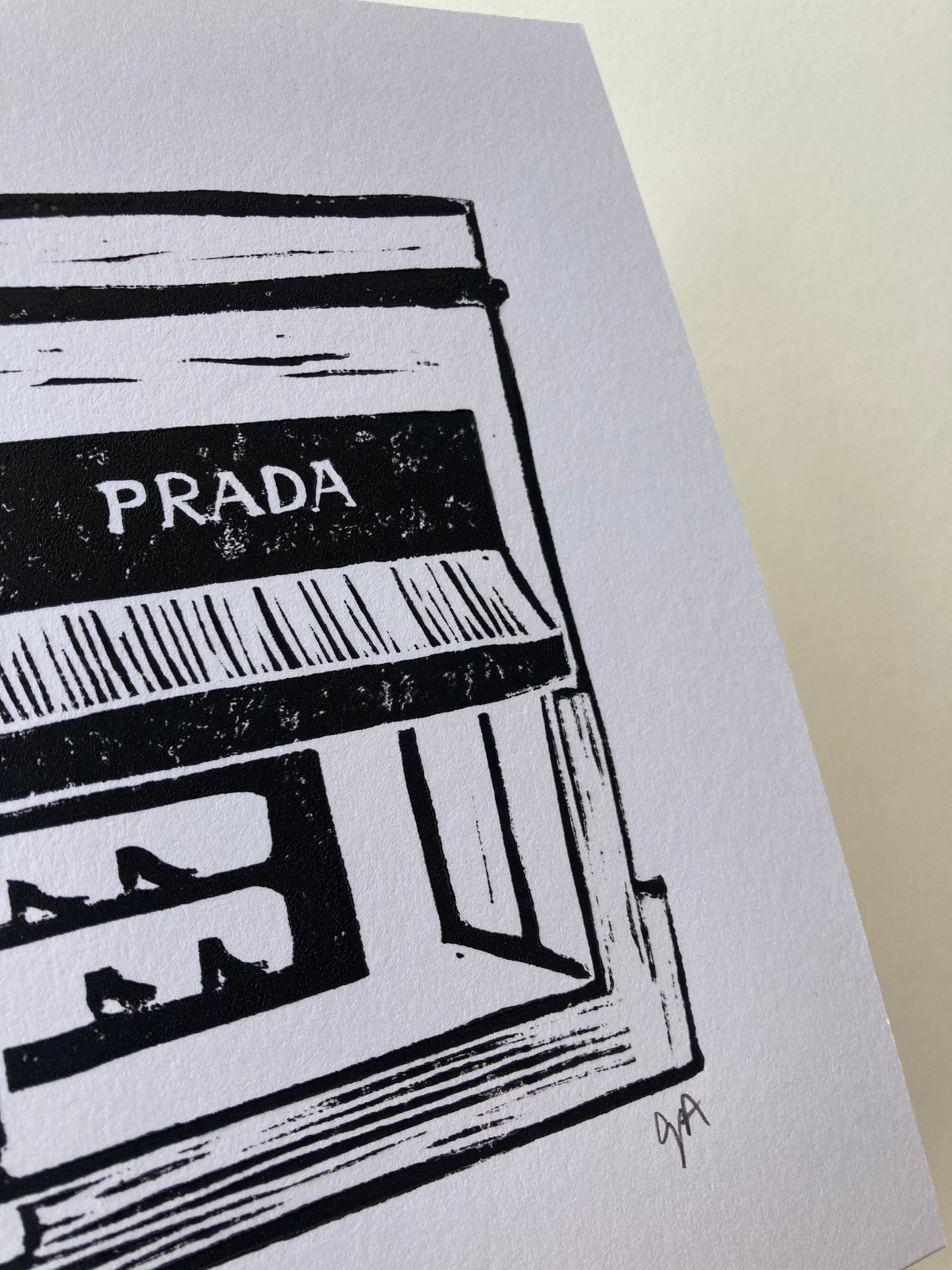 This linocut print of Marfa's infamous Prada store was pressed in black on beautiful 100% cotton Lettra letterpress paper. The linoleum block is cut by hand, inked, then printed individually. Due to the printing process (which is done entirely by hand), there will be variations from print to print giving you an original and unique piece of artwork! All materials are archival.