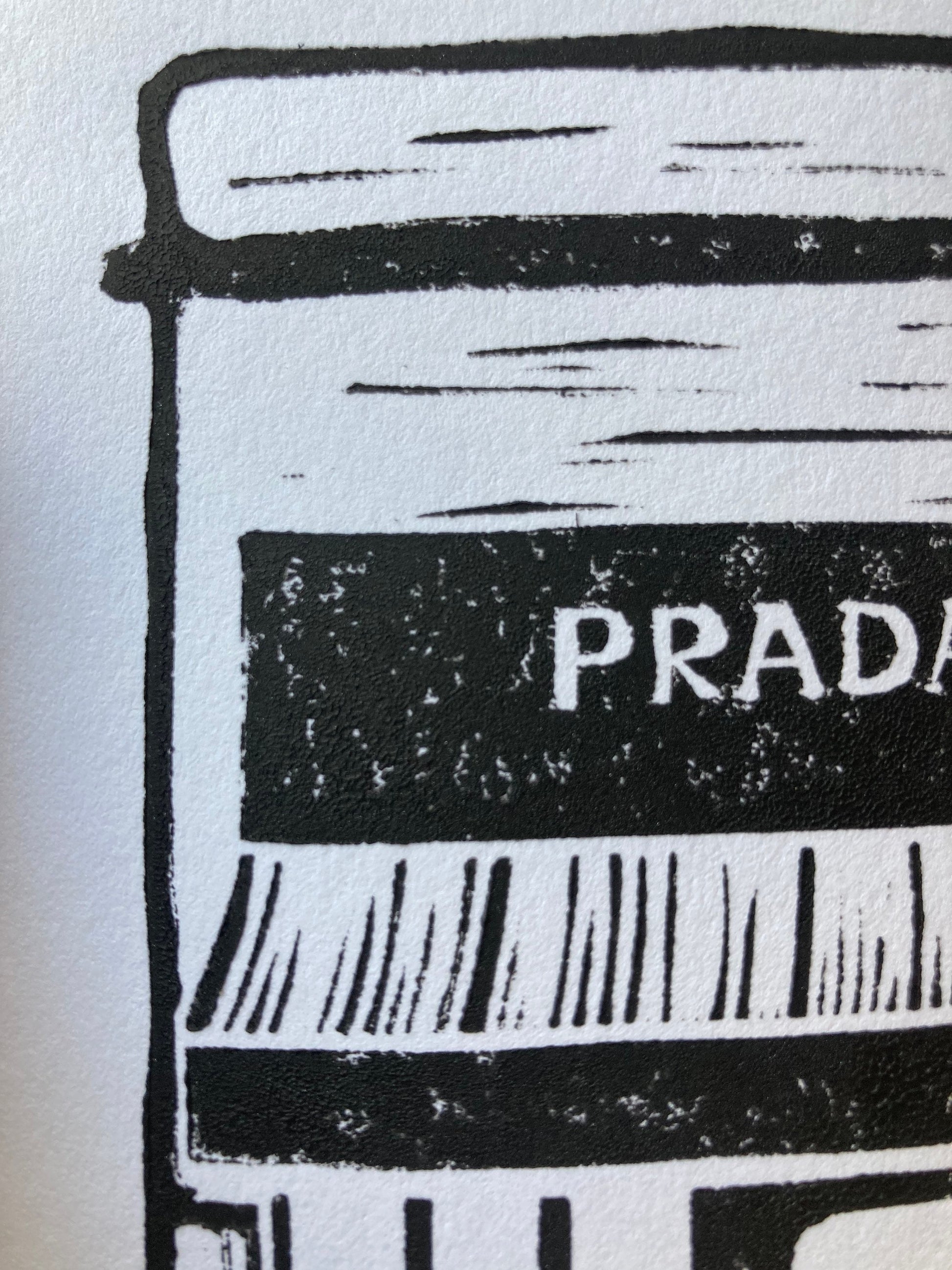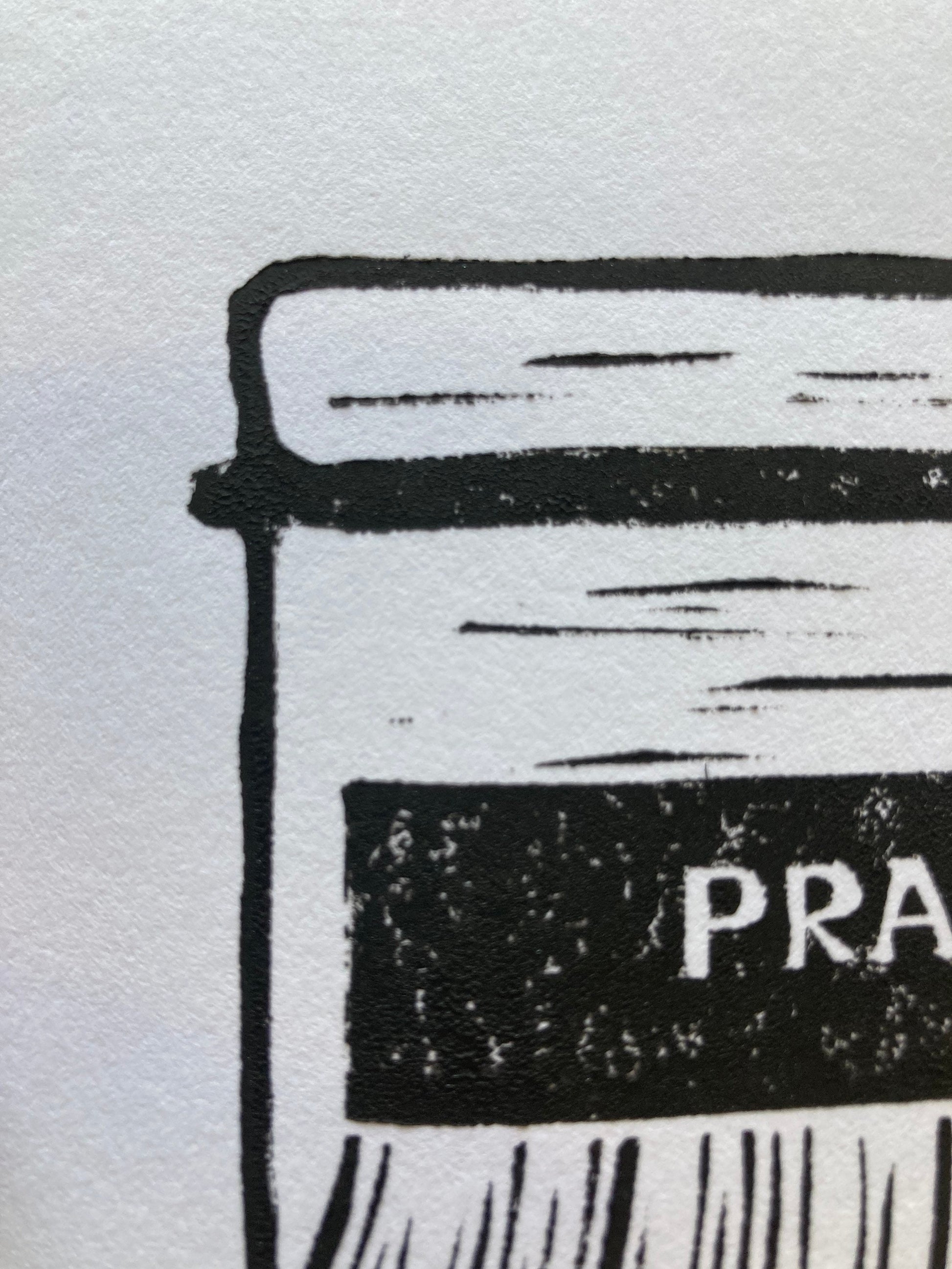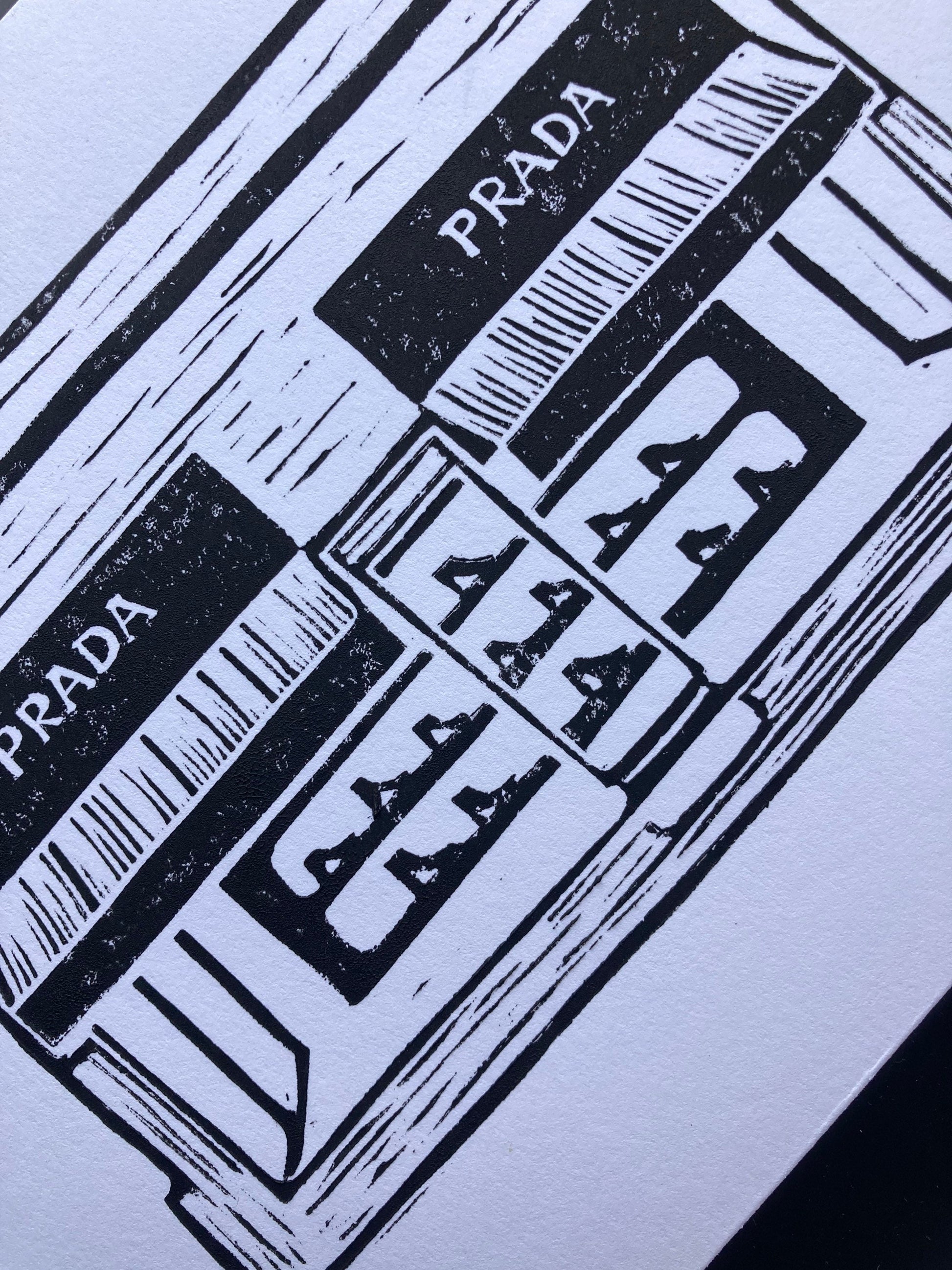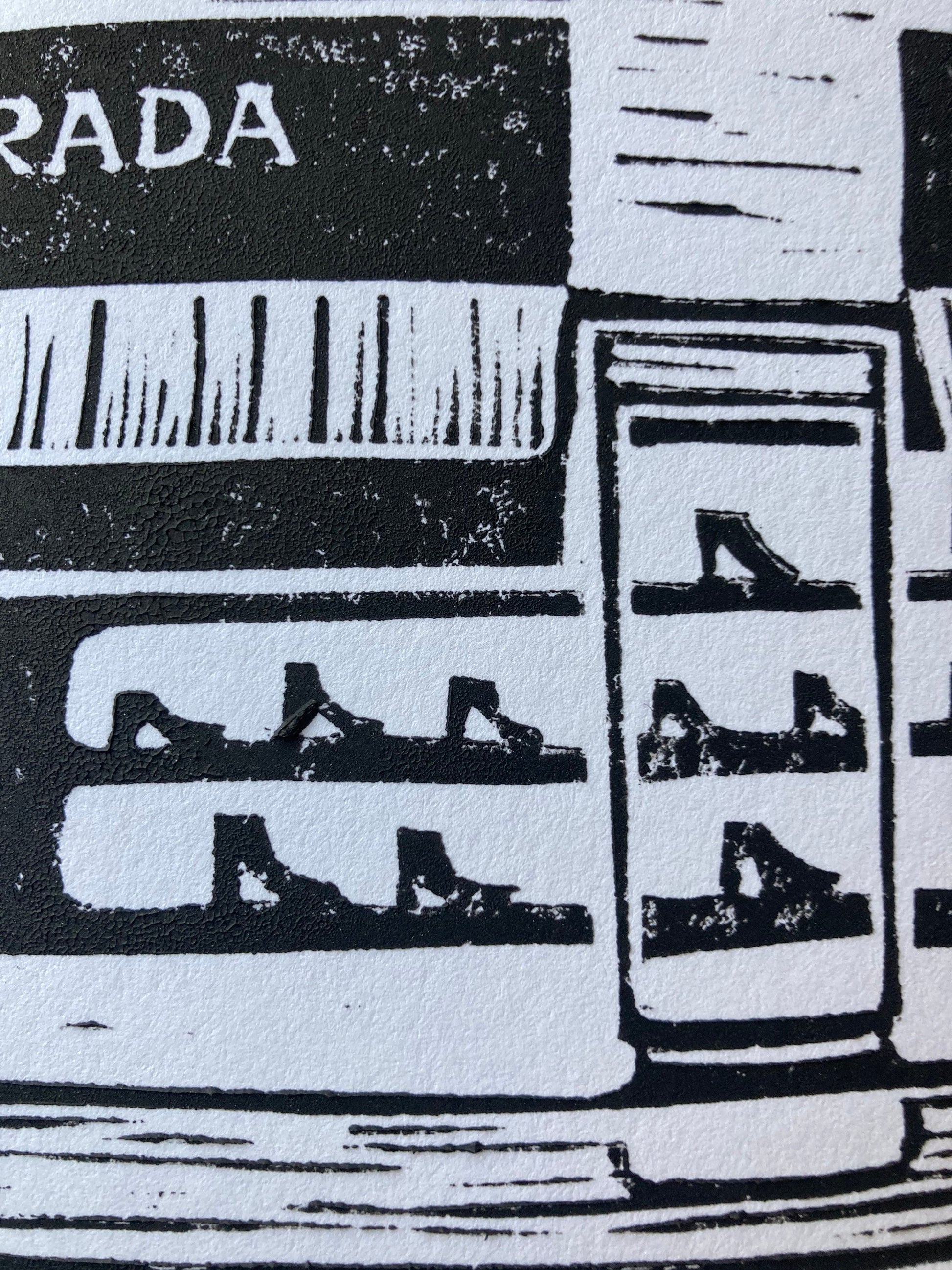 This linocut print of Marfa's infamous Prada store was pressed in black on beautiful 100% cotton Lettra letterpress paper. The linoleum block is cut by hand, inked, then printed individually. Due to the printing process (which is done entirely by hand), there will be variations from print to print giving you an original and unique piece of artwork! All materials are archival.