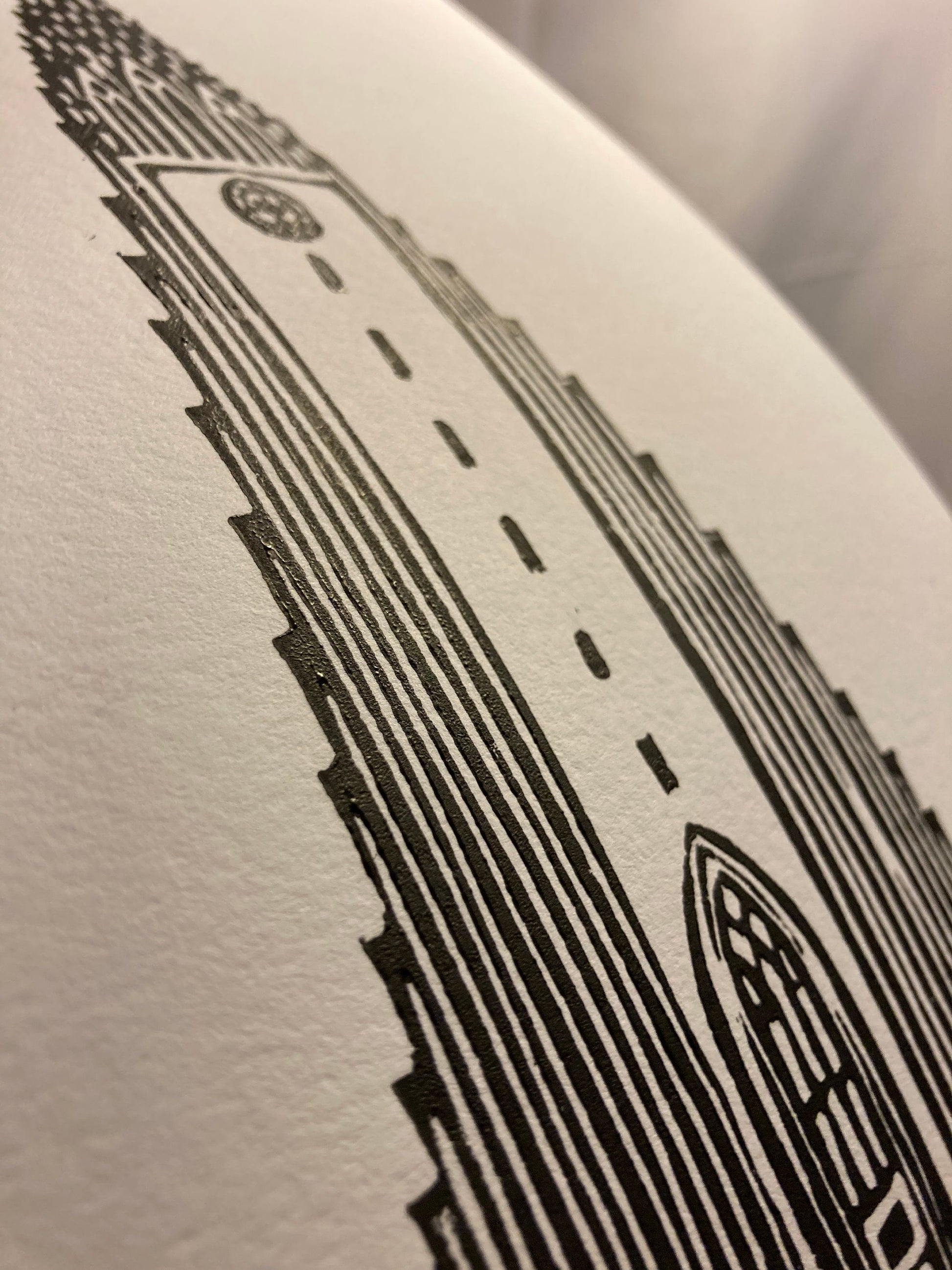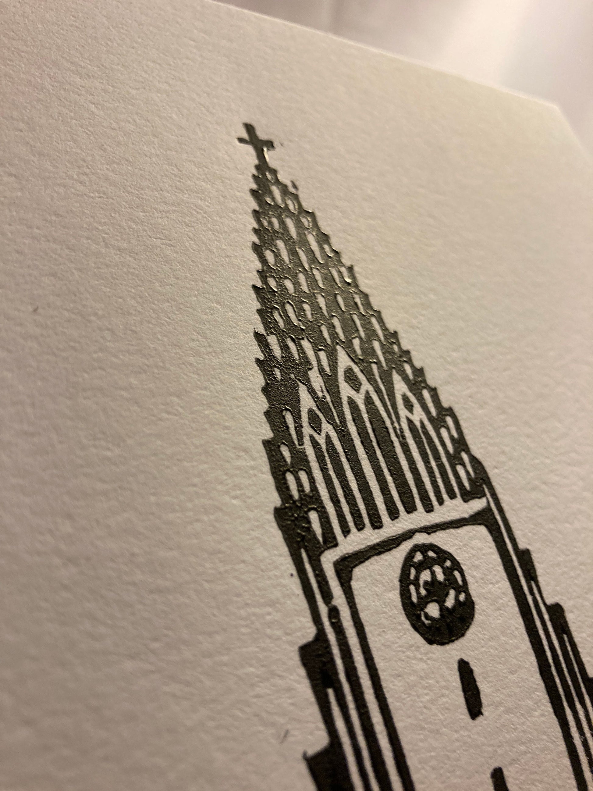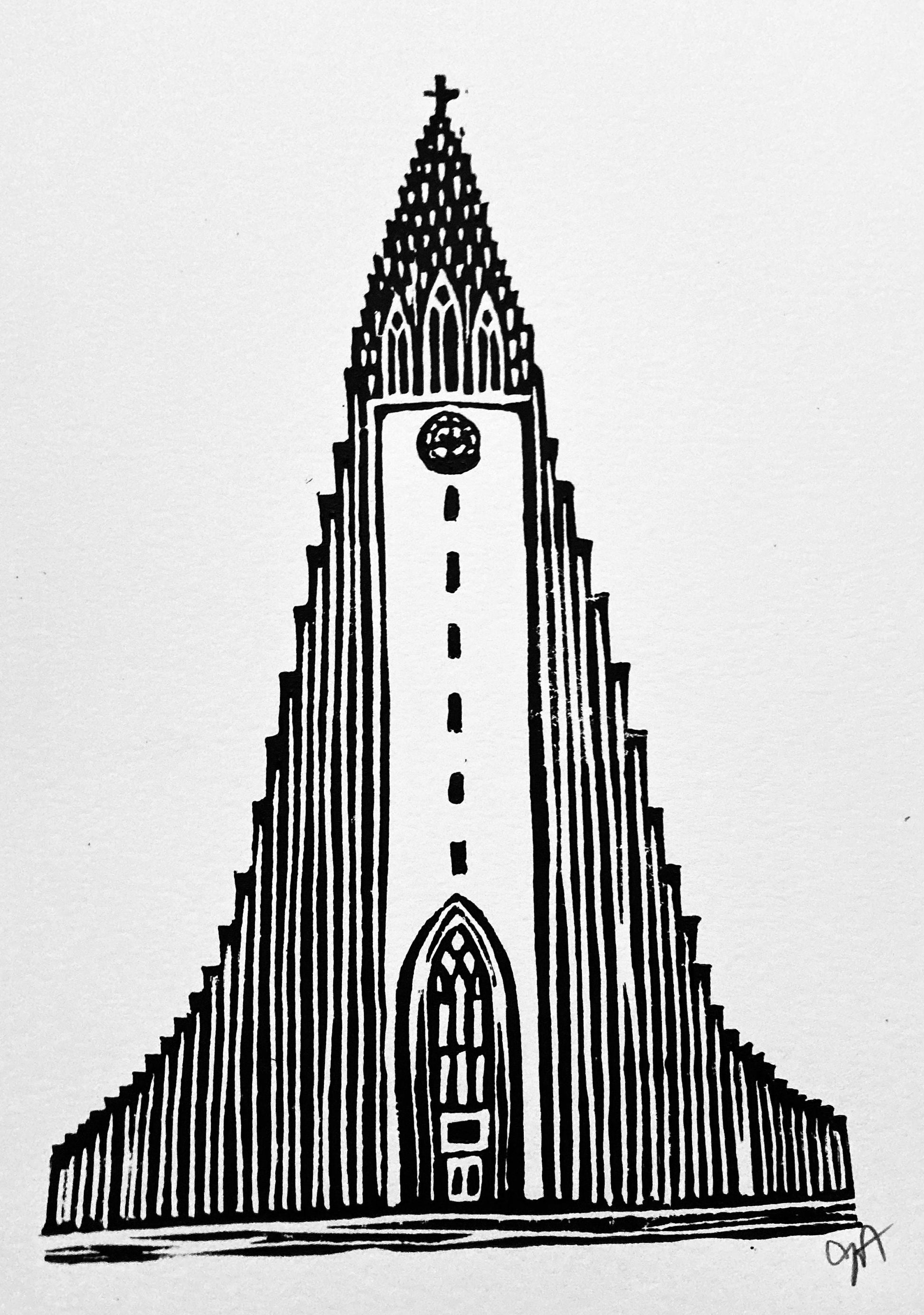 Hallgrimskirkja Tower in Reykjavik Iceland, linocut relief print, 8x10.