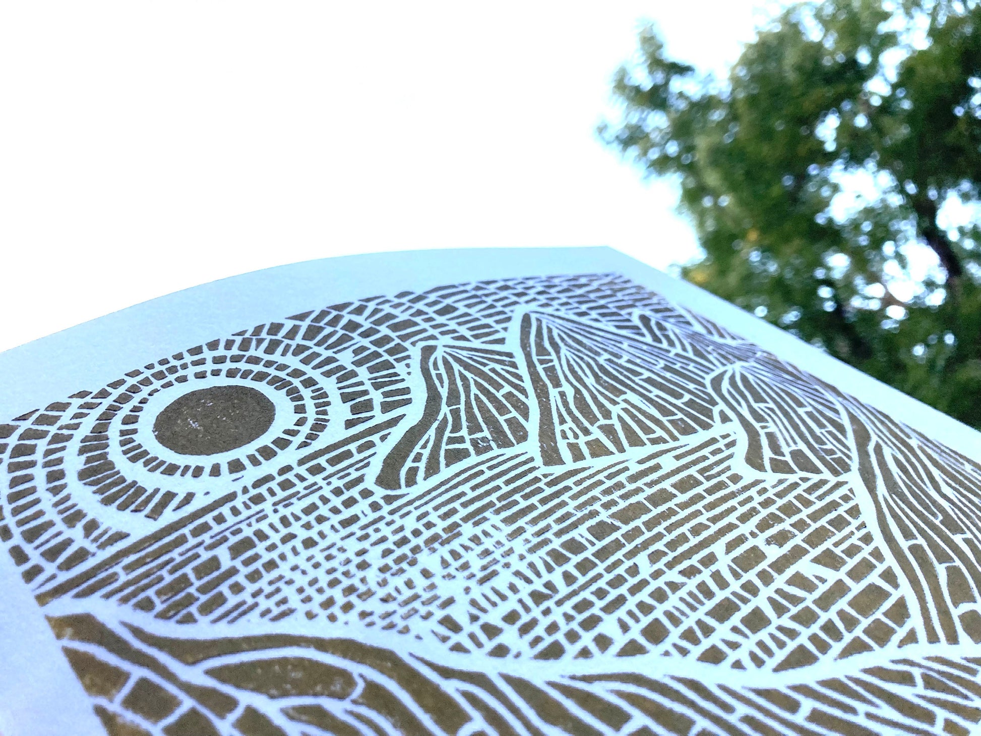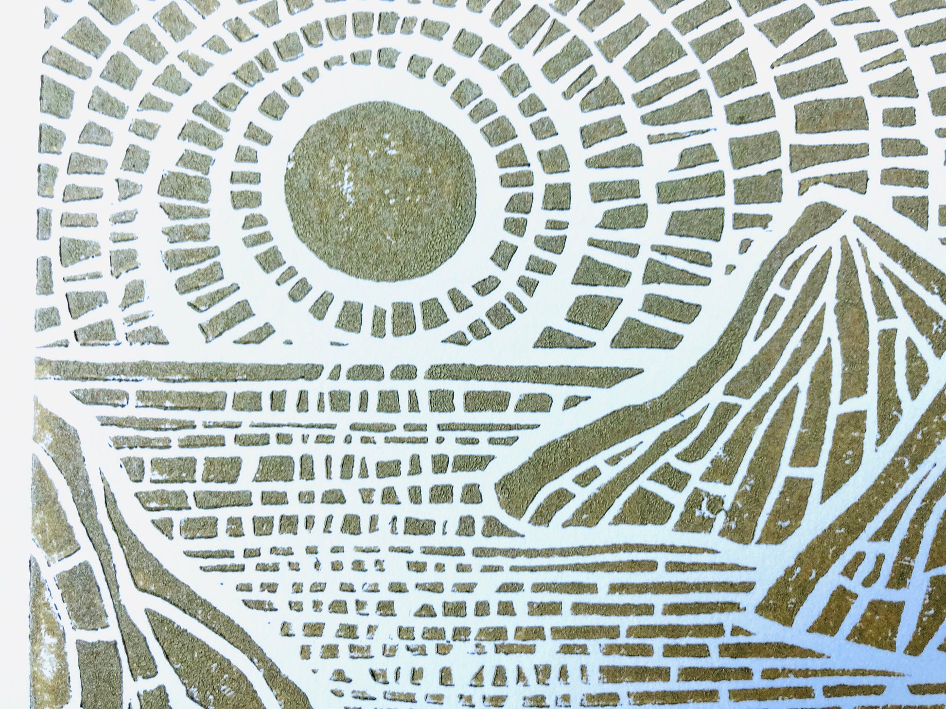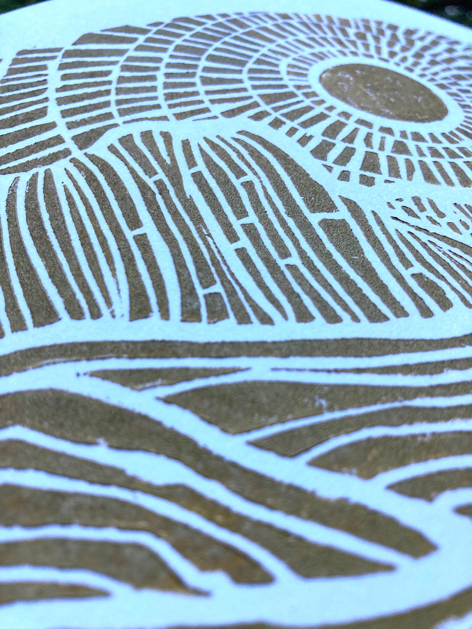 This hand-pulled print of the sunset on the coastline was pressed in shimmery gold on cotton letterpress paper. The linoleum block is gently carved by hand, inked, then printed individually. Due to the printing process (which is done entirely by hand), there will be variations from print to print giving you an original and unique piece of artwork! All materials are archival.