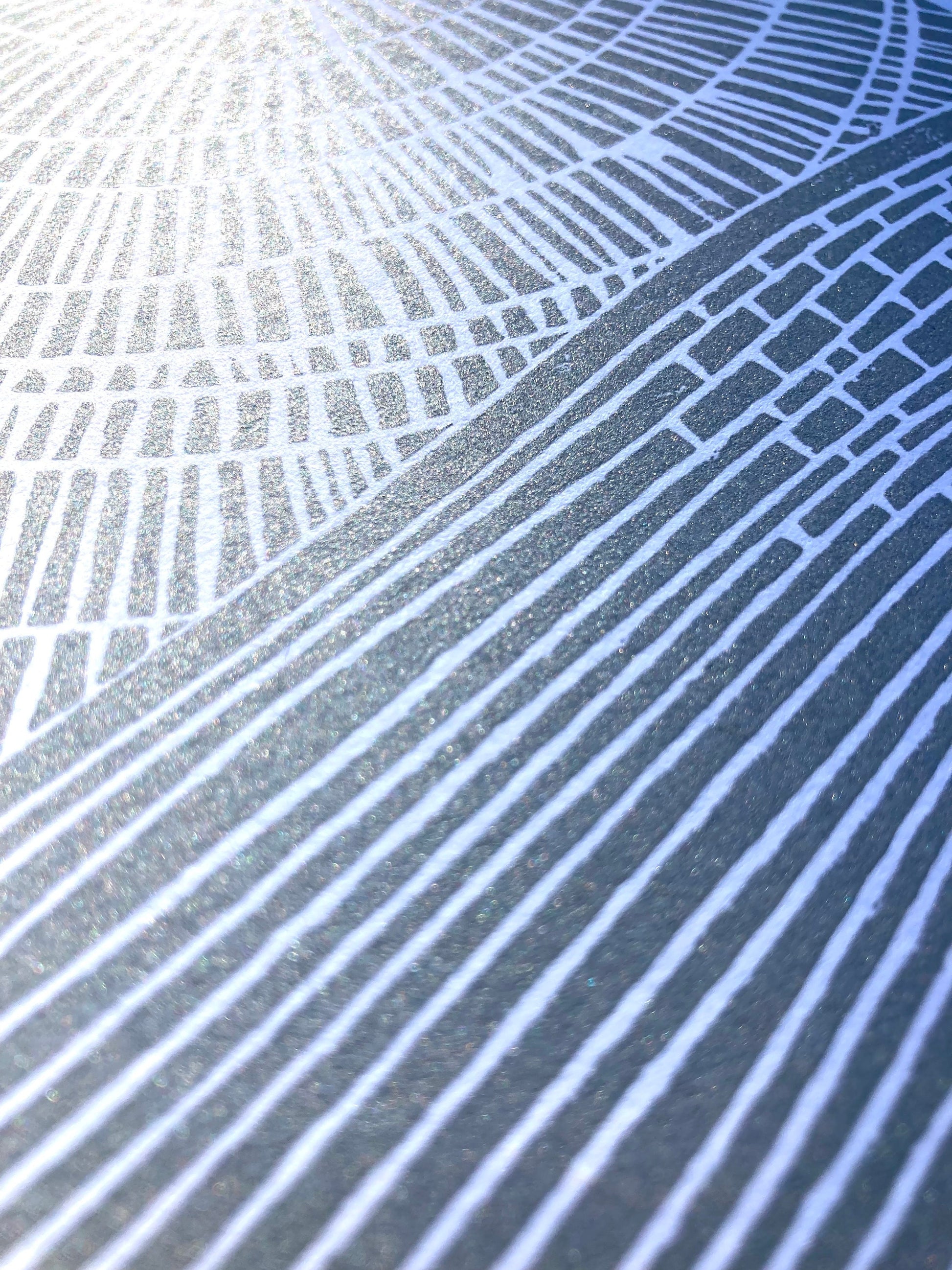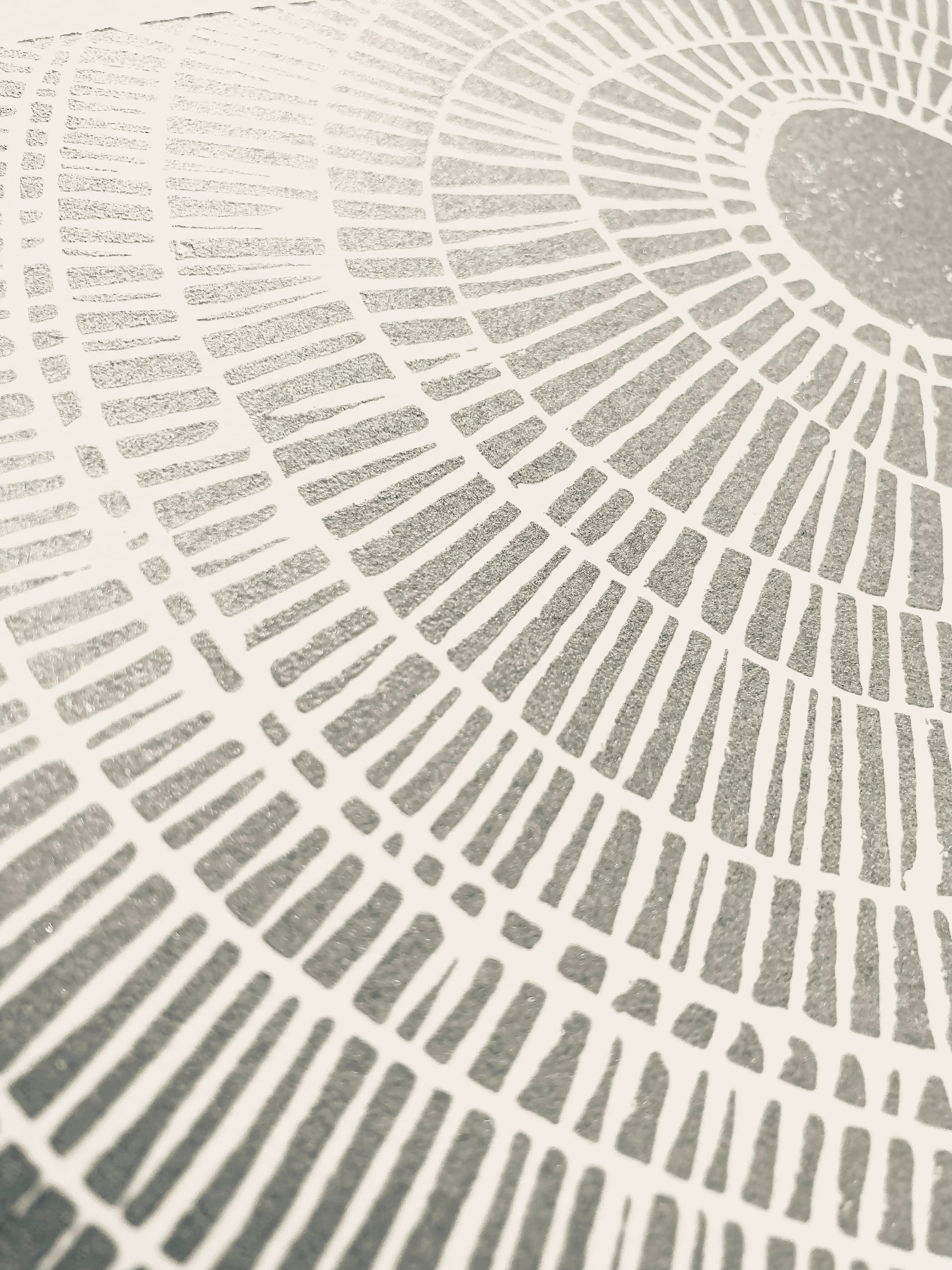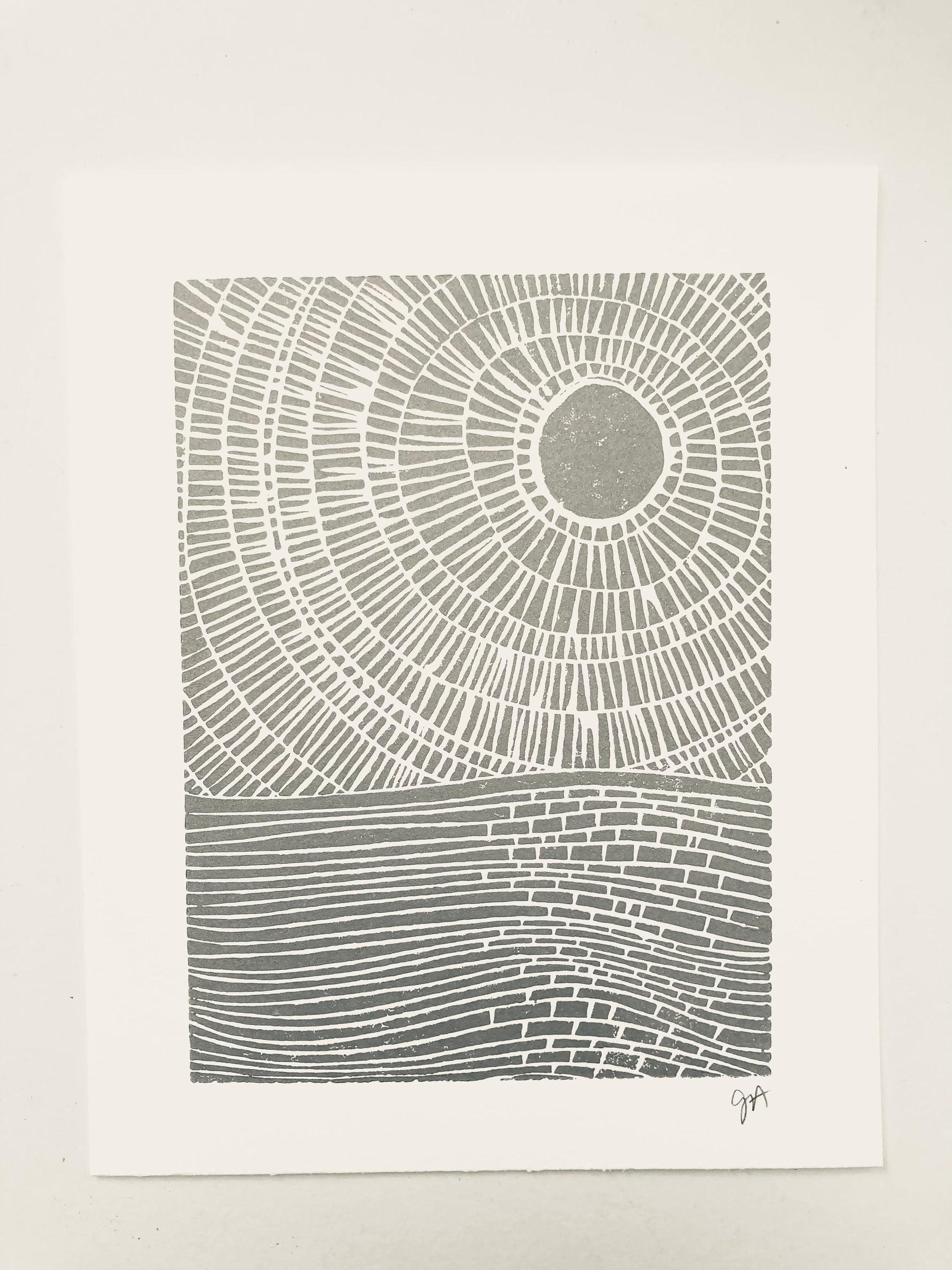 This original, hand-pulled linoleum block print of the ocean was pressed in shimmery silver on thick cotton letterpress paper. The linoleum block is cut by hand, inked, then each linoprint is pressed individually. Due to the printing process (which is done entirely by hand), there will be variations from print to print. All materials are archival.