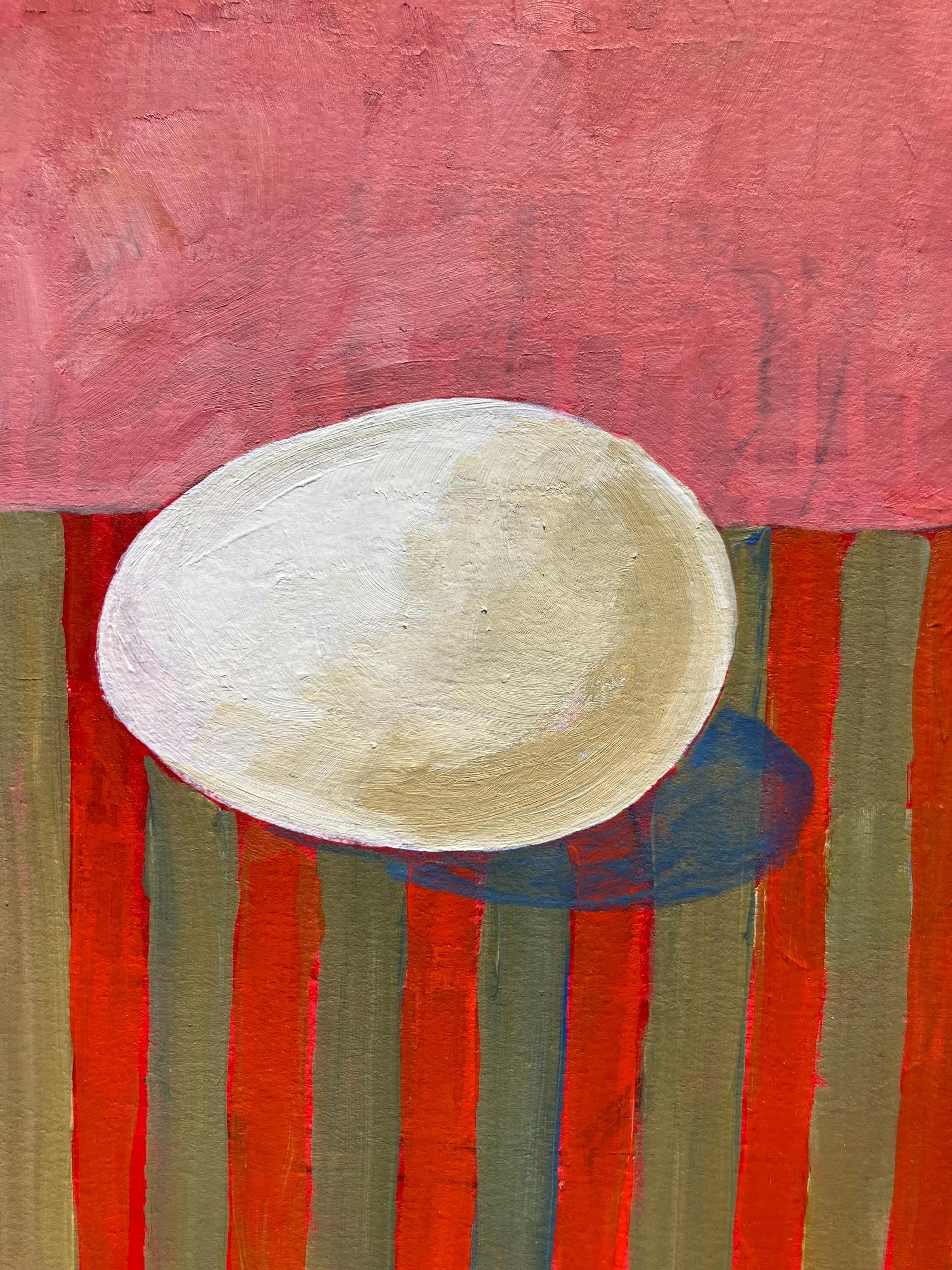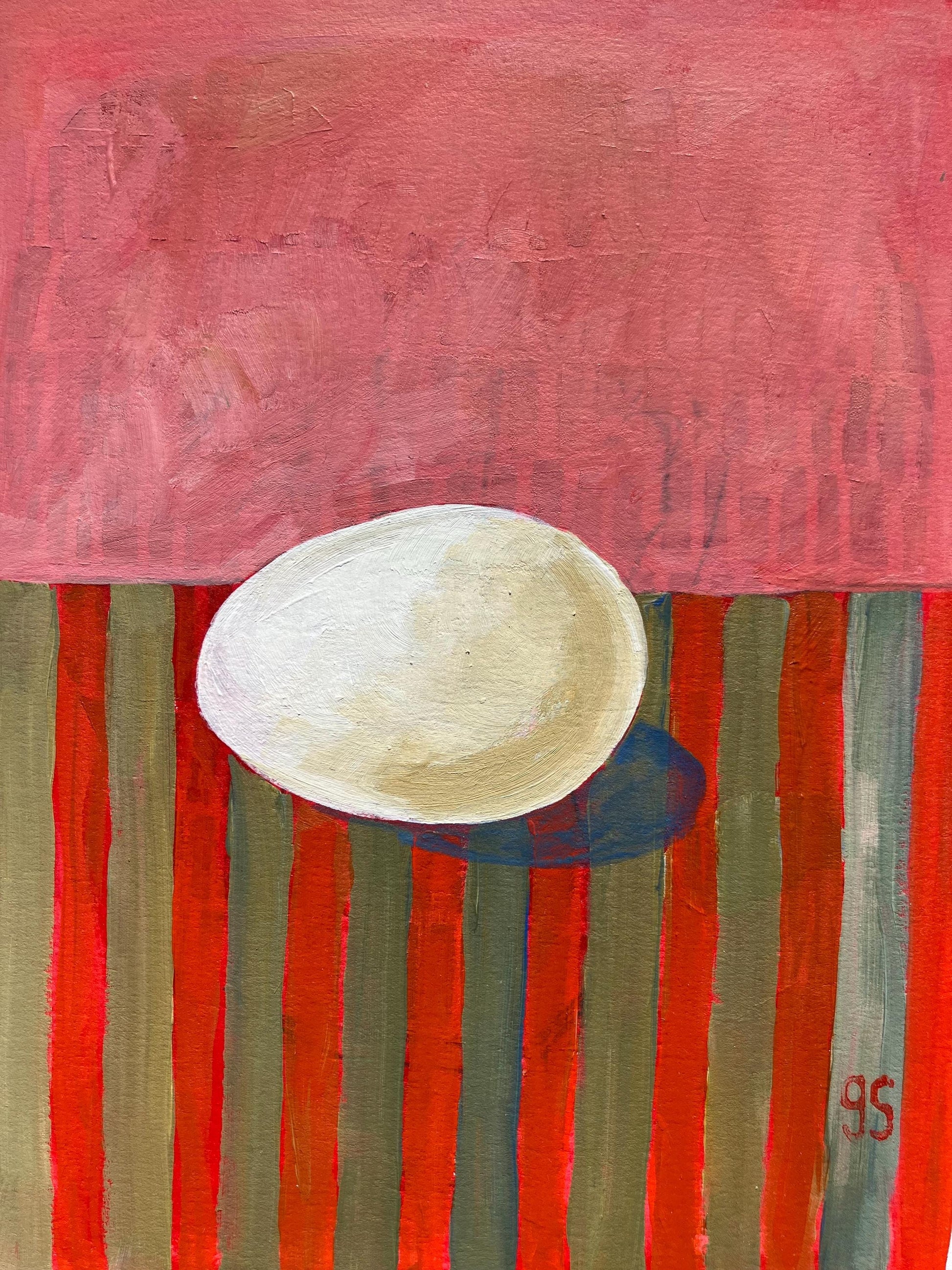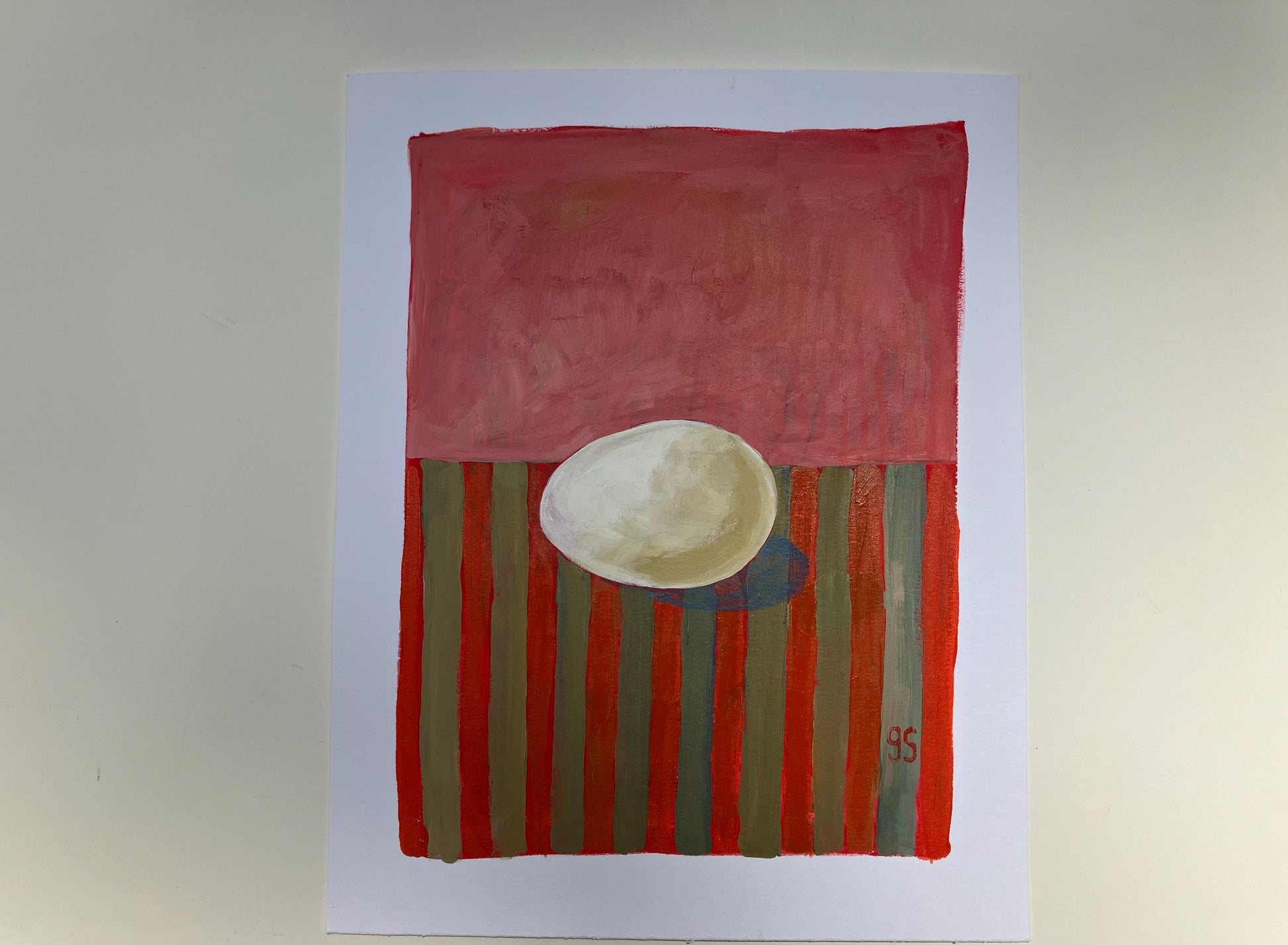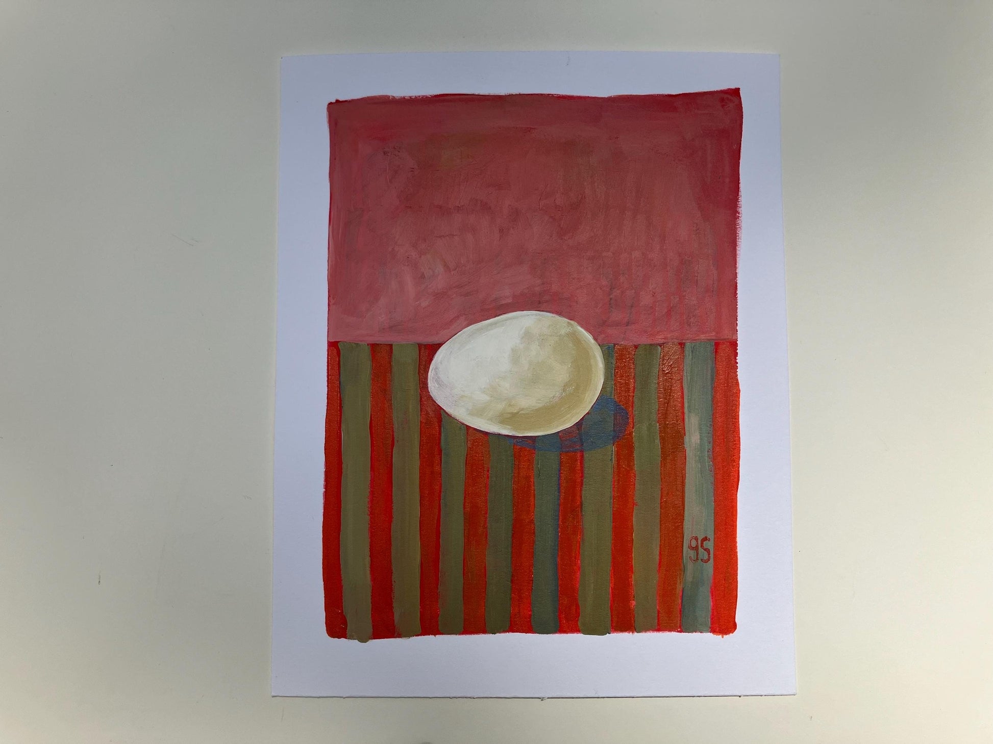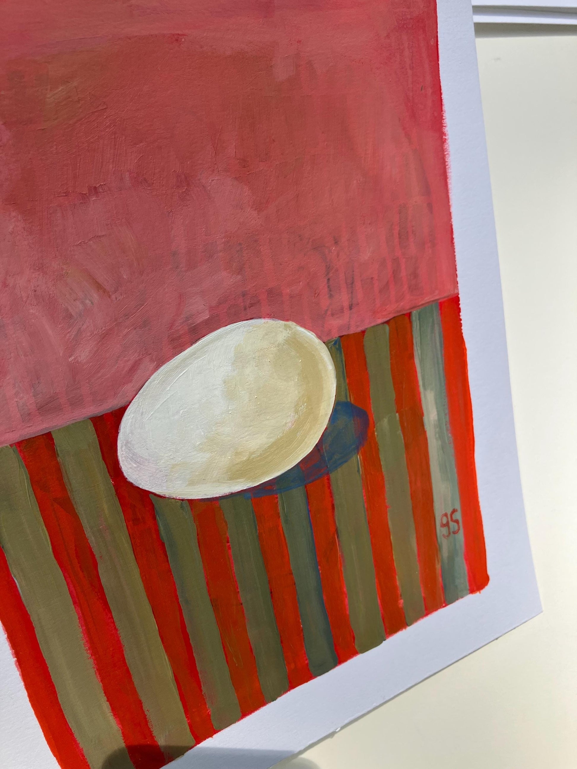 This original 8x10" acrylic painting of an egg was painted in red and pink. This piece features short brushstrokes and neutral colors. It was painted on cotton Lettra paper. This original painting is nicely textured. The paper was recycled from a linocut print, giving it a unique texture. This piece is an original, texture abound!
