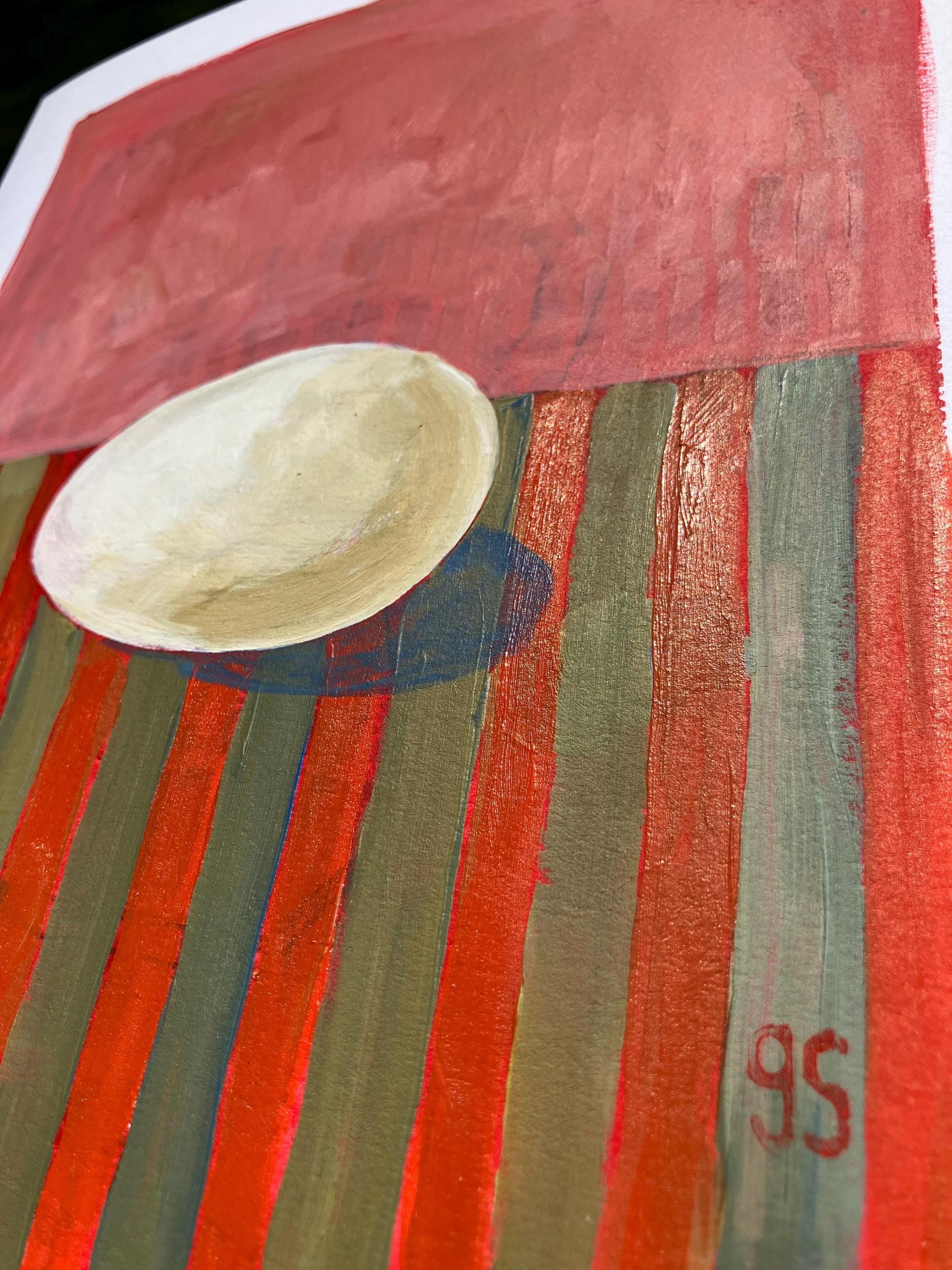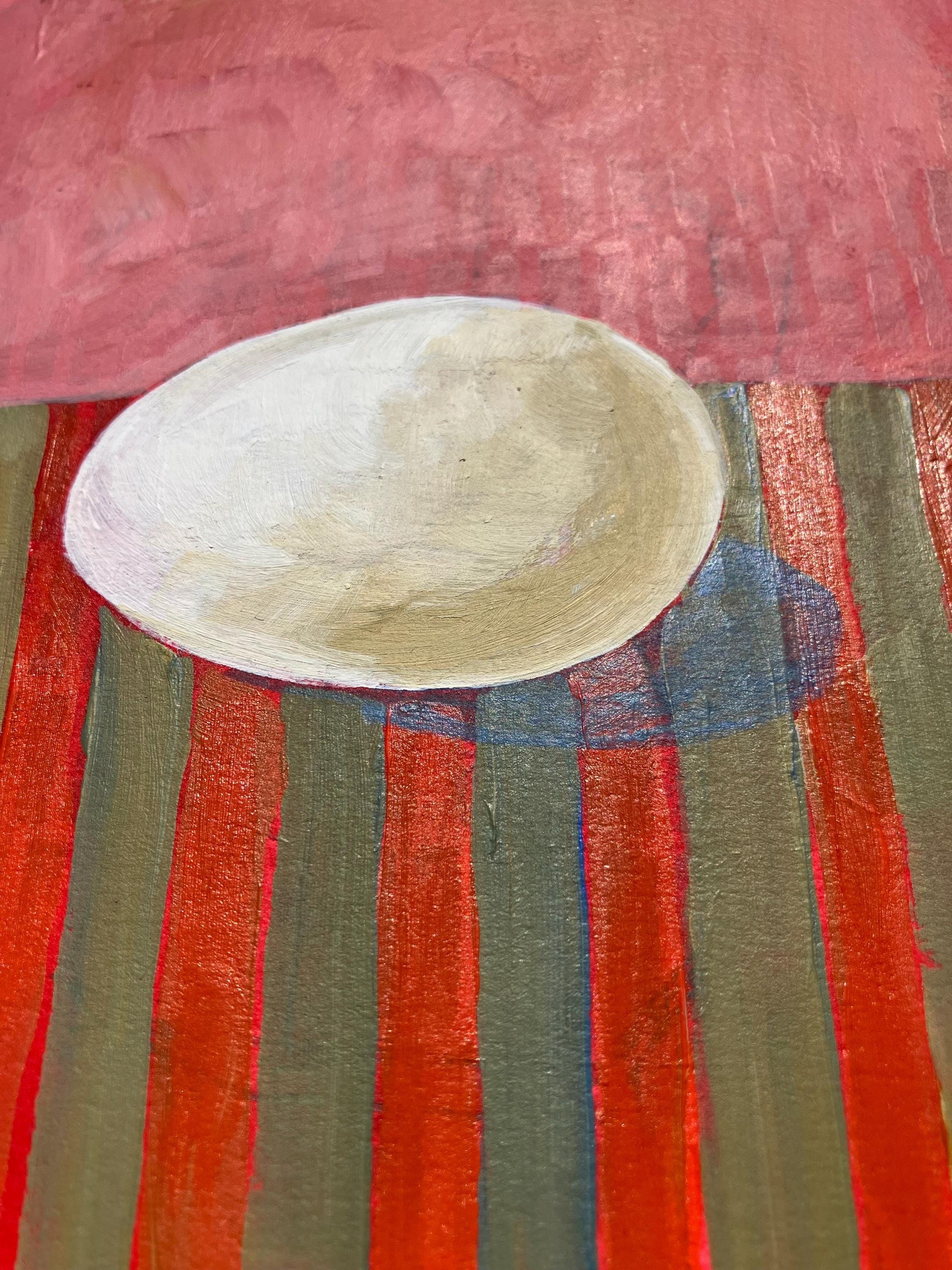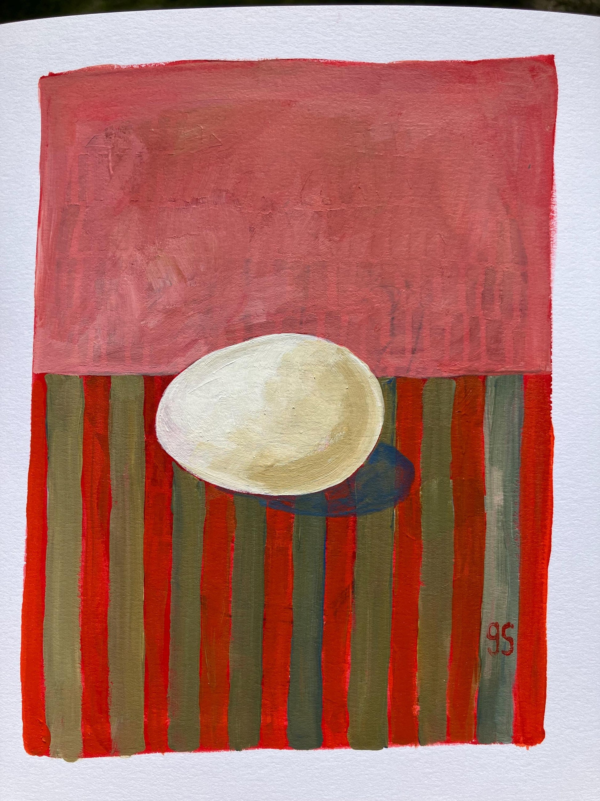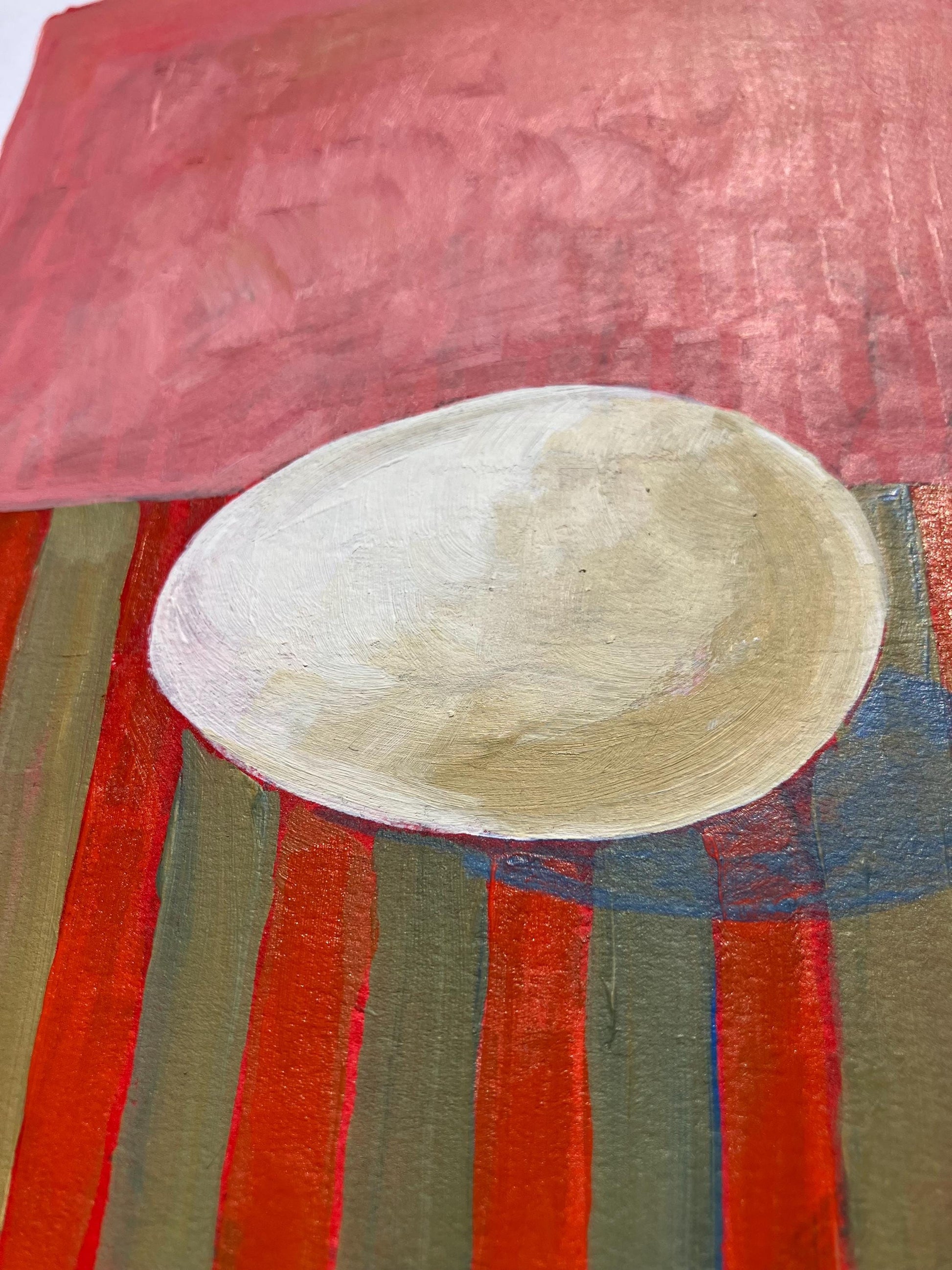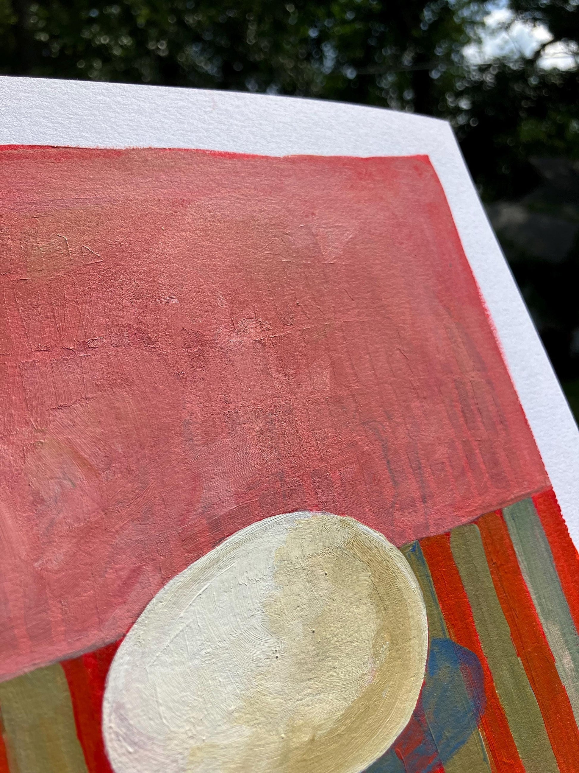 This original 8x10" acrylic painting of an egg was painted in red and pink. This piece features short brushstrokes and neutral colors. It was painted on cotton Lettra paper. This original painting is nicely textured. The paper was recycled from a linocut print, giving it a unique texture. This piece is an original, texture abound!