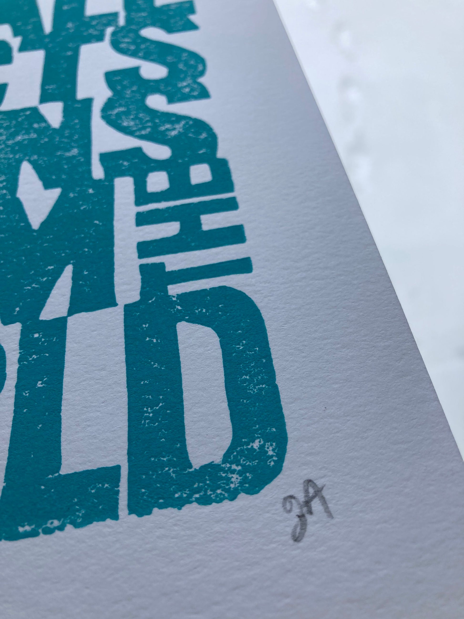 This original, hand-pulled relief print was printed in robins egg blue (and orange) on beautiful letterpress paper. The linoleum block is carved by hand, inked, then each linoprint is pressed individually. Due to the printmaking process, there will be variations from print to print. This means that you will get a totally unique piece of art! All materials are archival. The full quote: “Small acts, when multiplied by millions of people, can transform the world.”