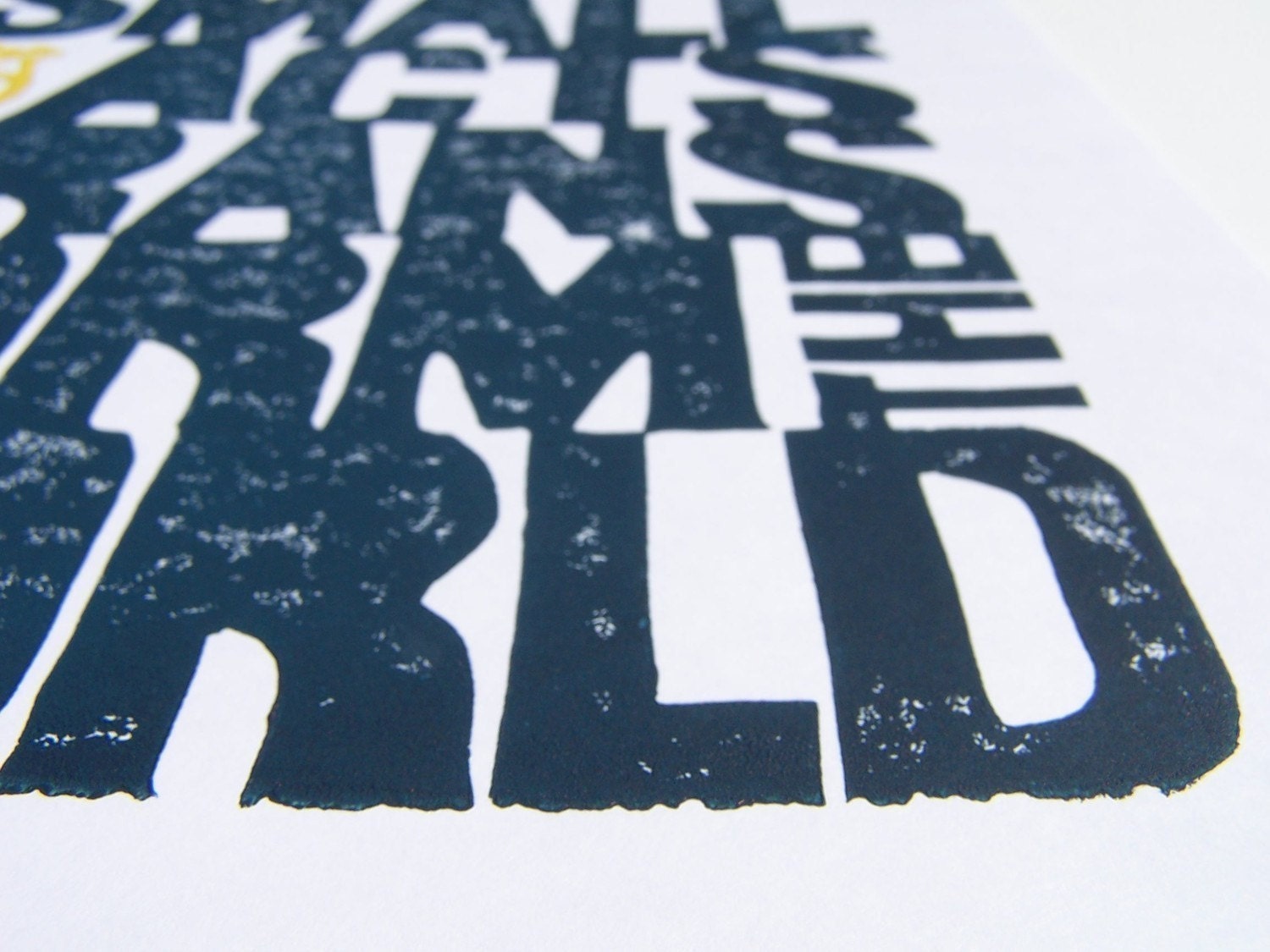 This hand-pulled linocut print was printed in dark blue (and yellow) on beautiful cotton letterpress paper. The linoleum block is carved by hand, inked, then each linoprint is pressed individually. Due to the printmaking process, there will be variations from print to print giving you an original piece of art. All materials are archival. This is the perfect gift for those who inspire and seek to be inspired.