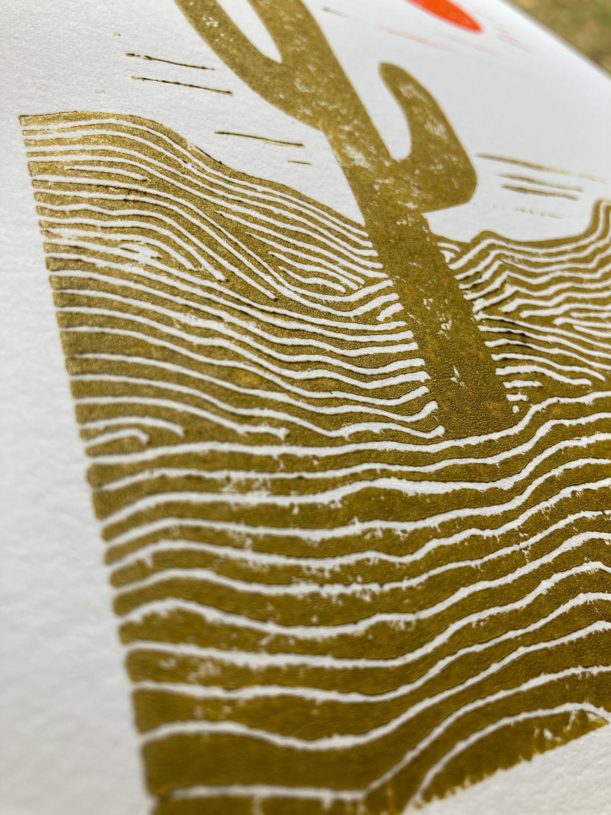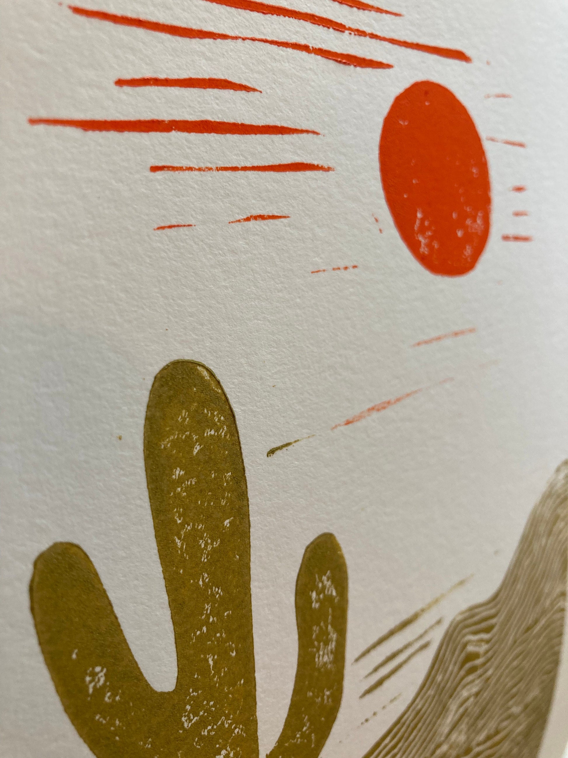 8x10 Linocut print of an orange sunset on shimmery gold desert sand at Saguaro National Park.