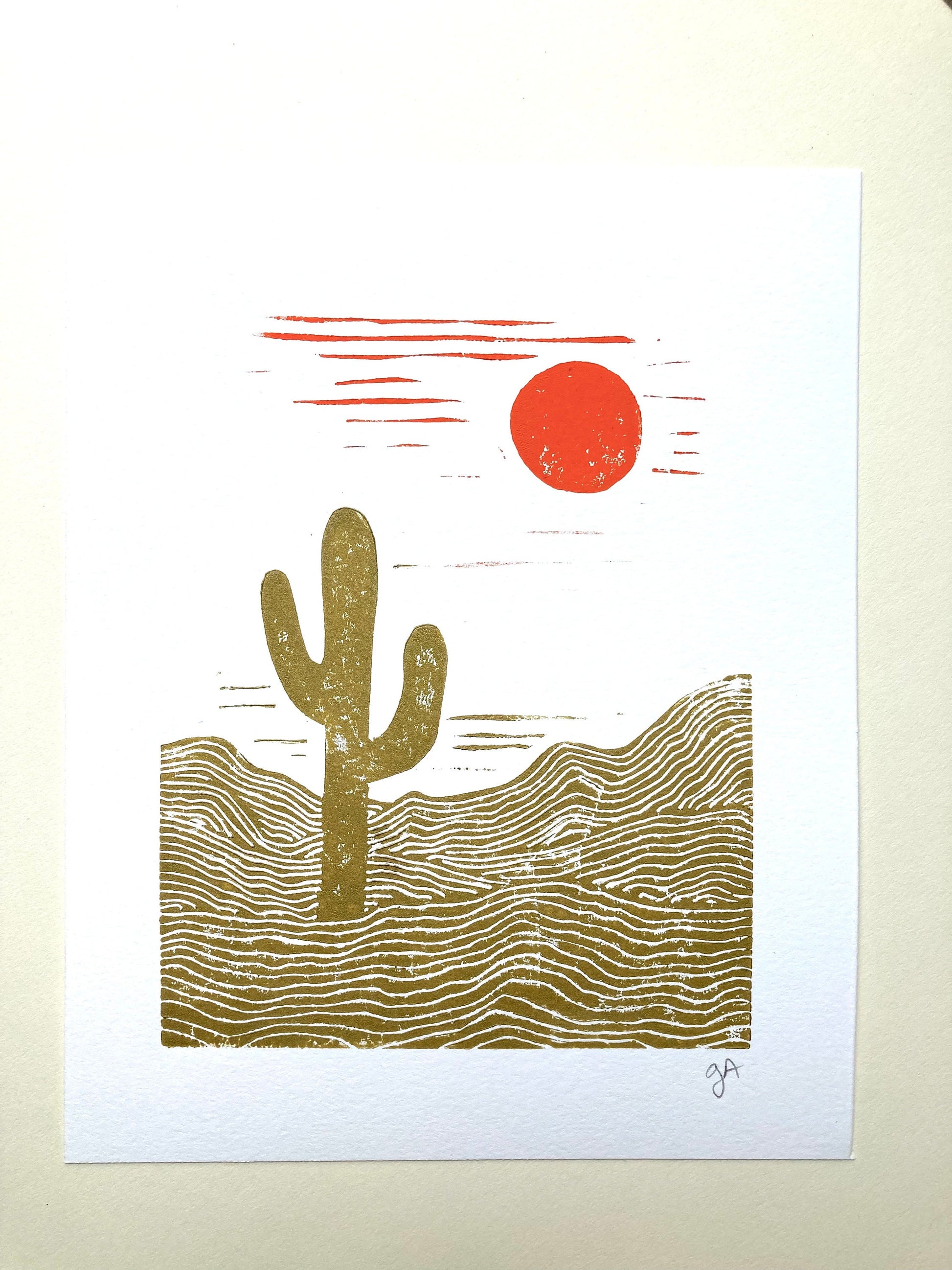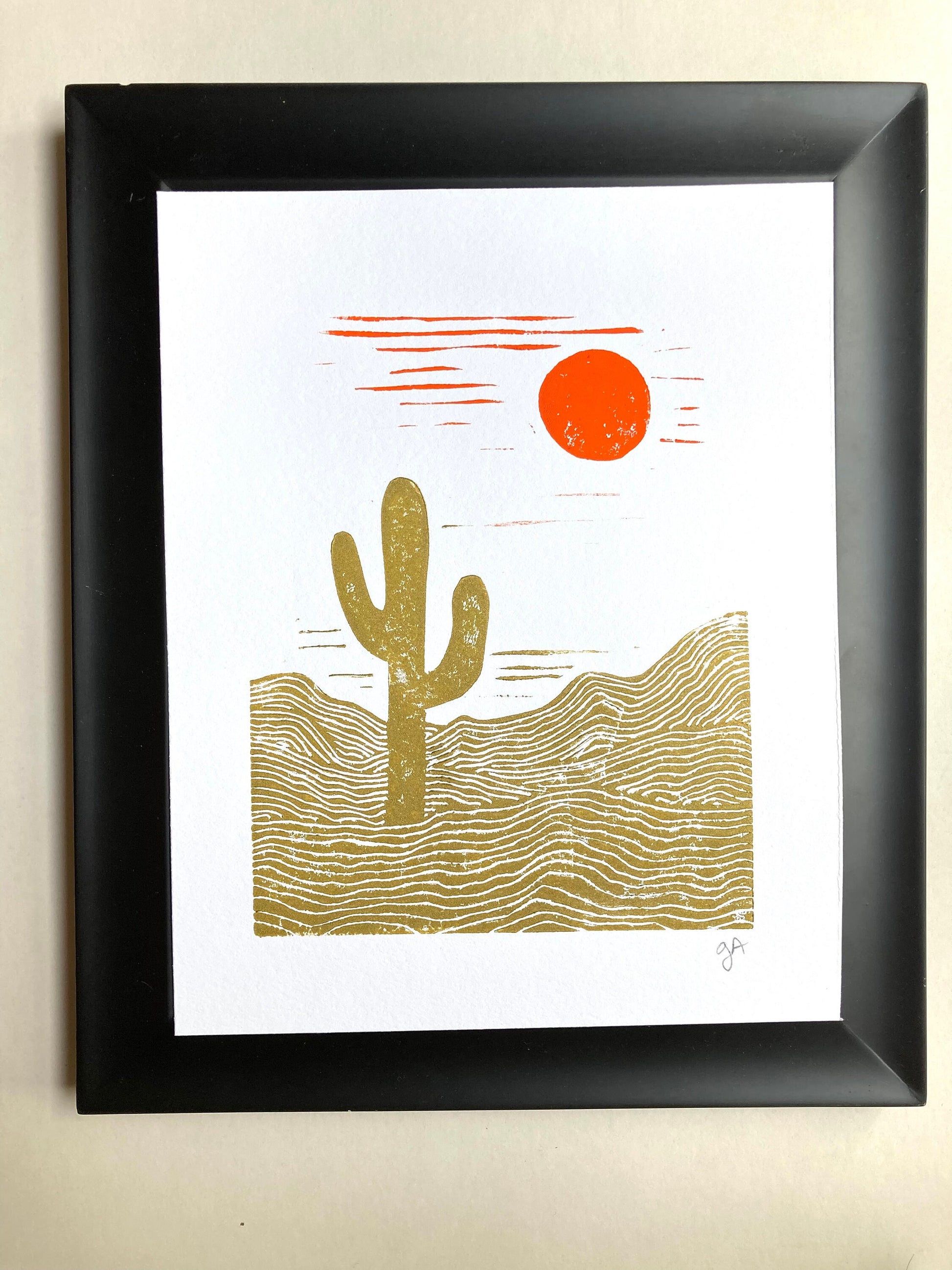 This hand-pulled print of a Saguaro cactus was printed in metallic gold and bright orange on gorgeous letterpress paper. The linoleum block is carved by hand, inked, then each print is printed individually. Due to the printing process (which is done entirely by hand), there will be variations from print to print giving you an original and unique piece of artwork! All materials are archival.