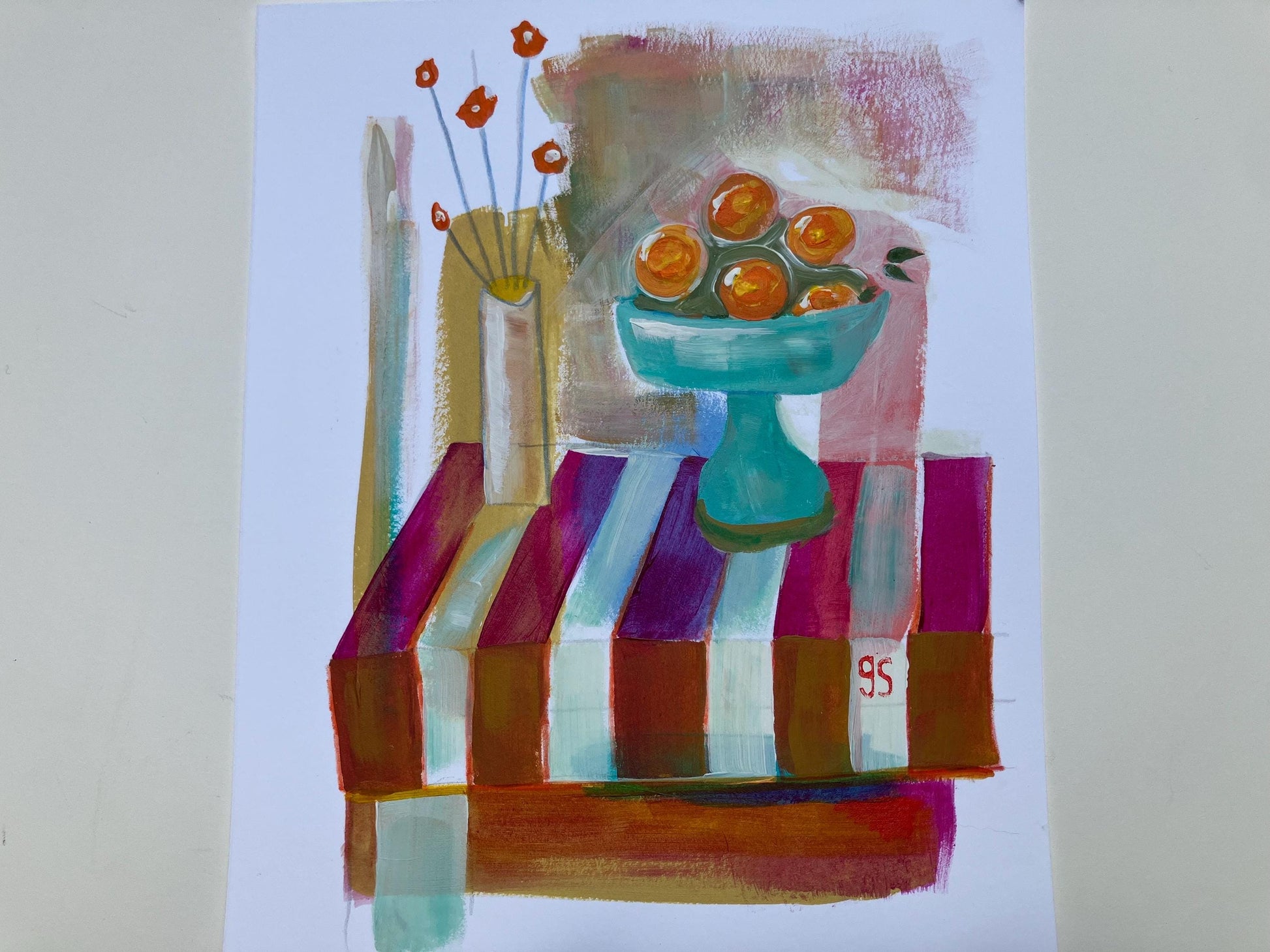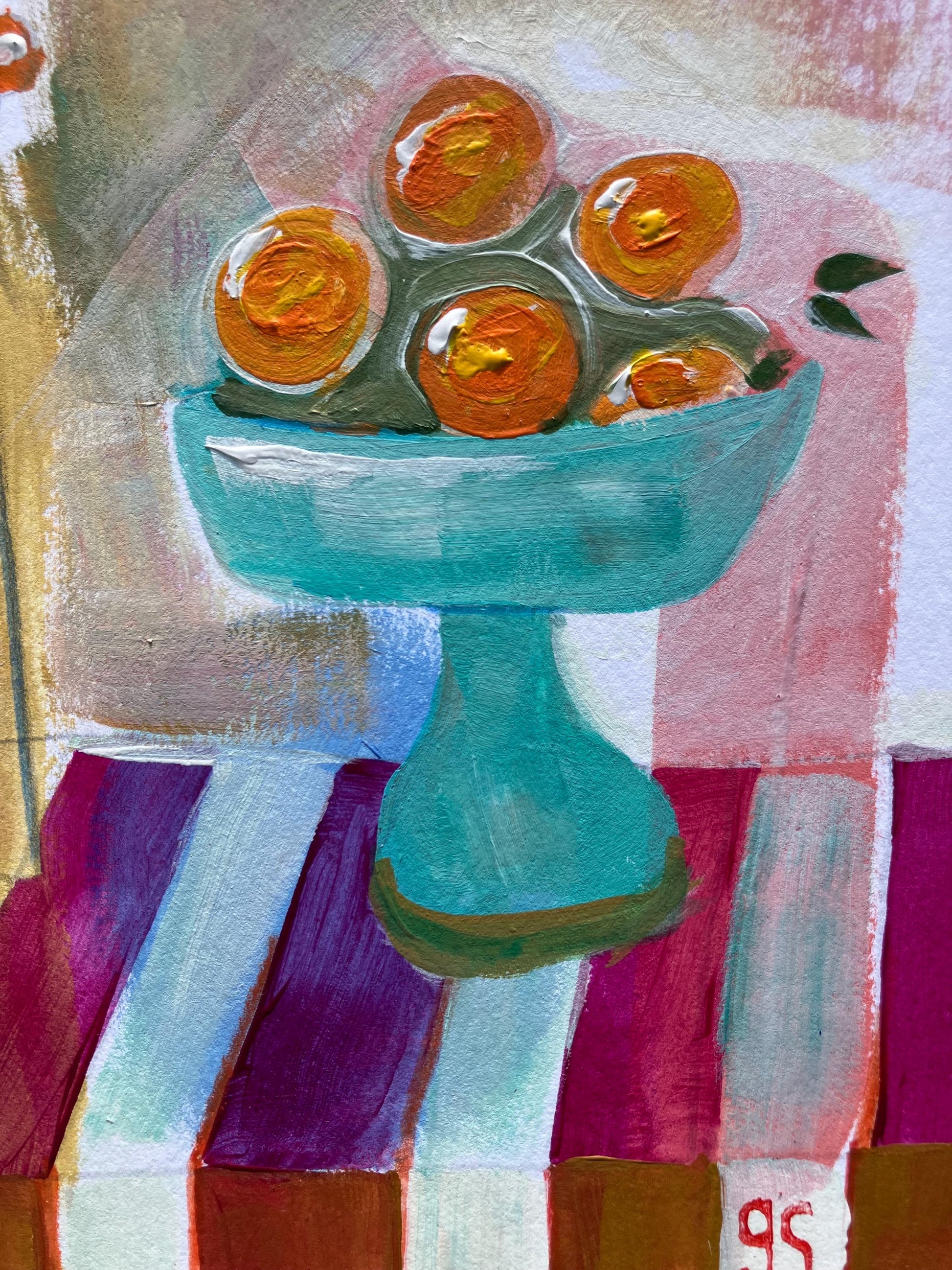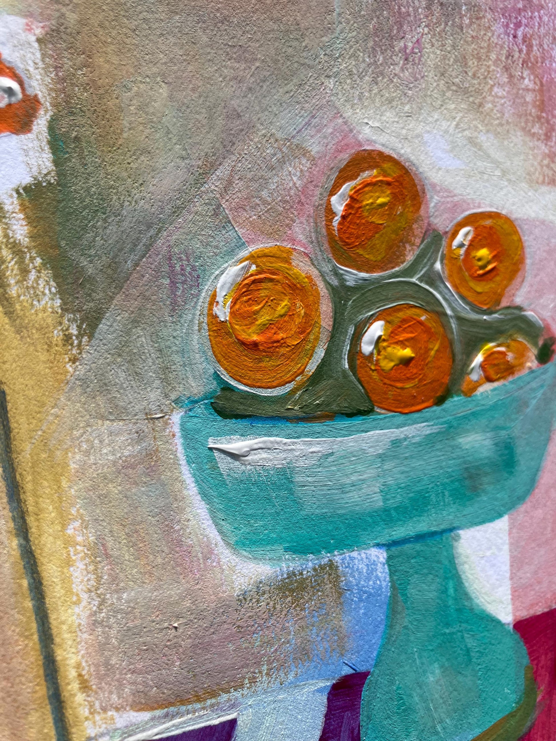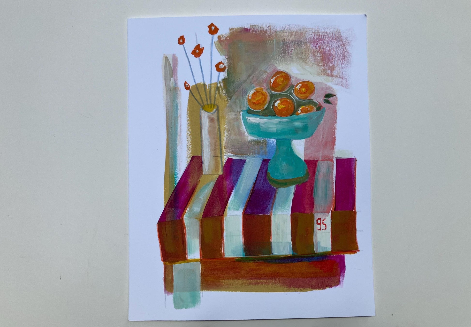 Bowl of oranges and vase of flowers. This original 8x10" acrylic painting of a bouquet and fruit was painted on thick paper. This piece features short brushstrokes and bright colors. It was painted on cotton Lettra paper.