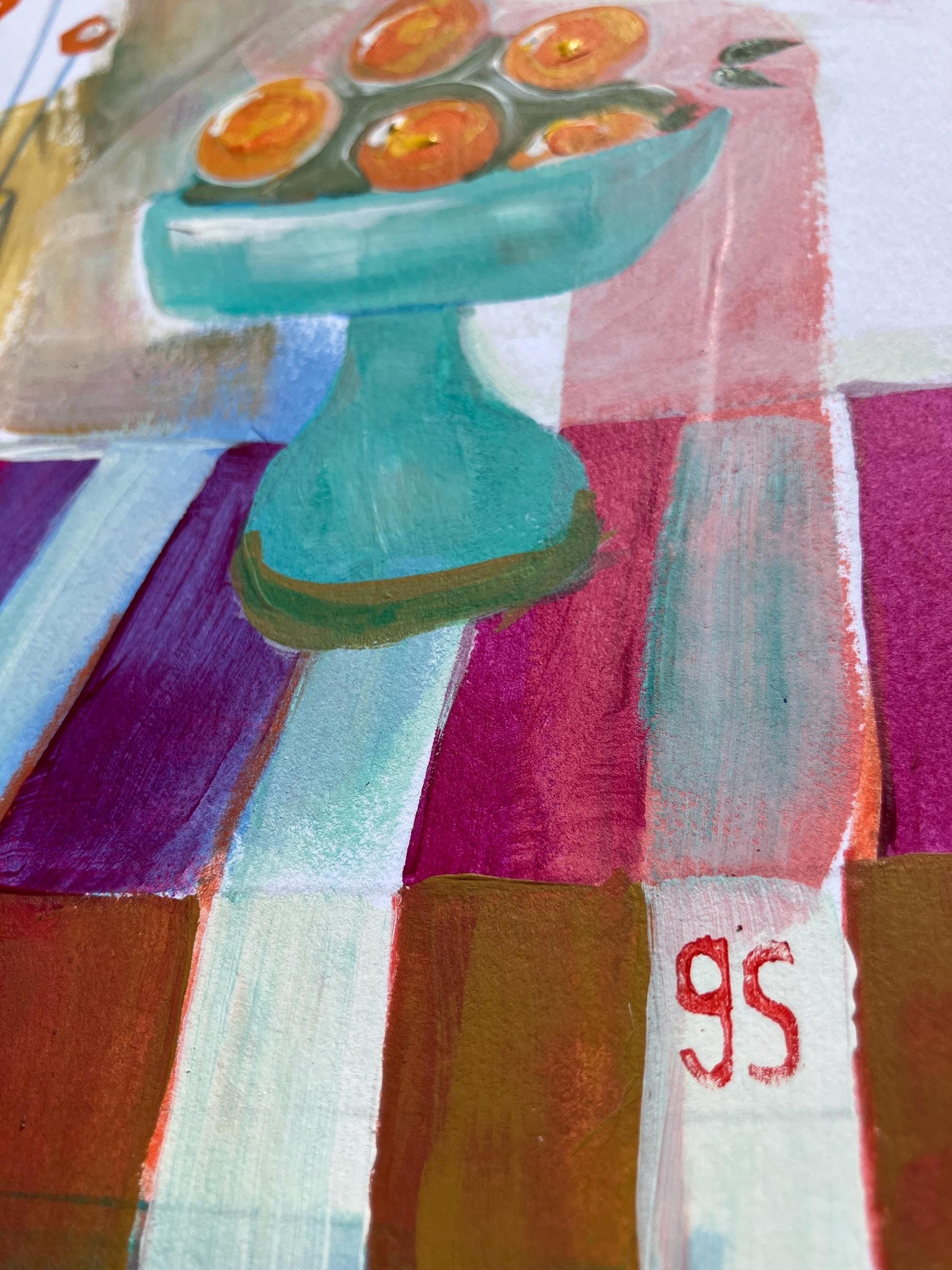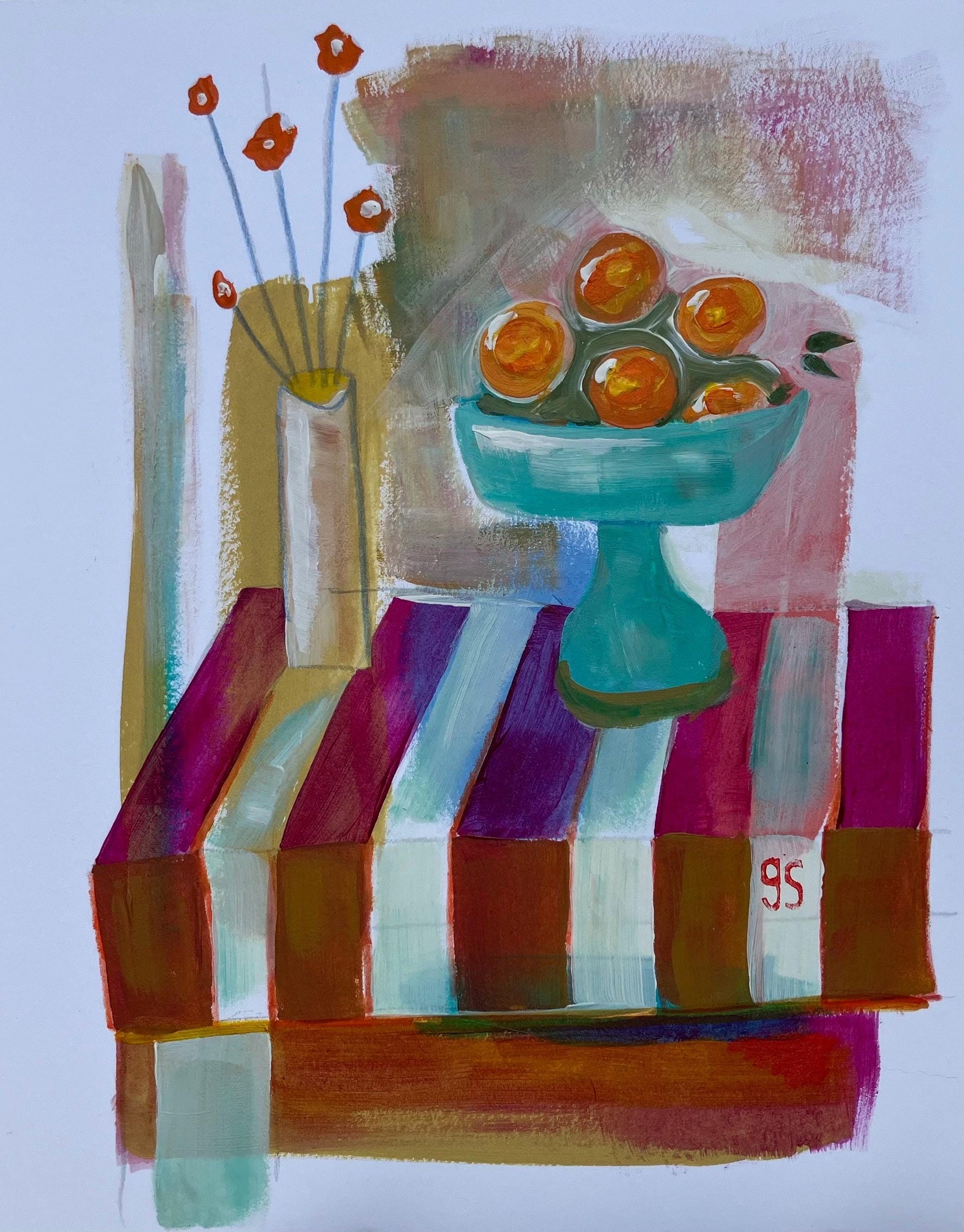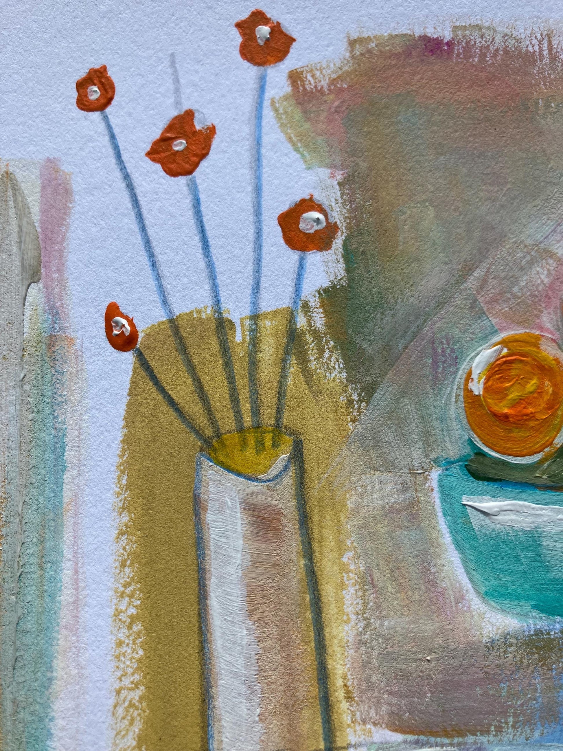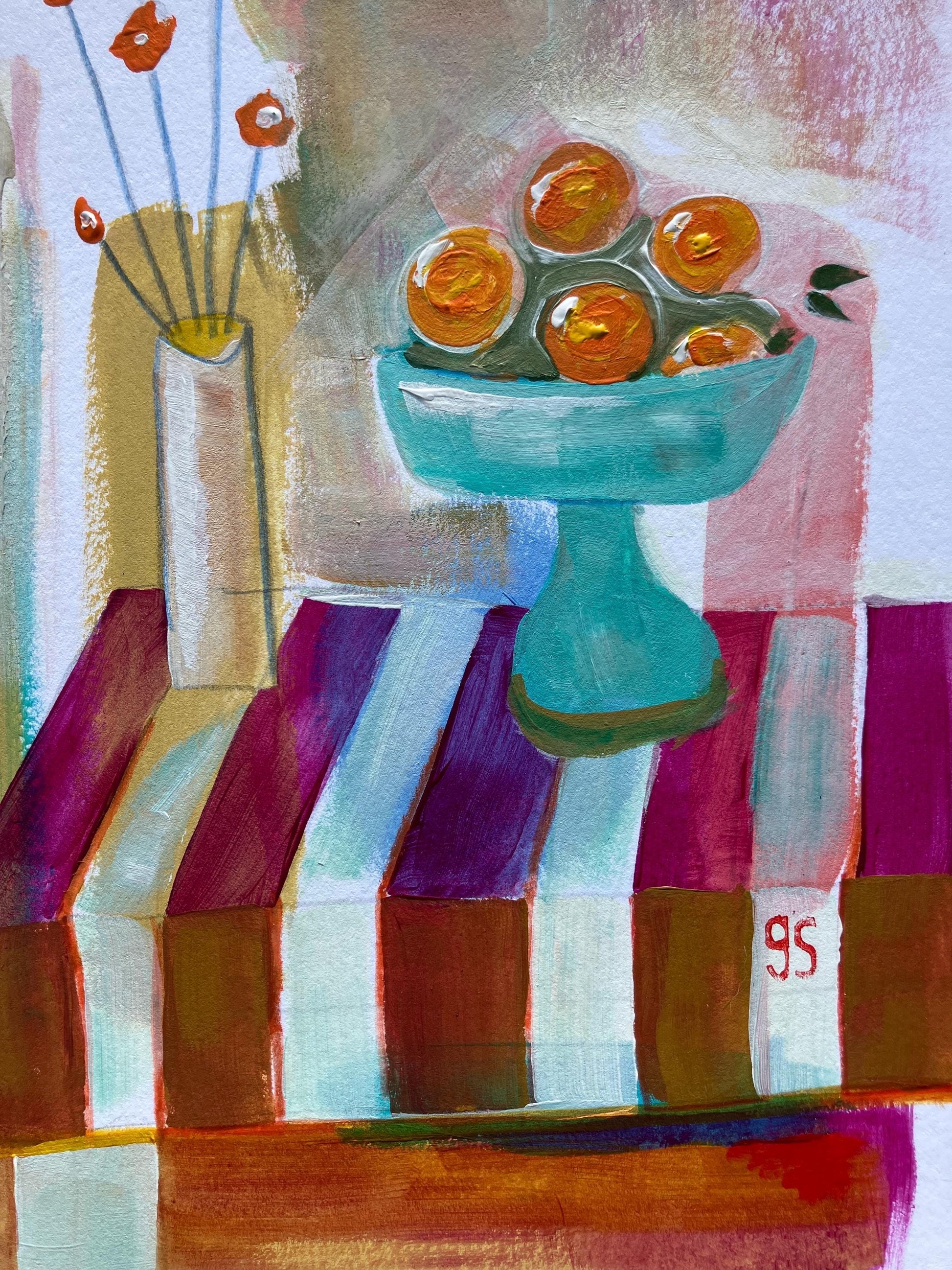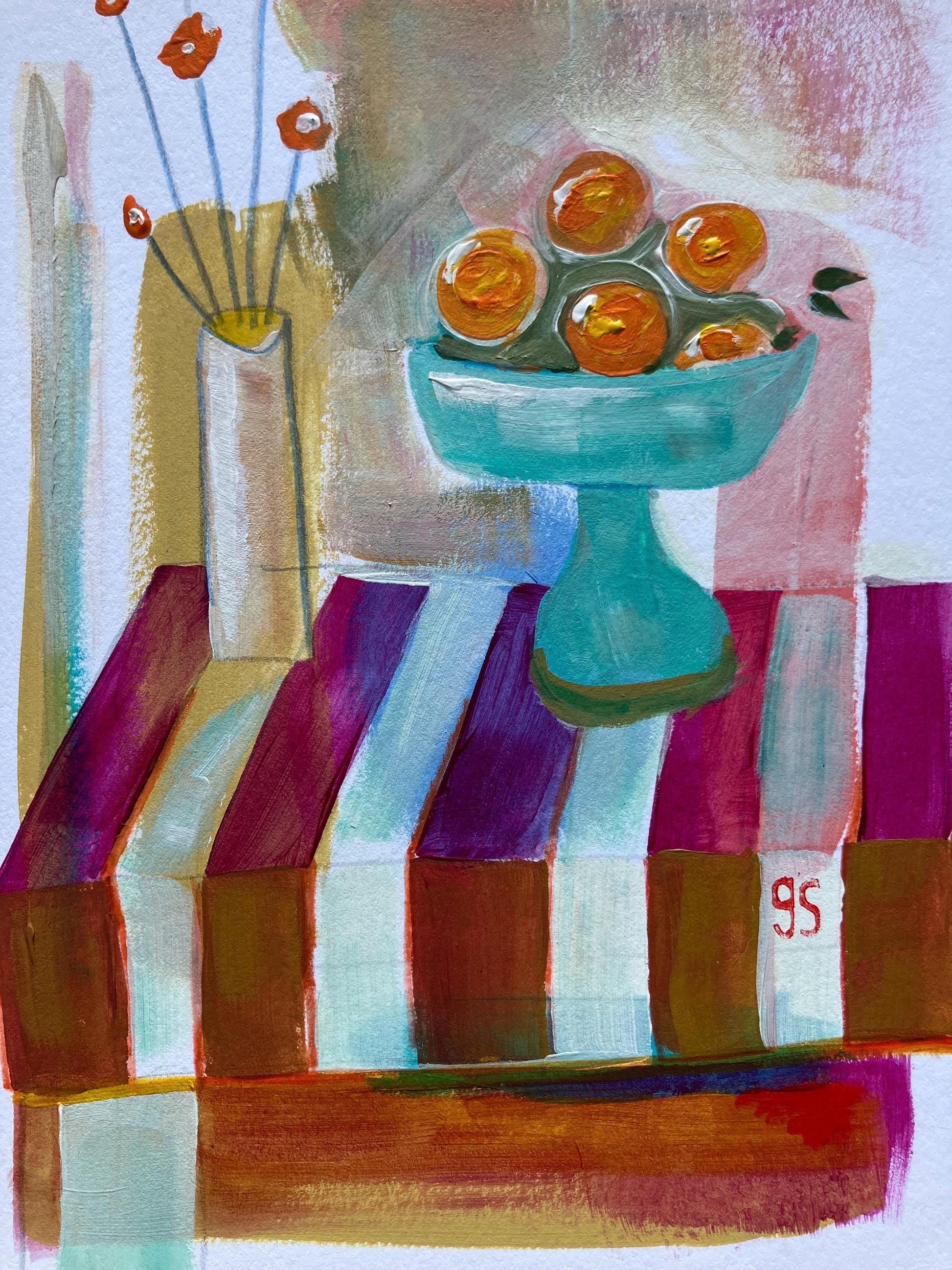 Bowl of oranges and vase of flowers. This original 8x10" acrylic painting of a bouquet and fruit was painted on thick paper. This piece features short brushstrokes and bright colors. It was painted on cotton Lettra paper.