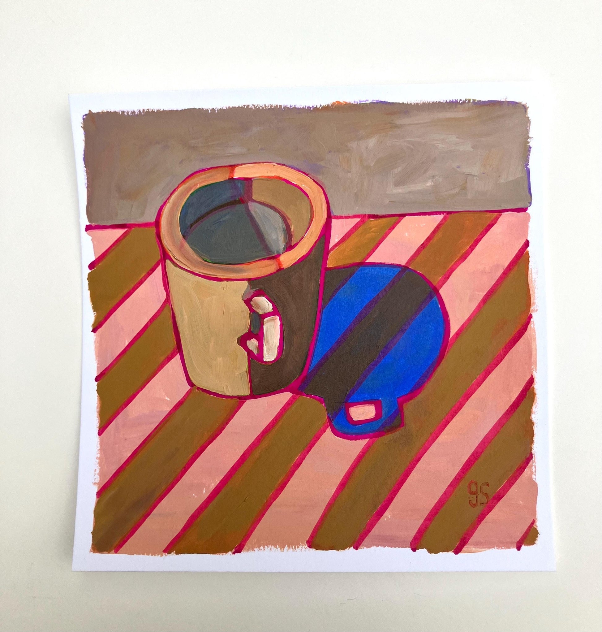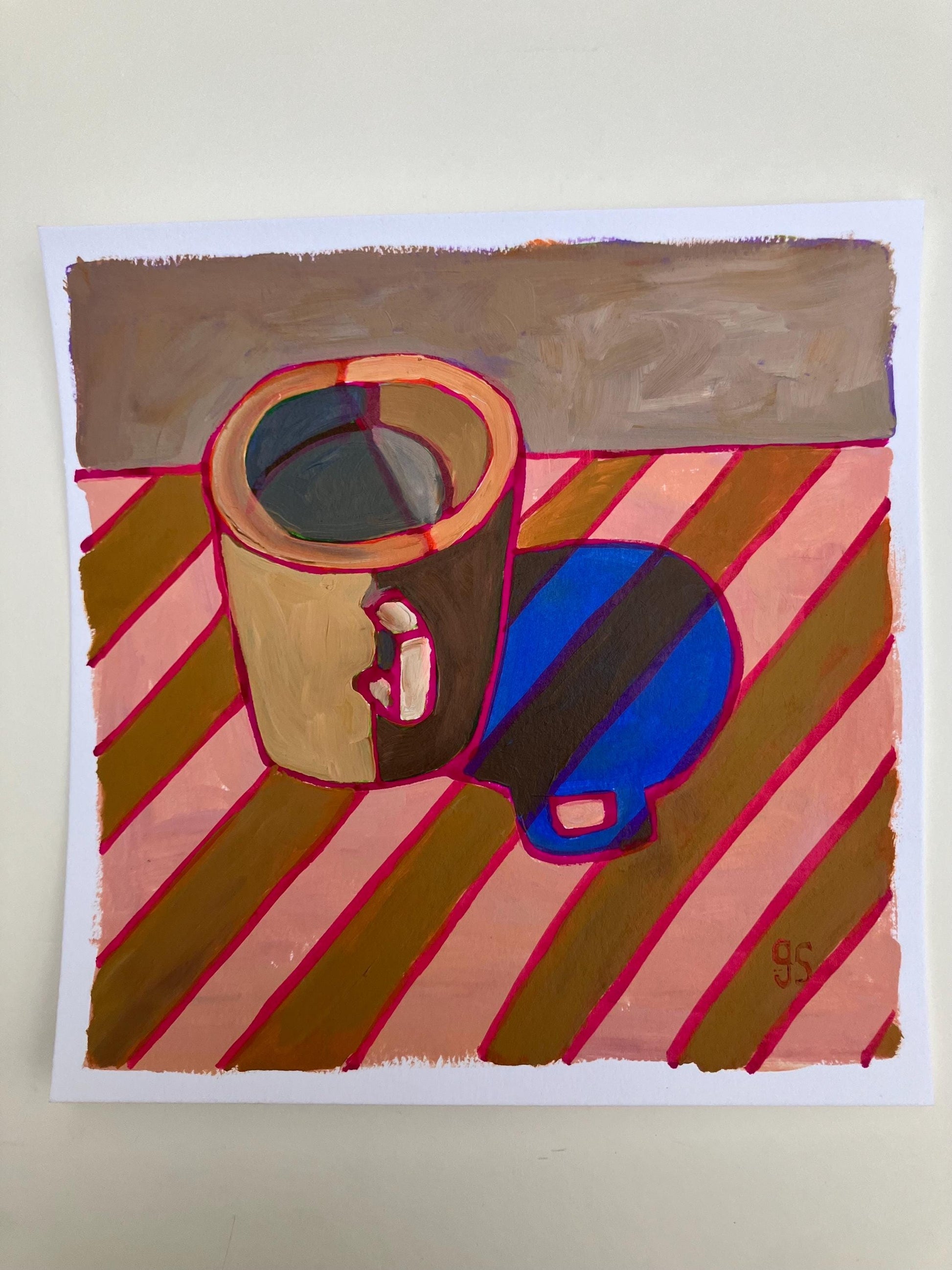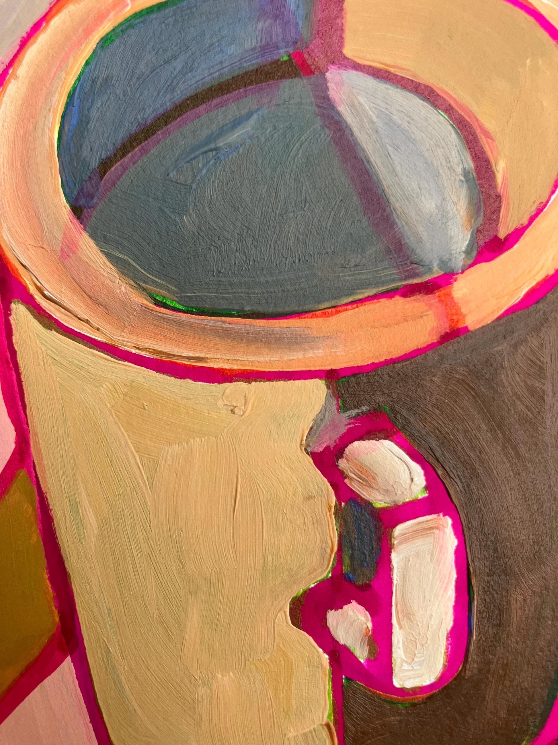 This original 8x8" acrylic painting of a coffee cup was painted in neutral colors with hot pink highlights. This piece features short brushstrokes and neutral colors. This original painting is nicely textured. The paper was recycled from a linocut print, giving it a unique texture. This piece is an original, texture abound! Ready to be framed.