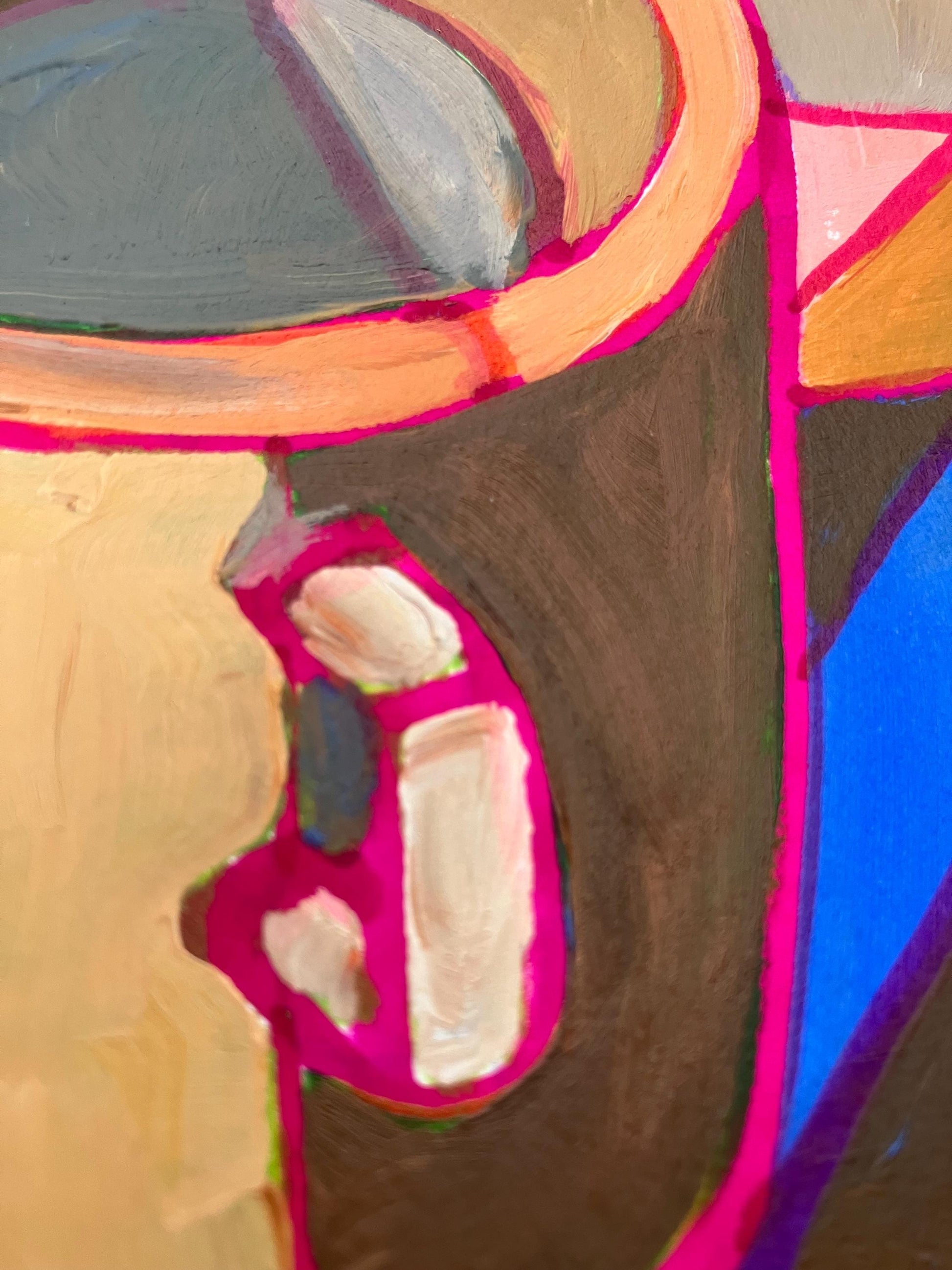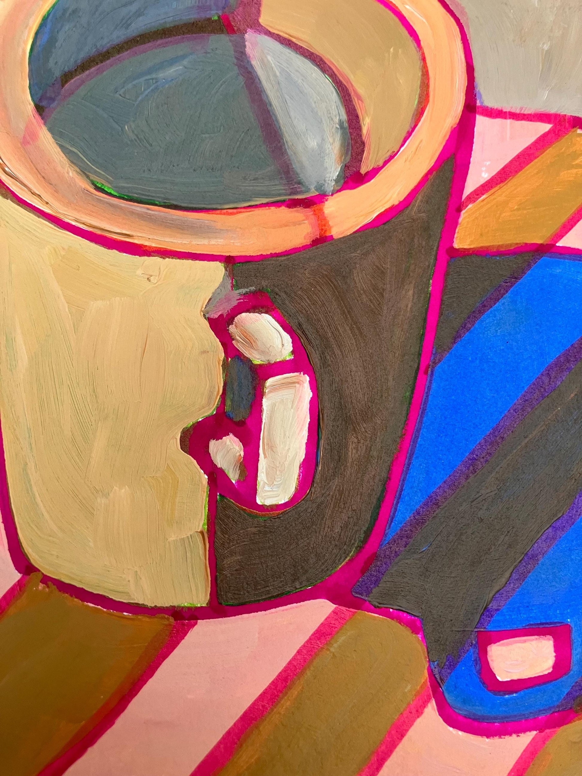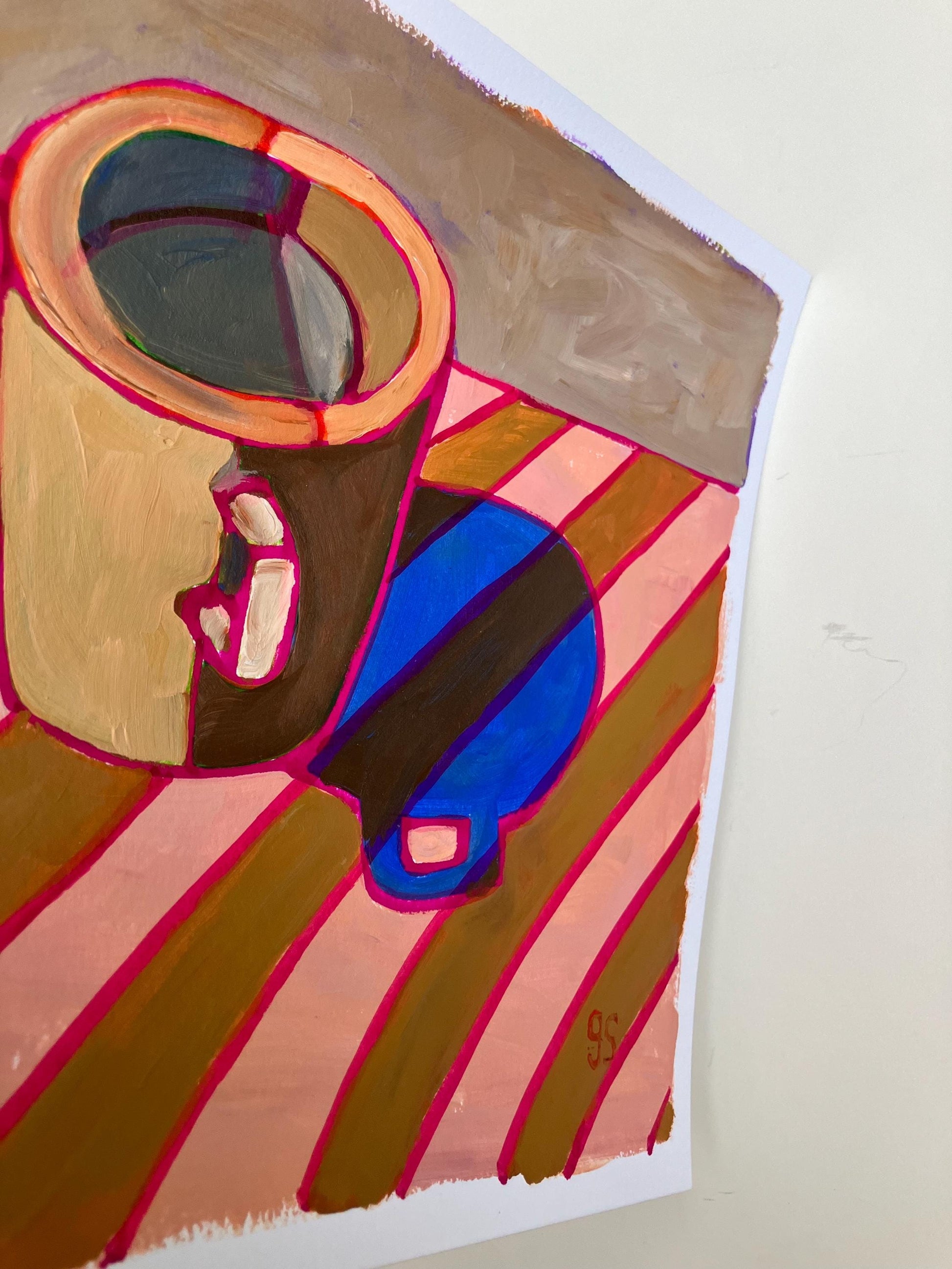 This original 8x8" acrylic painting of a coffee cup was painted in neutral colors with hot pink highlights. This piece features short brushstrokes and neutral colors. This original painting is nicely textured. The paper was recycled from a linocut print, giving it a unique texture. This piece is an original, texture abound! Ready to be framed.