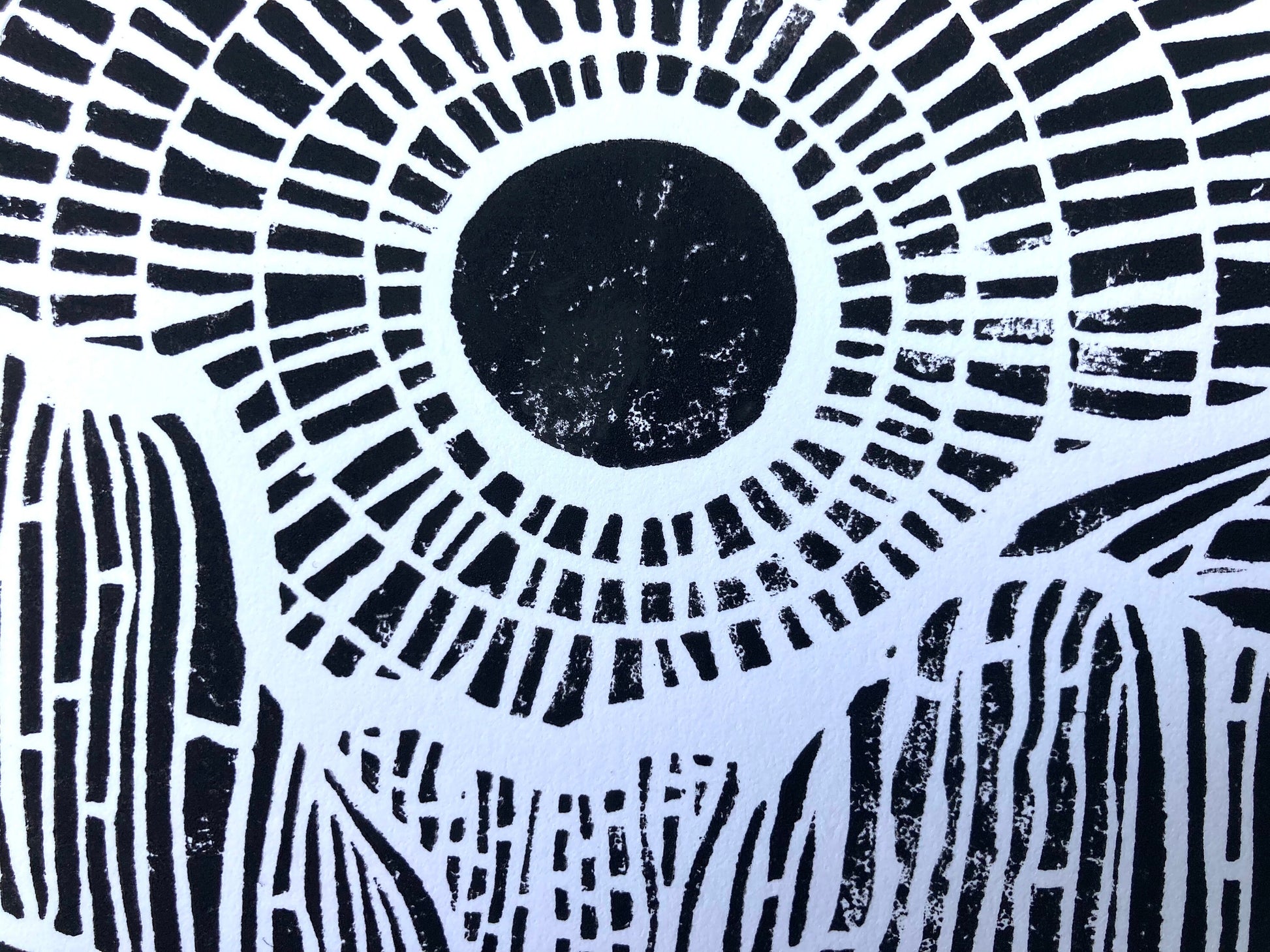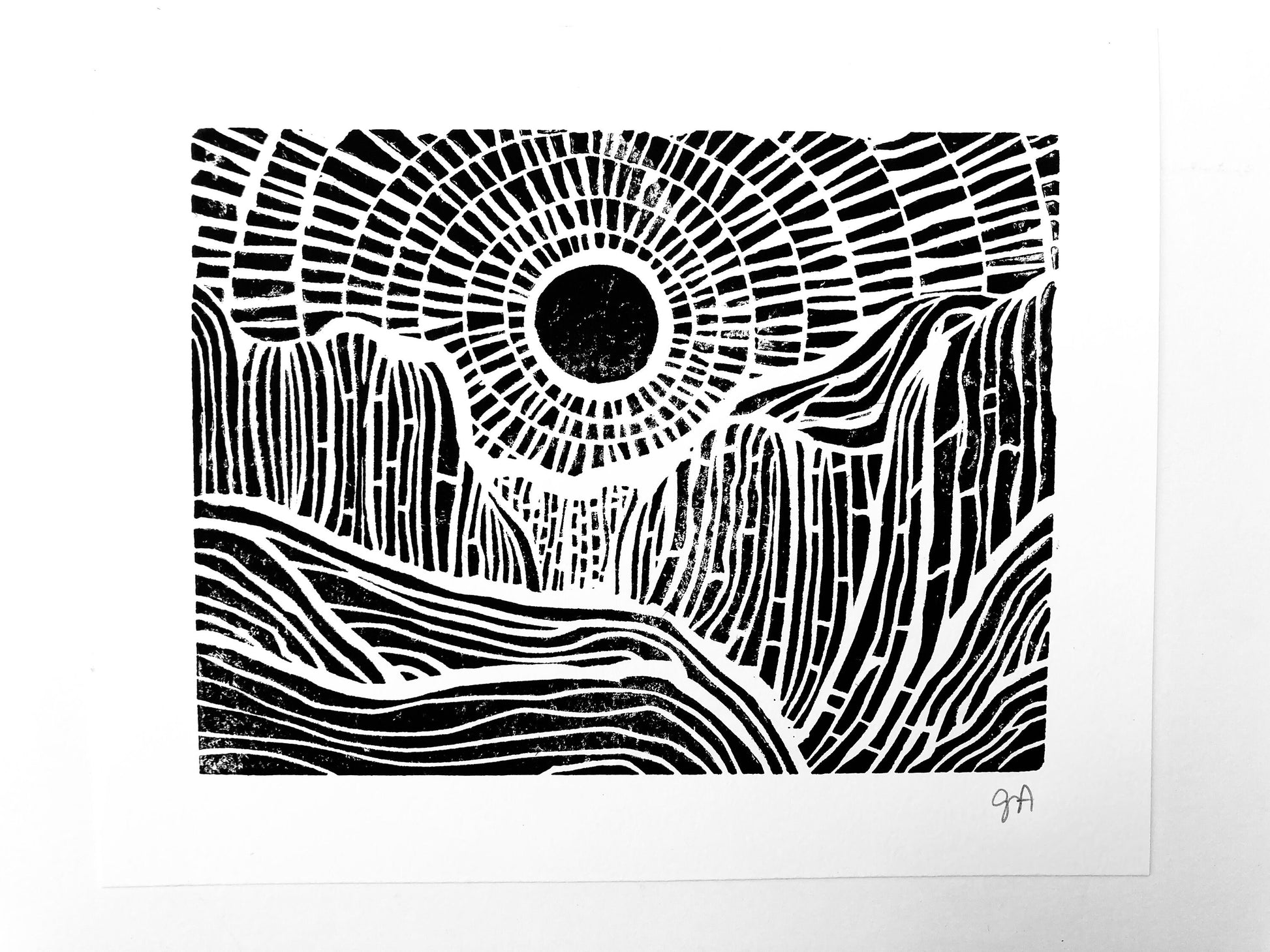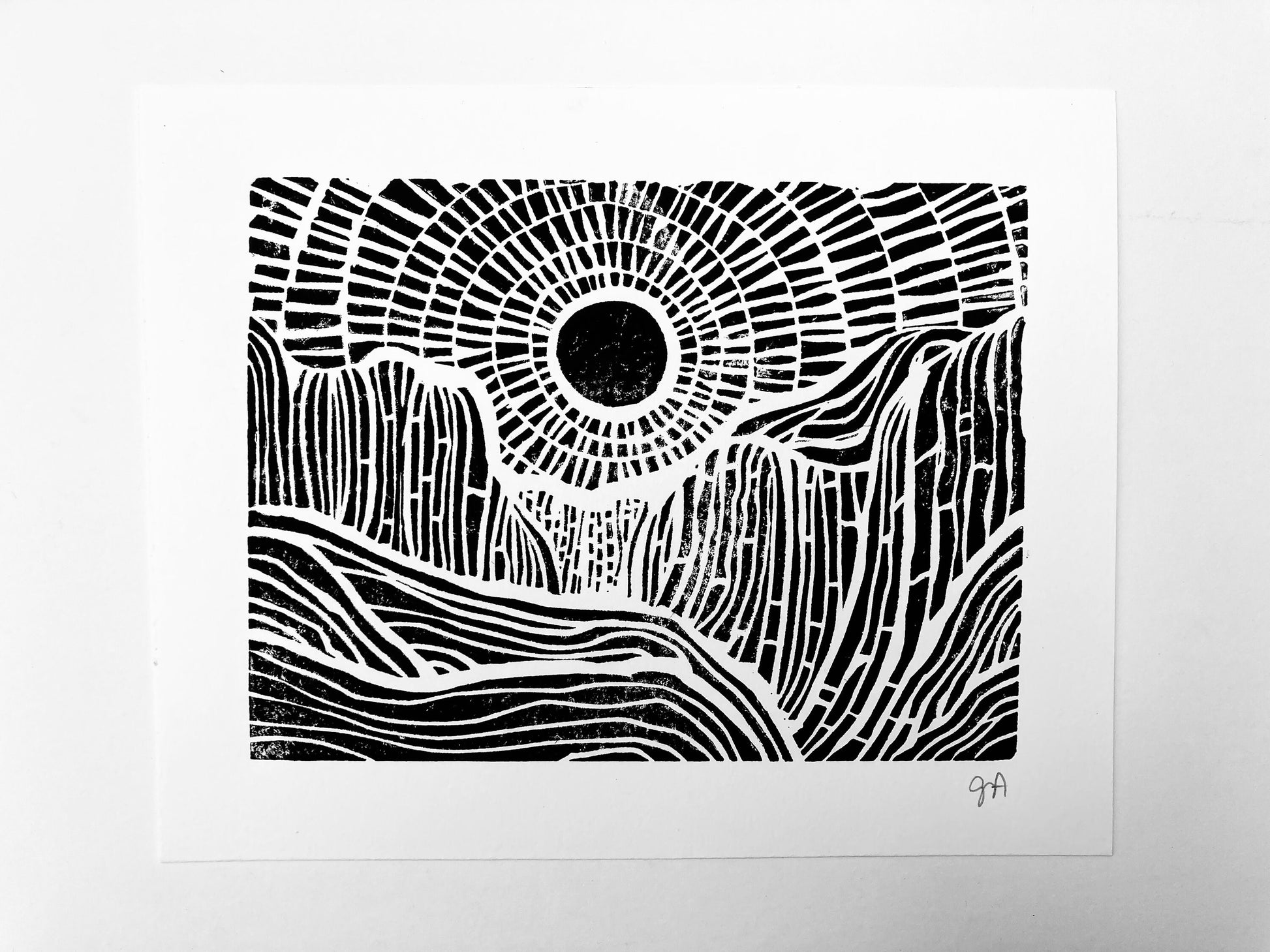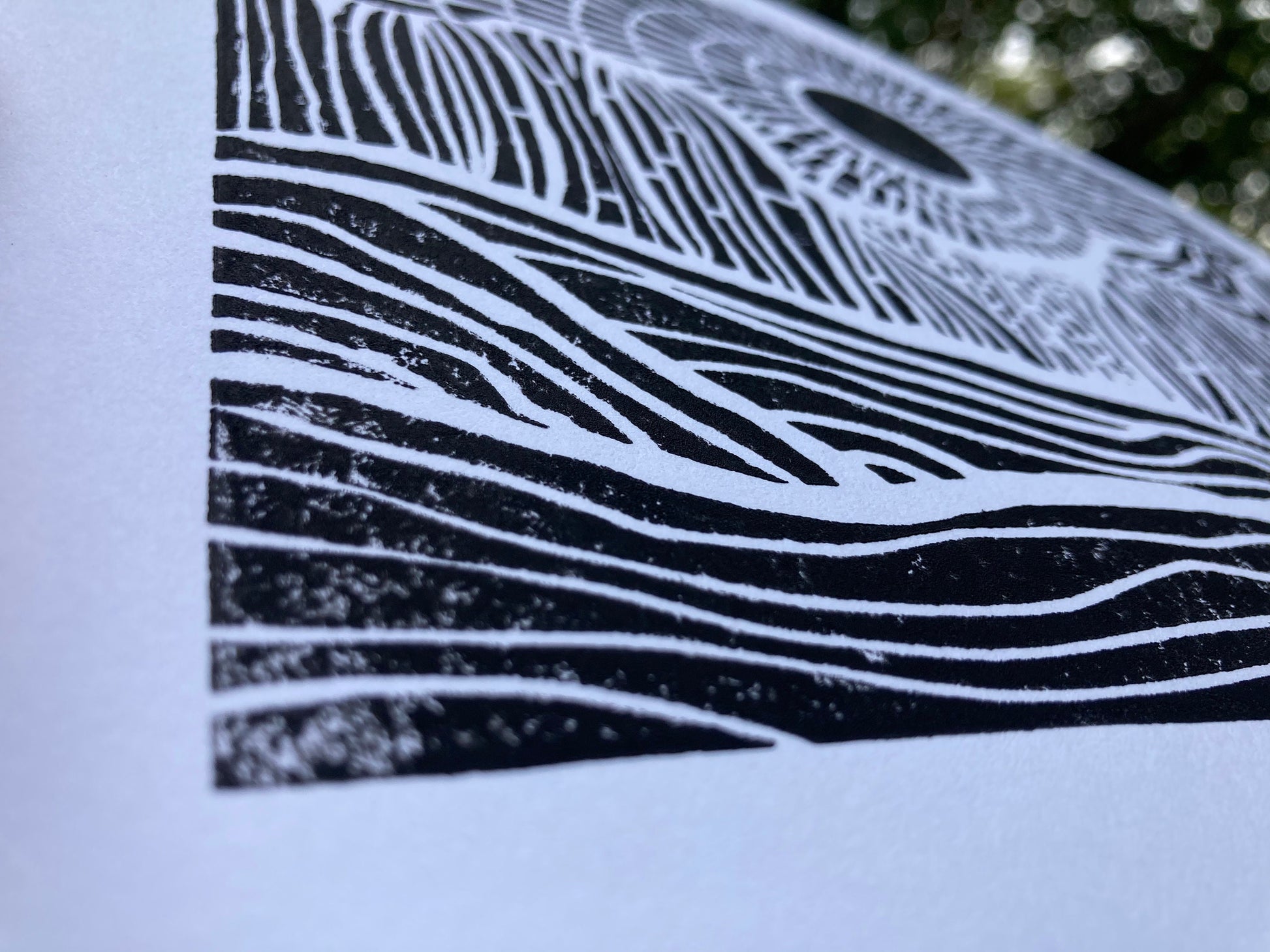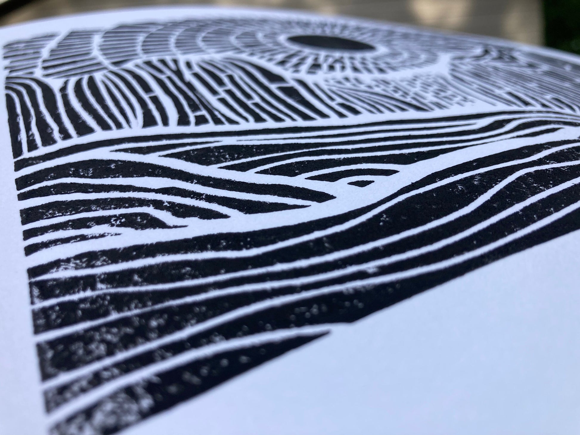 This original, hand-pulled landscape linocut was hand-pressed in black on gorgeous letterpress paper. The linoleum block is cut by hand, inked, then printed individually. Due to the printing process (which is done entirely by hand), there will be variations from print to print. All materials are archival.
