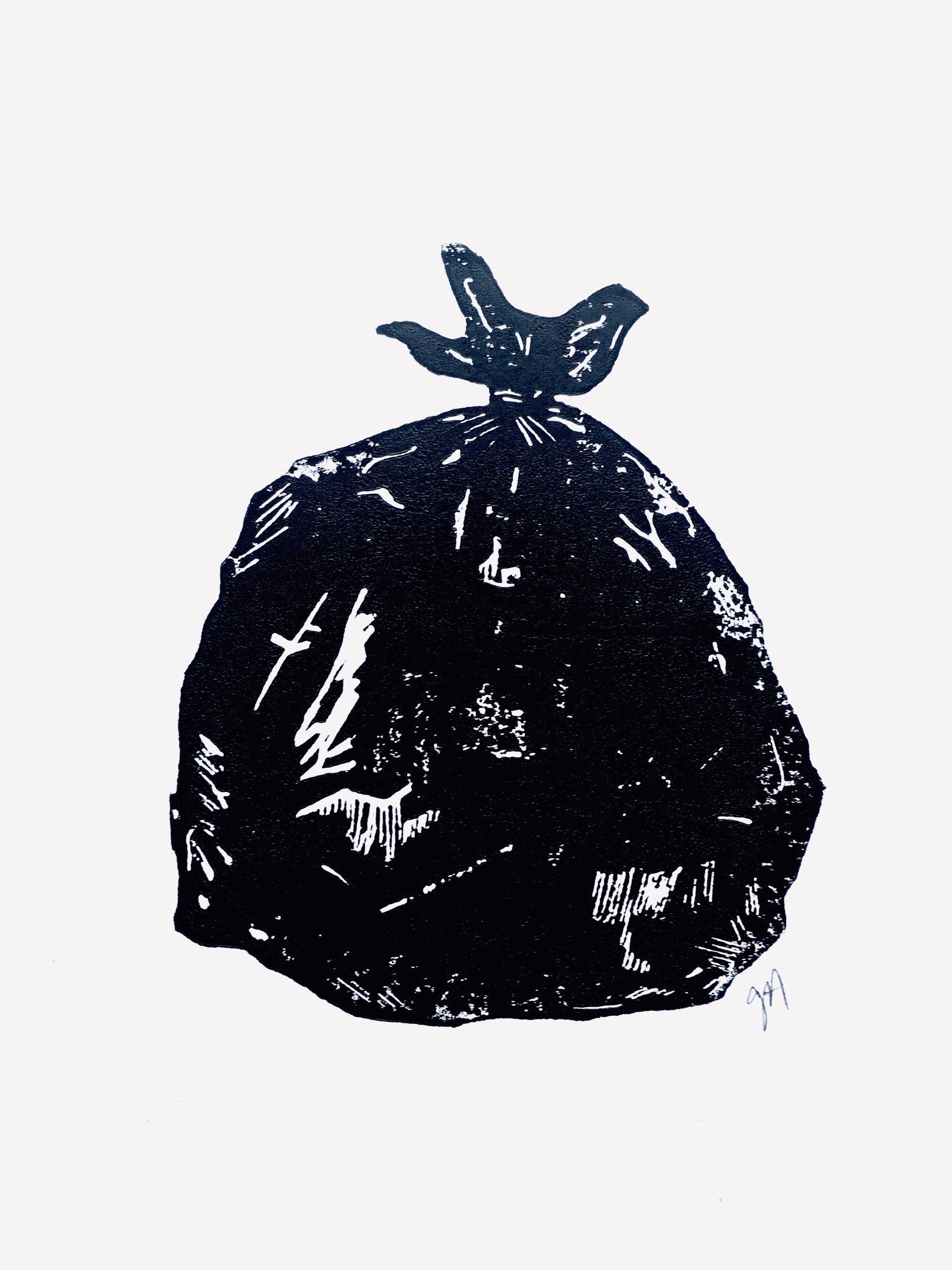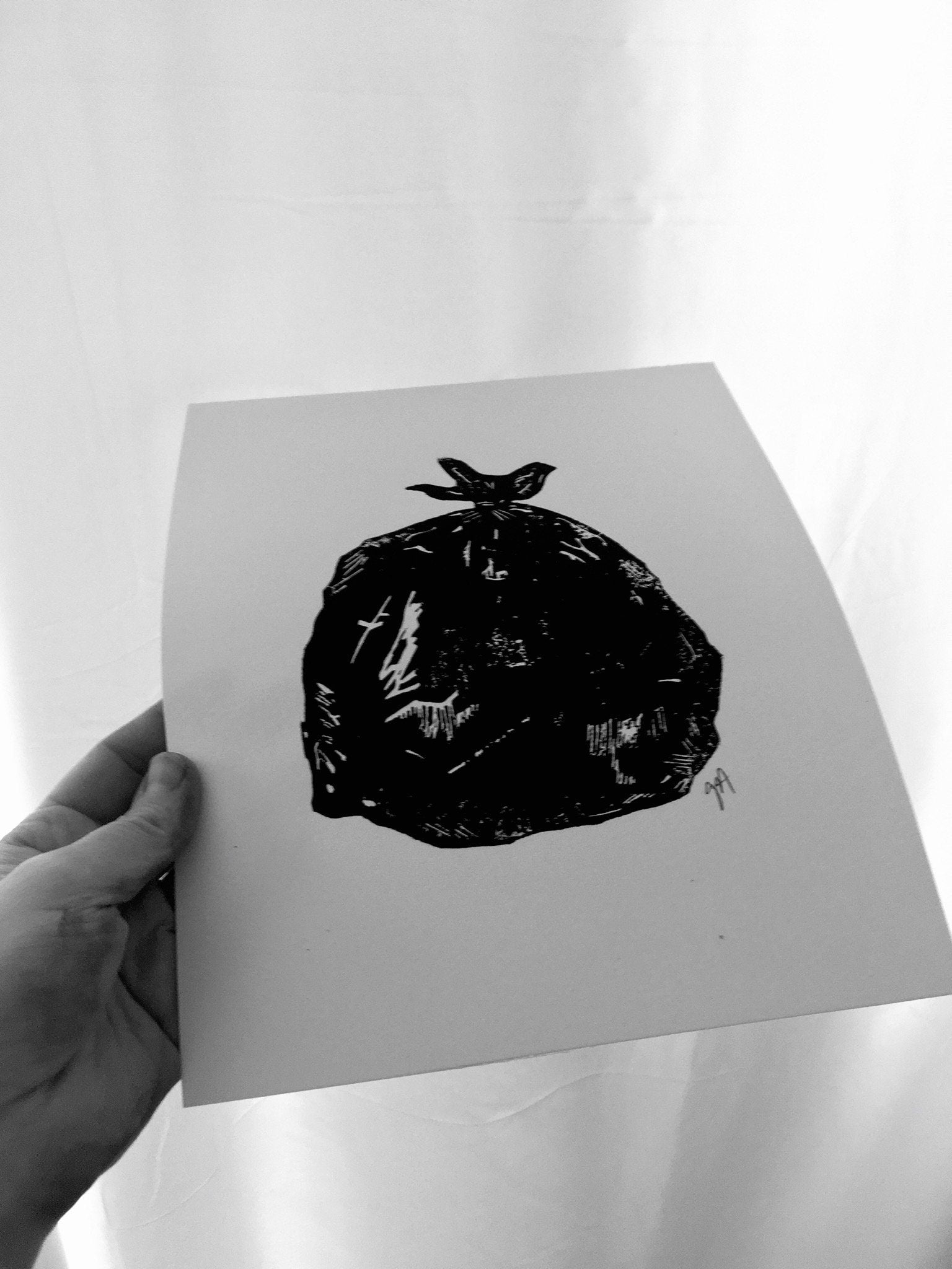 LINOCUT - Bag of trash - Hand-pressed linoleum block print (8x10in)