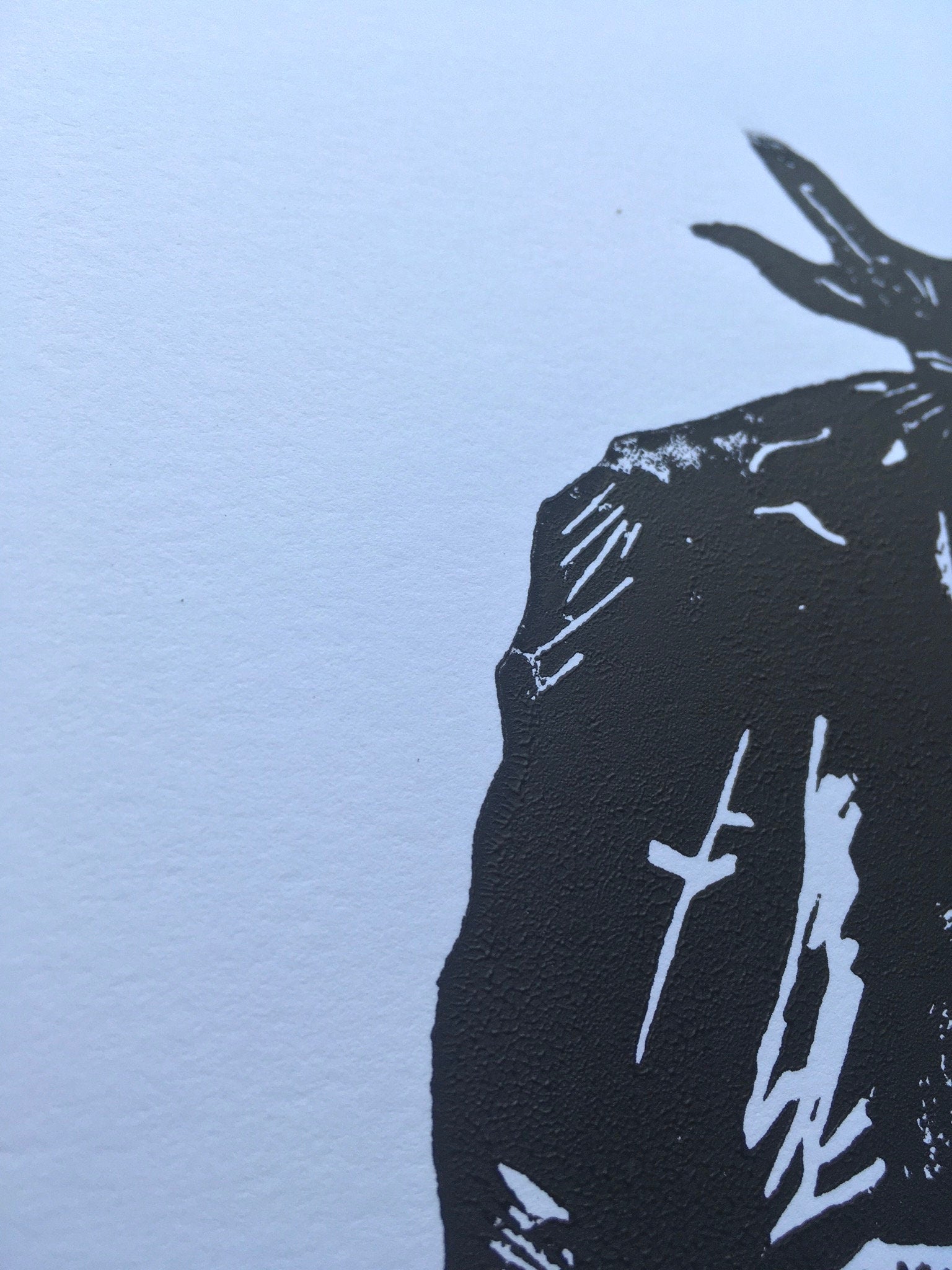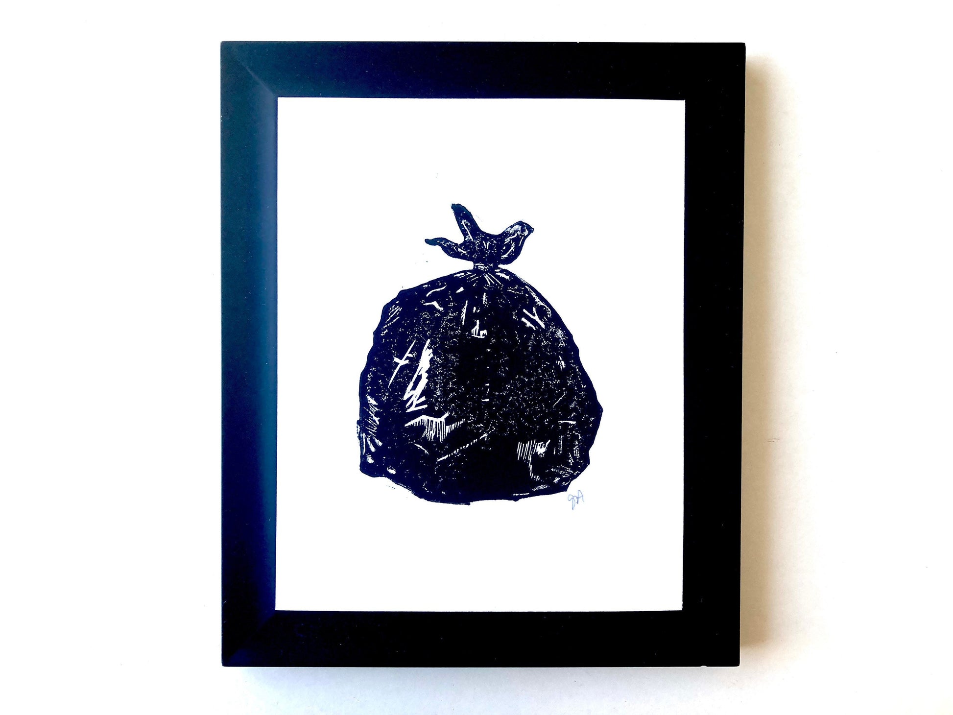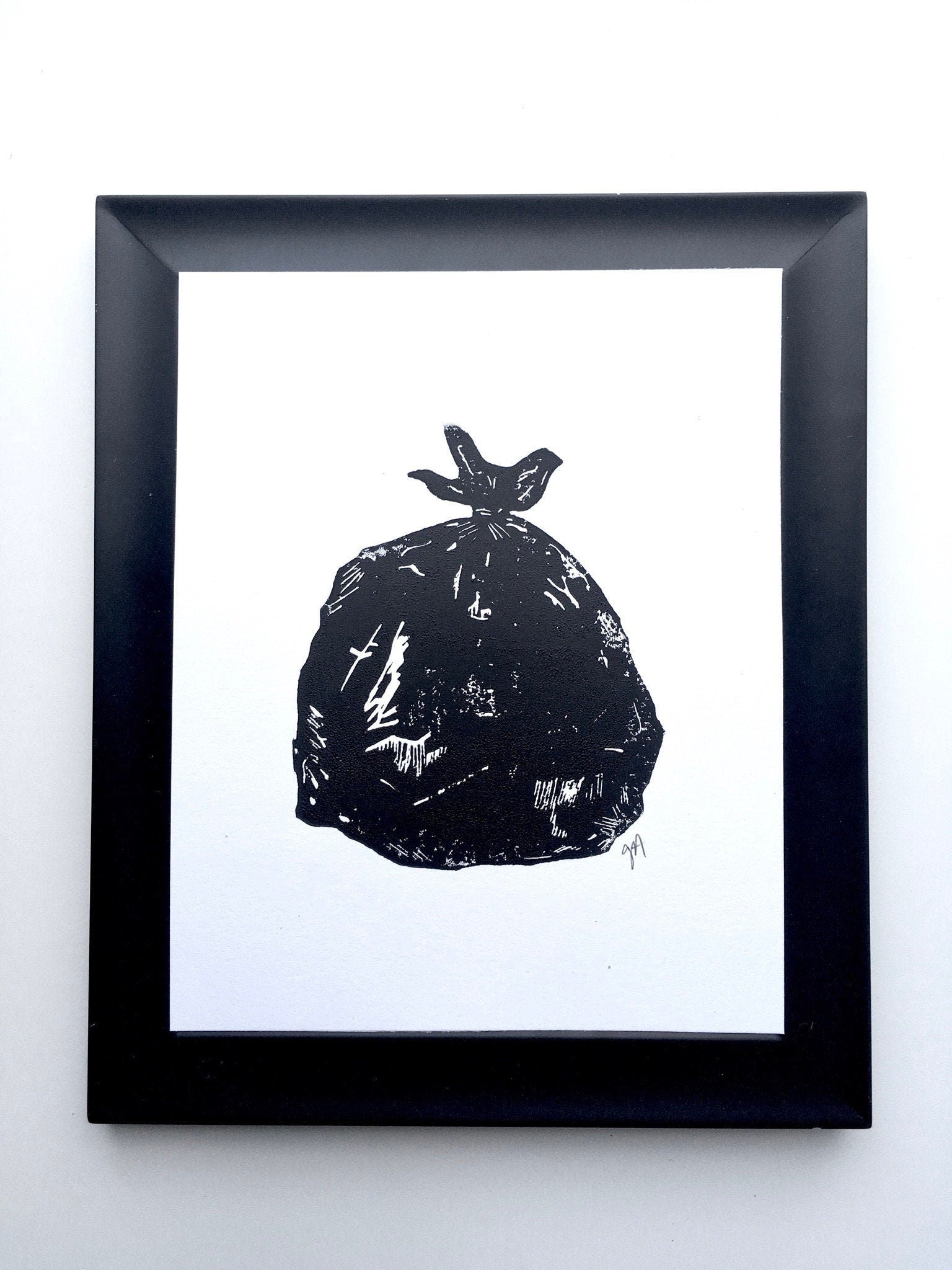 This open-edition, hand-pressed linoleum block poster of a trash bag was printed in black on thick cotton letterpress paper. The linoleum block is cut by hand, inked, then each linoprint is pressed individually. Due to the printmaking process (which is done entirely by hand), there will be variations from print to print giving you an original and unique piece of artwork! All materials are archival.