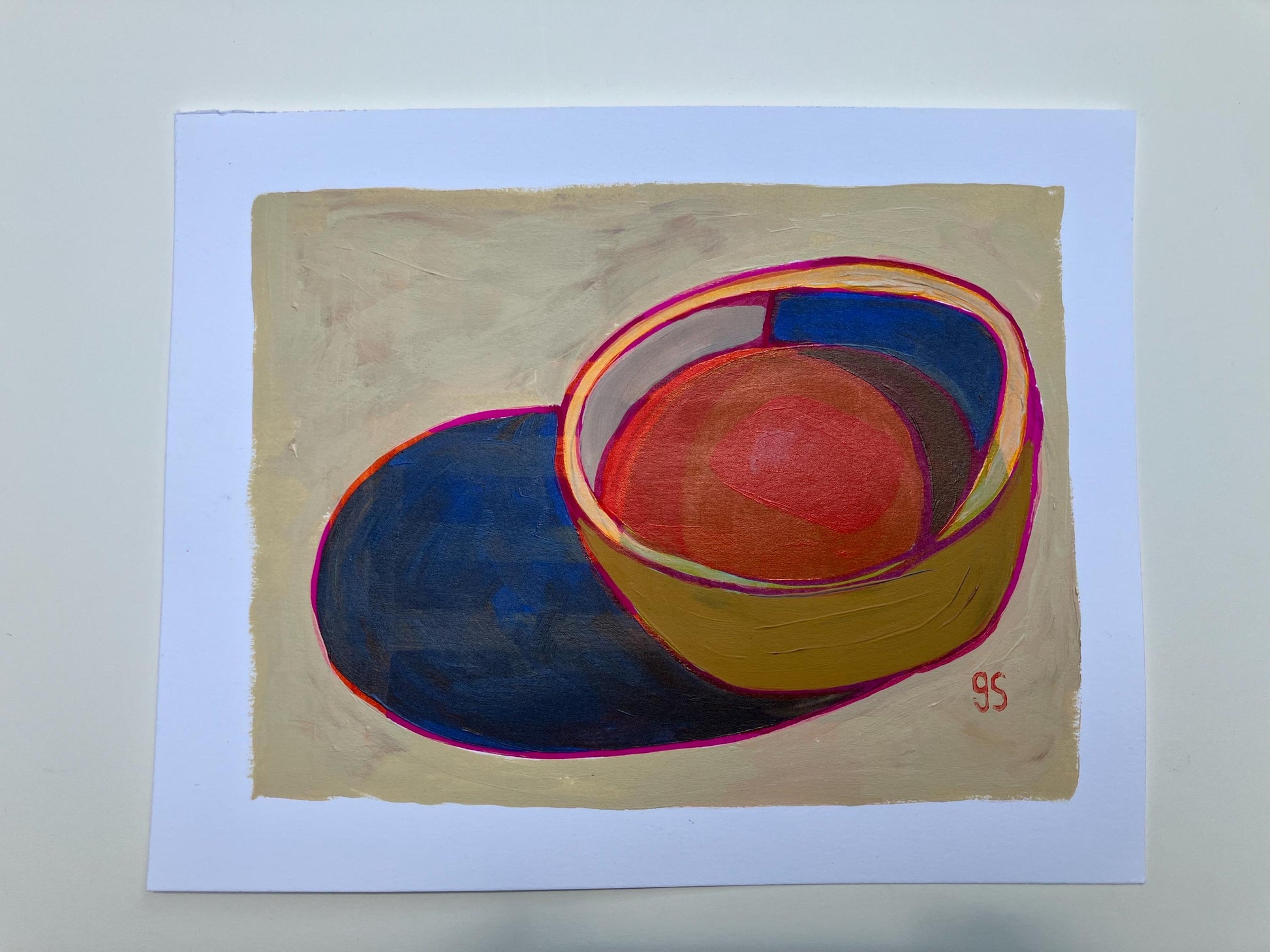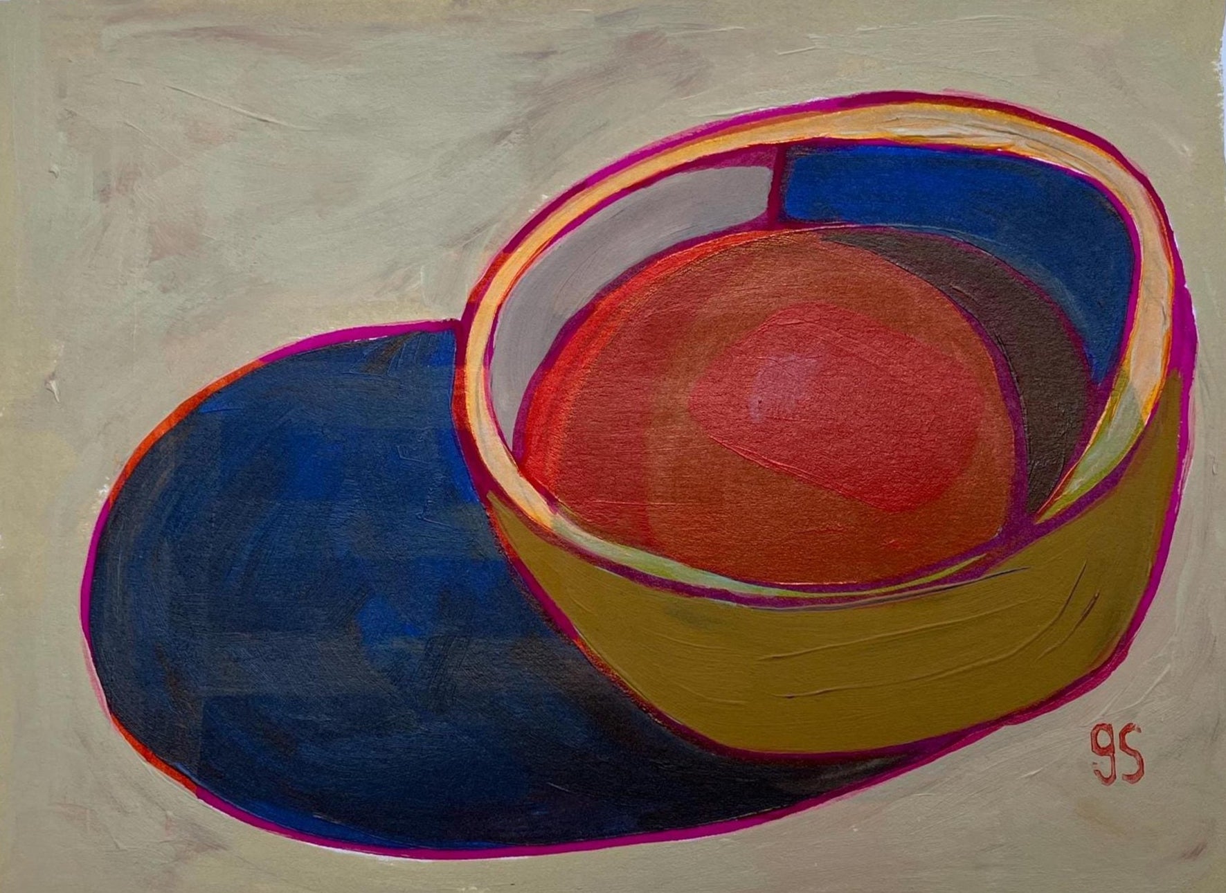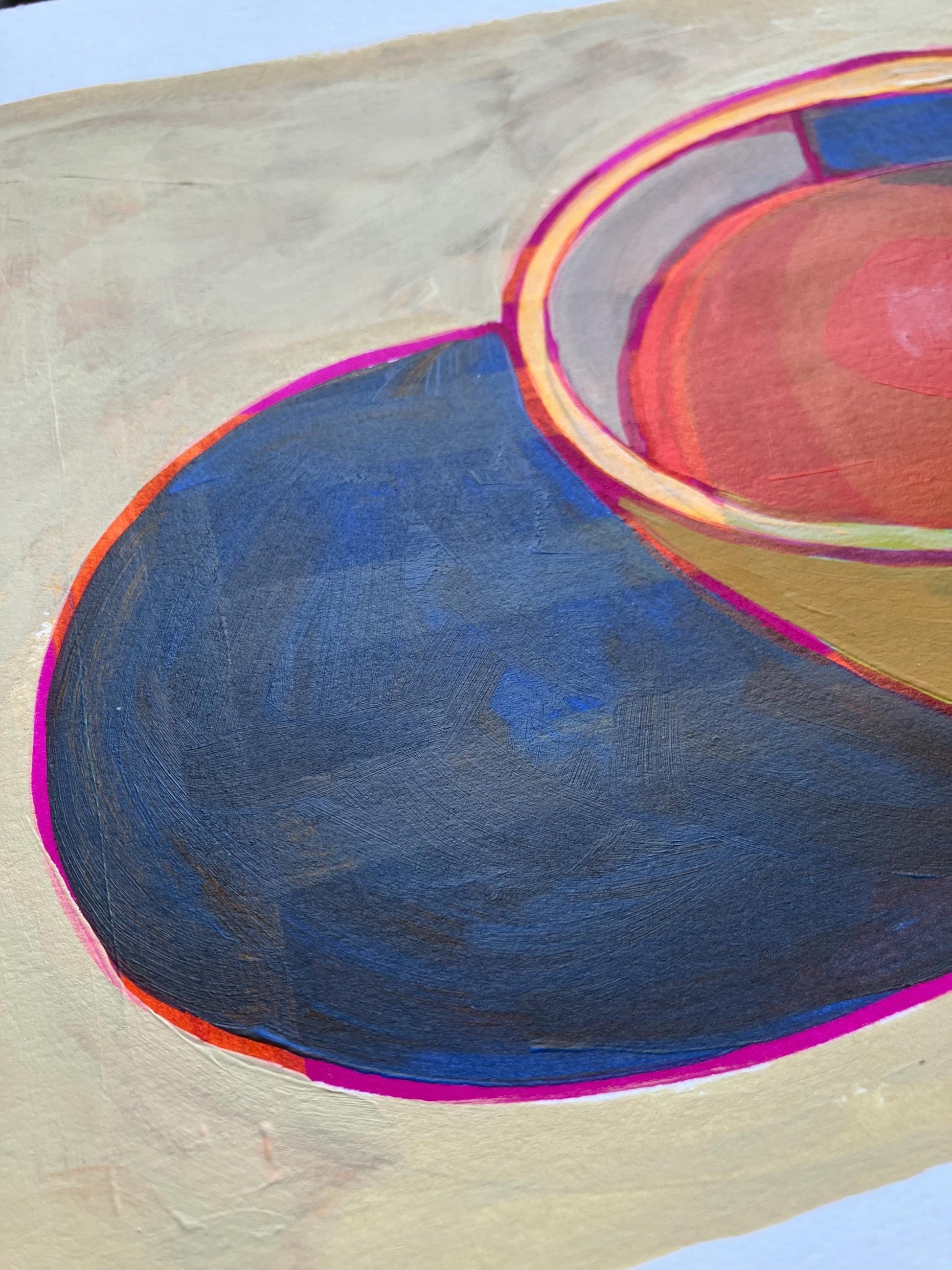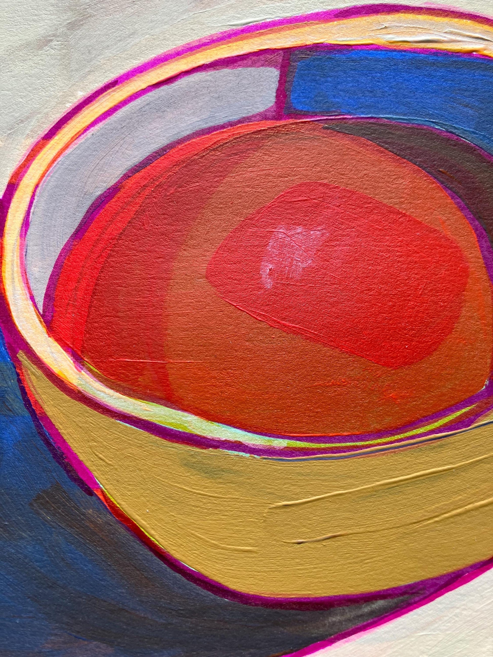 This original 8x10" abstract acrylic painting of a bowl of soup was painted in muted colors with pink highlights onto thick cotton paper. This piece features short brushstrokes and neutral colors. This original painting is nicely textured. The paper was recycled from a linocut print, giving it a unique texture. This piece is an original, texture abound!