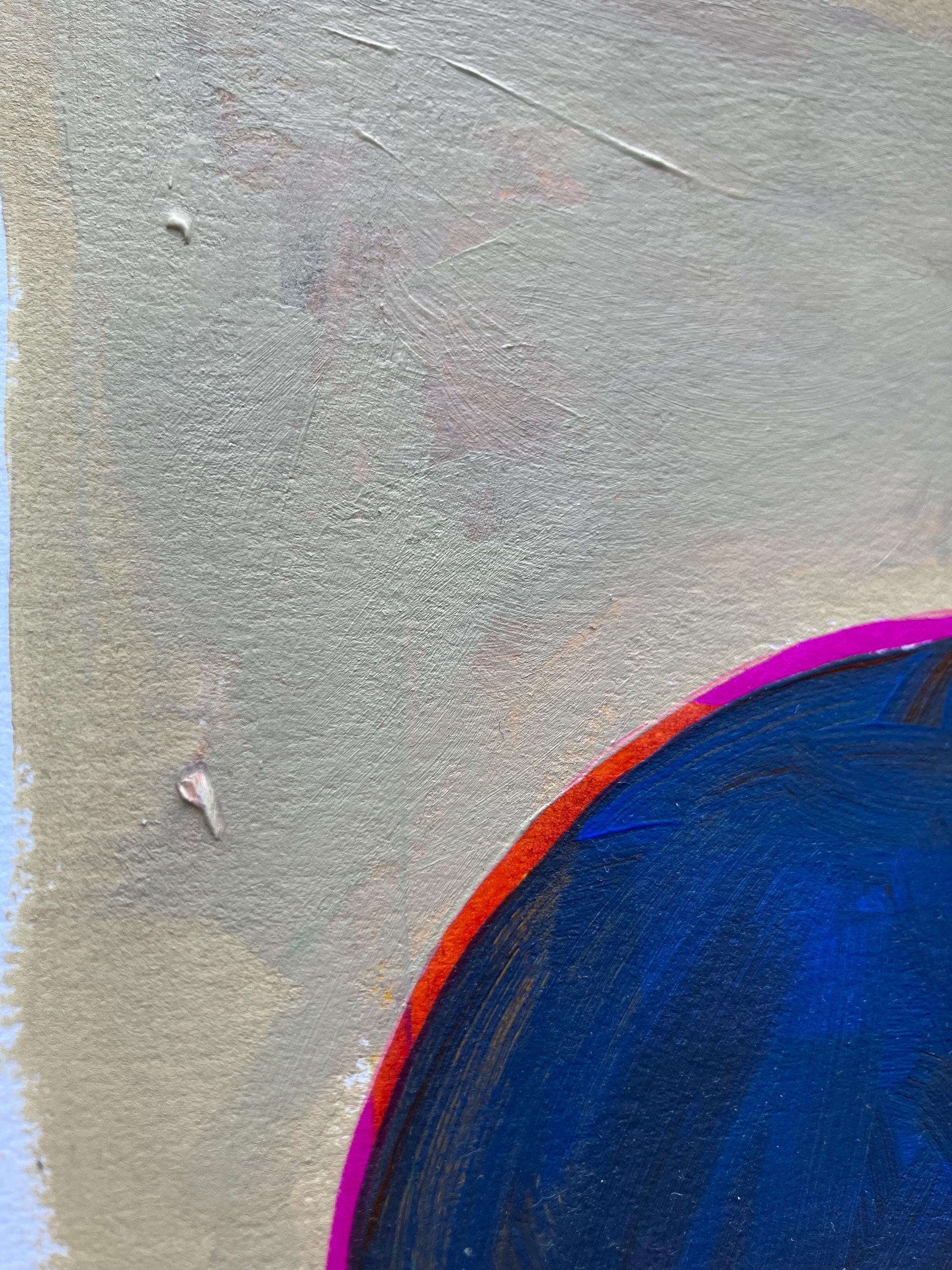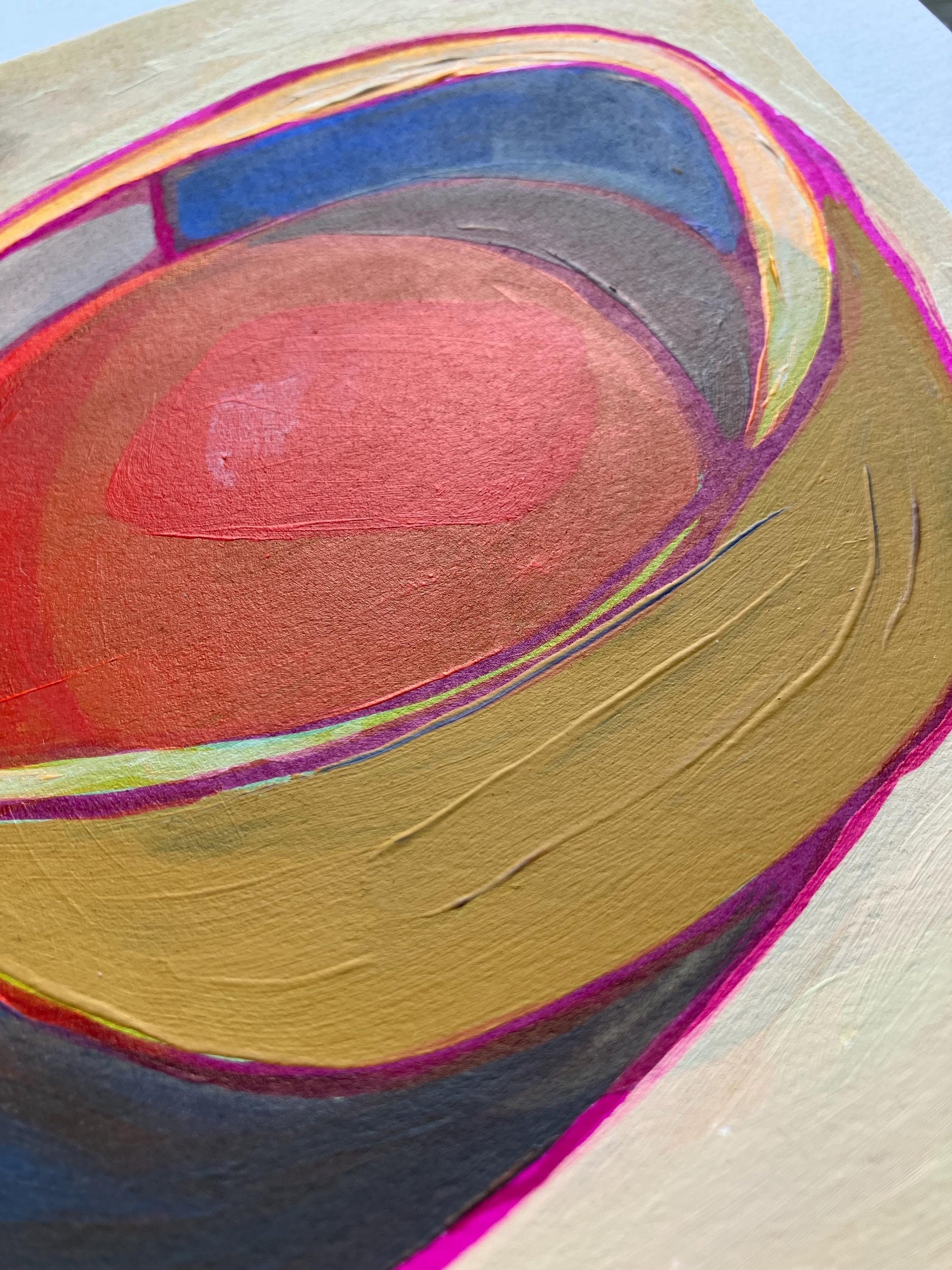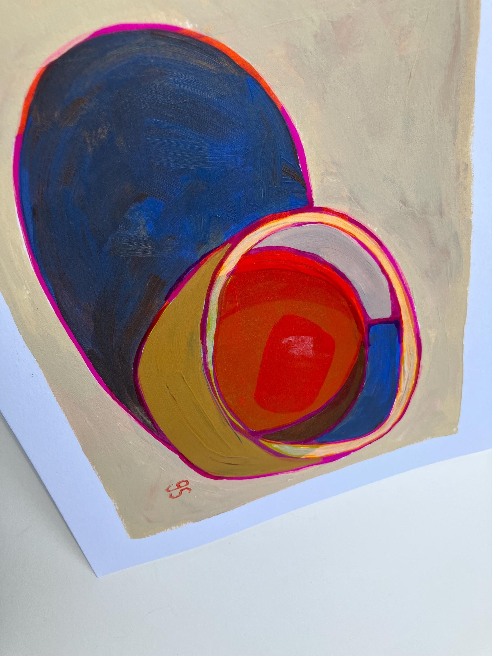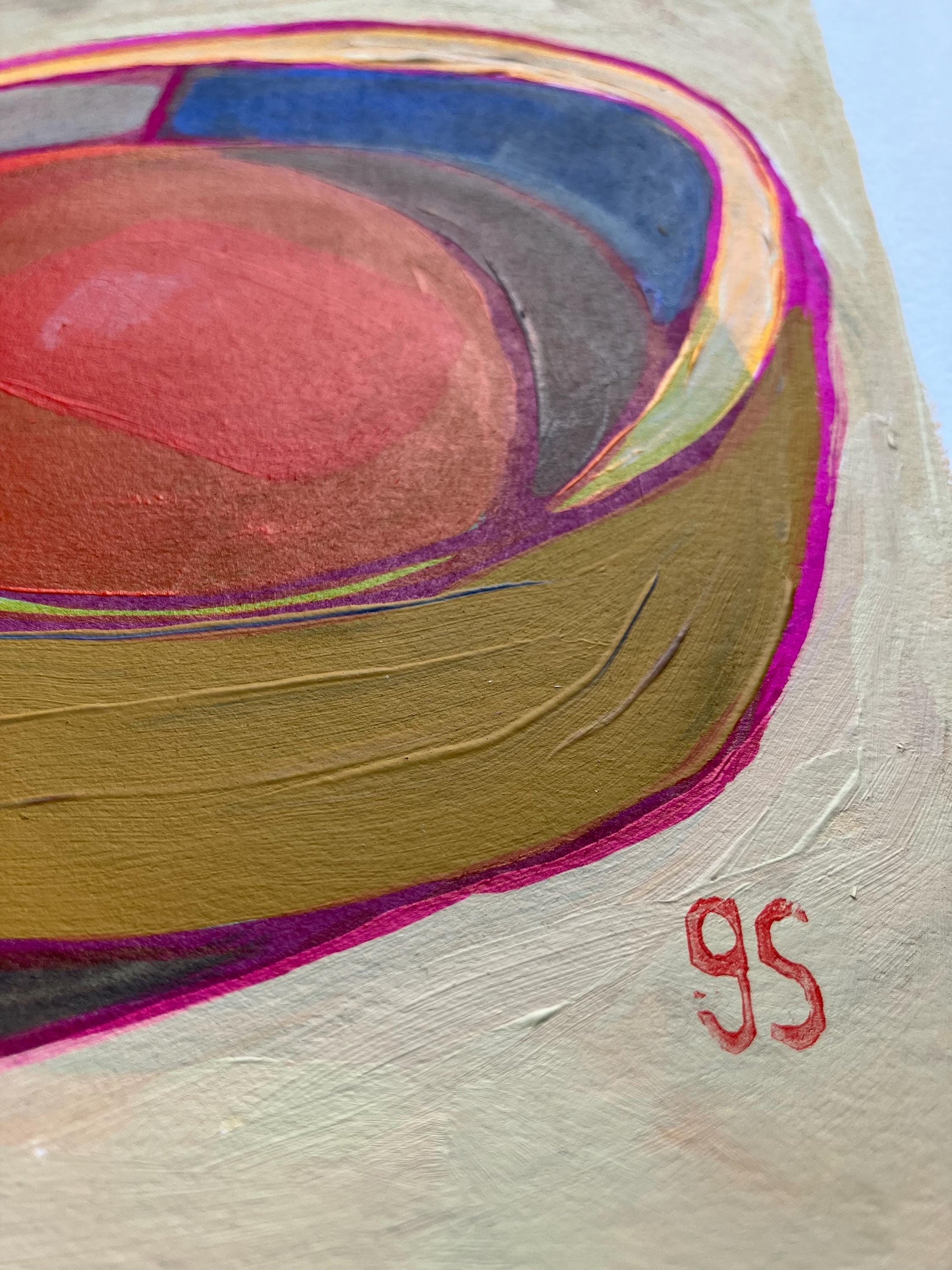 This original 8x10" abstract acrylic painting of a bowl of soup was painted in muted colors with pink highlights onto thick cotton paper. This piece features short brushstrokes and neutral colors. This original painting is nicely textured. The paper was recycled from a linocut print, giving it a unique texture. This piece is an original, texture abound!